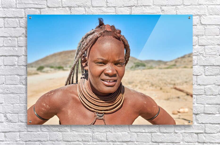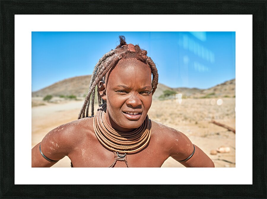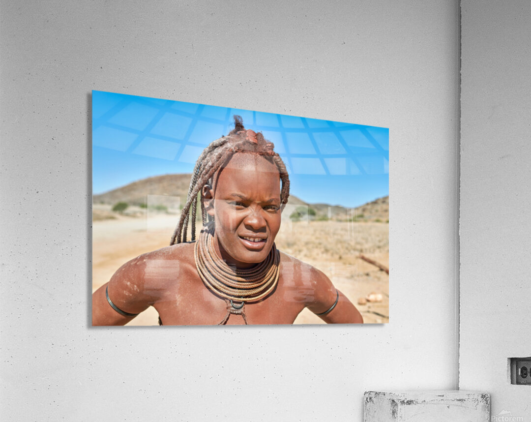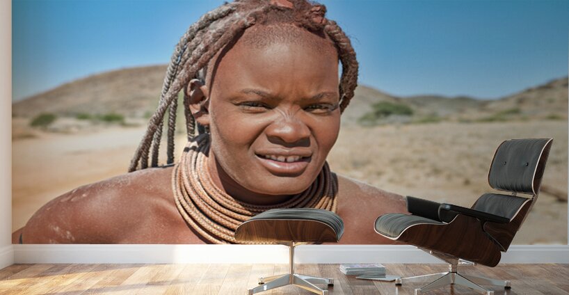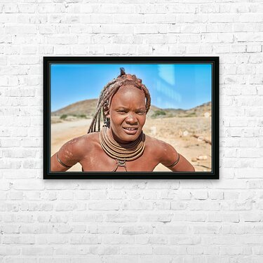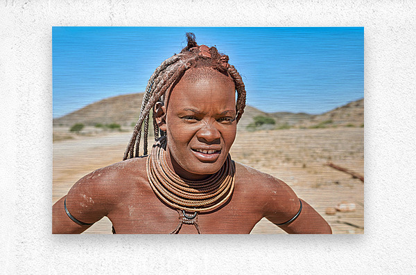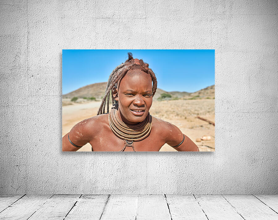 A Himba woman stands in the Kunene region of Namibia. She wears traditional jewelry and shows a strong expression against a dry landscape.