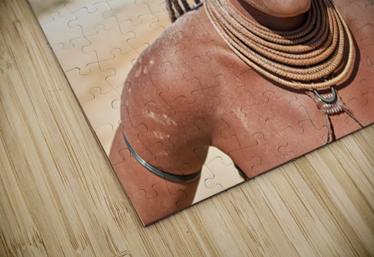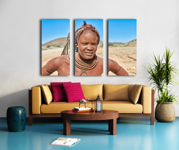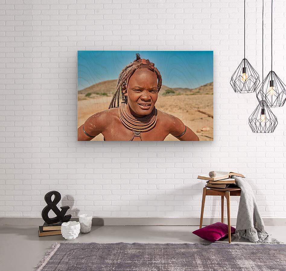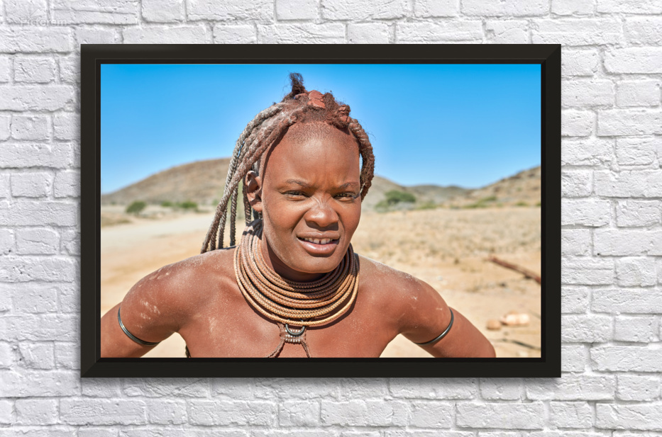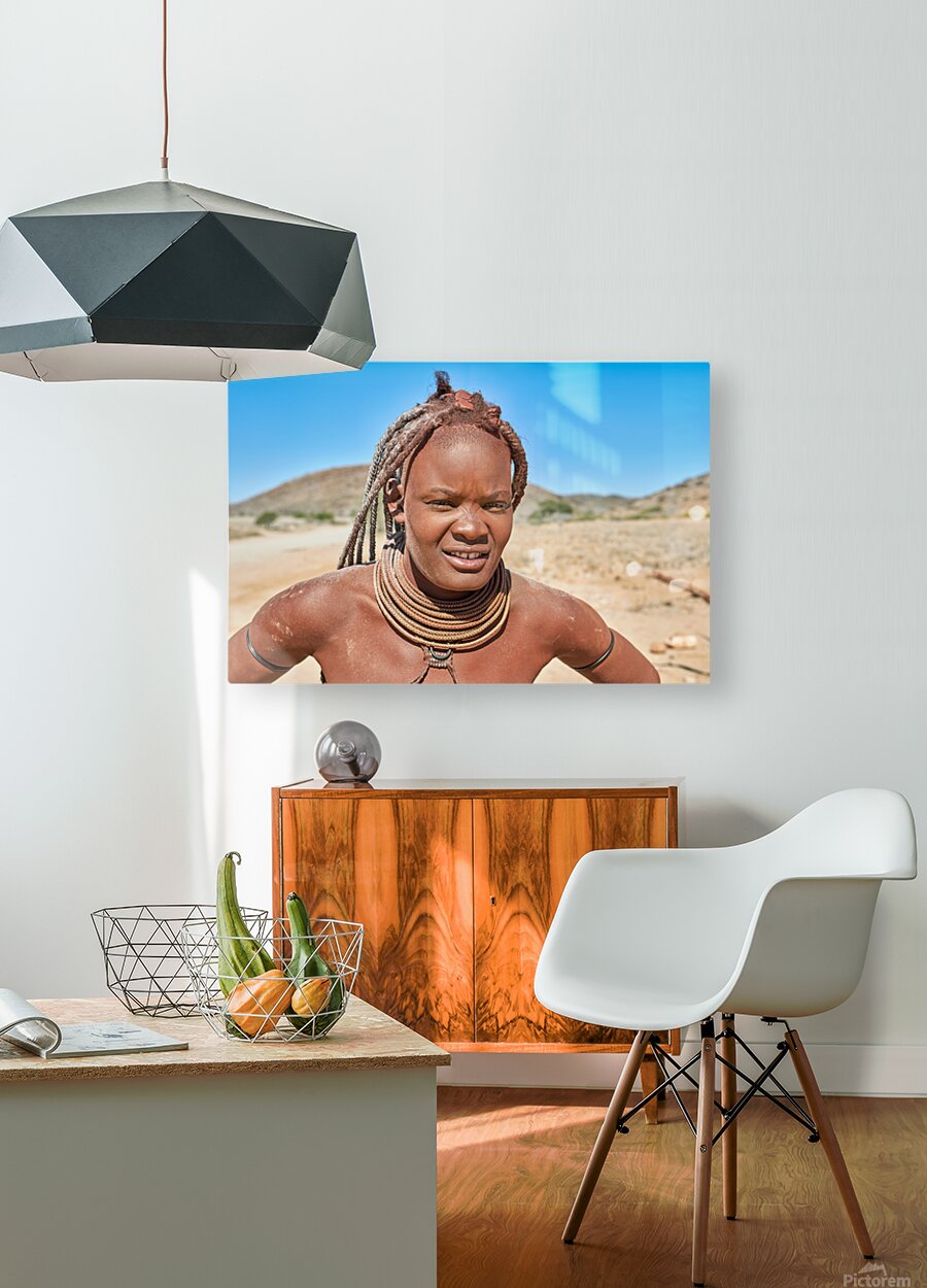 A Himba woman stands in the Kunene region of Namibia. She wears traditional jewelry and shows a strong expression against a dry landscape.