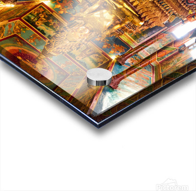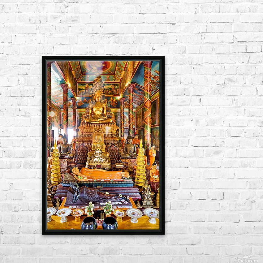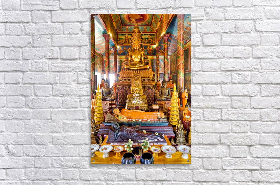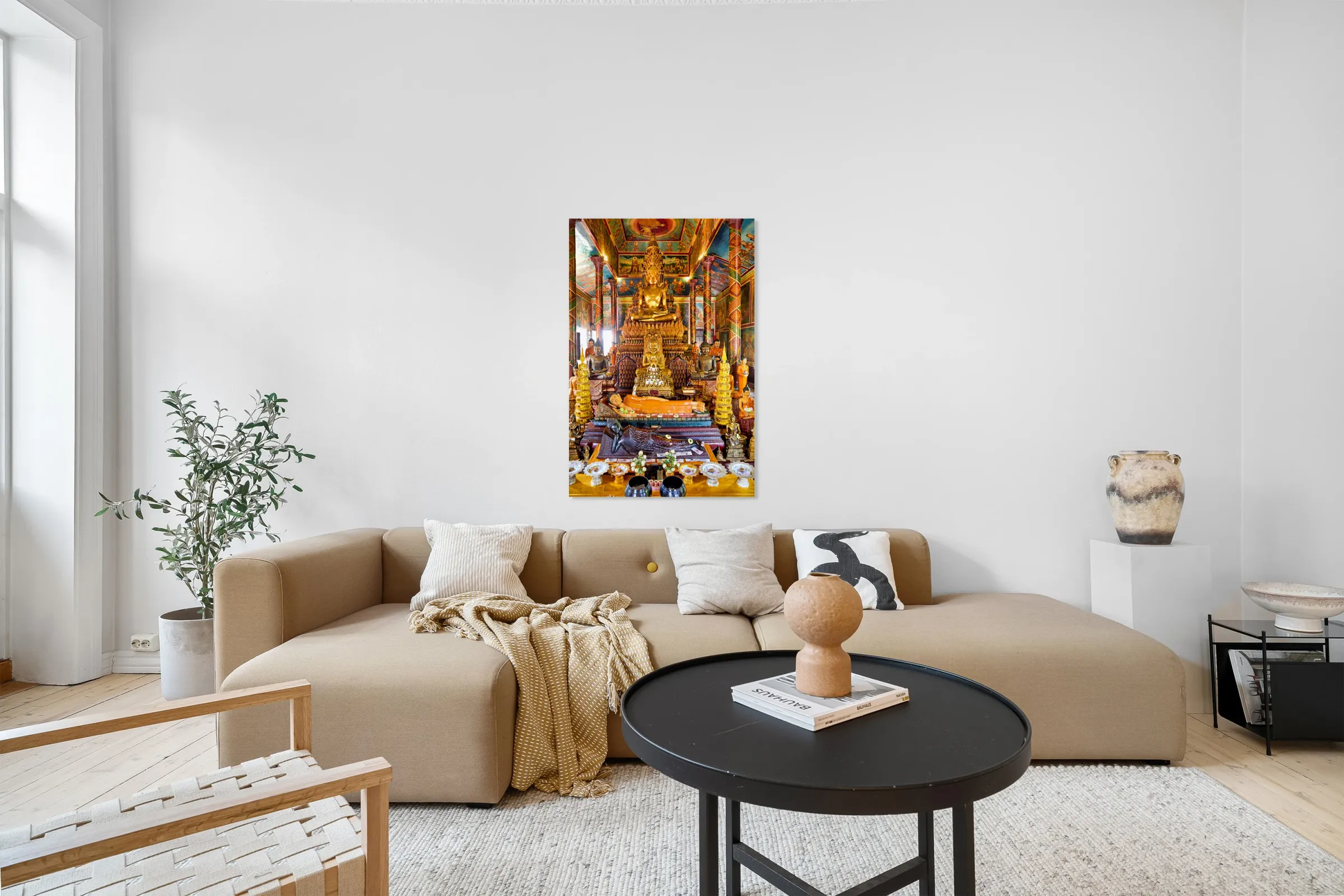 Golden Buddha statues and offerings in an ornate temple. Picture Frame Printing