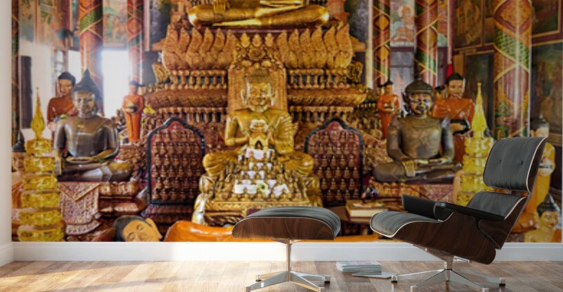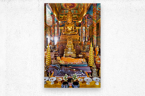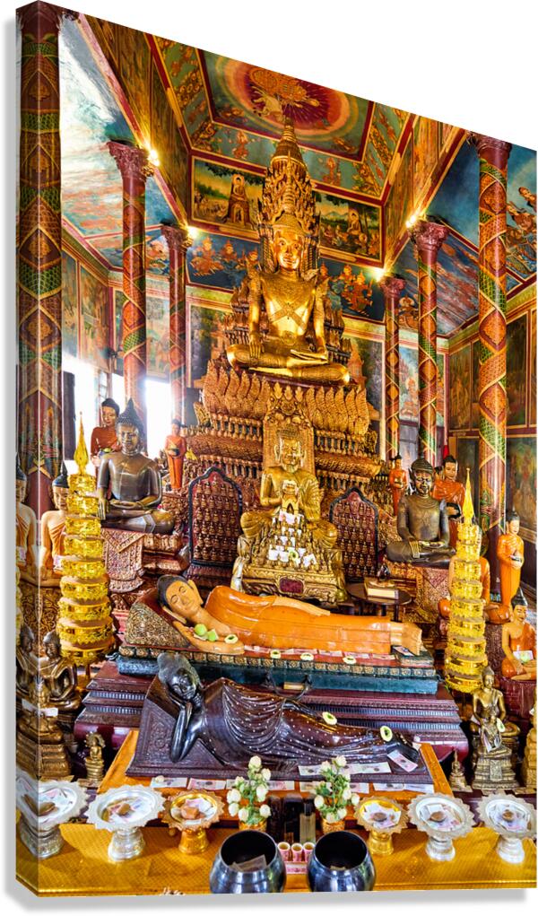 Inside a vibrant Buddhist temple multiple Buddha statues including golden seated and reclining figures are adorned with offerings reflecting devotion in Southeast Asia.