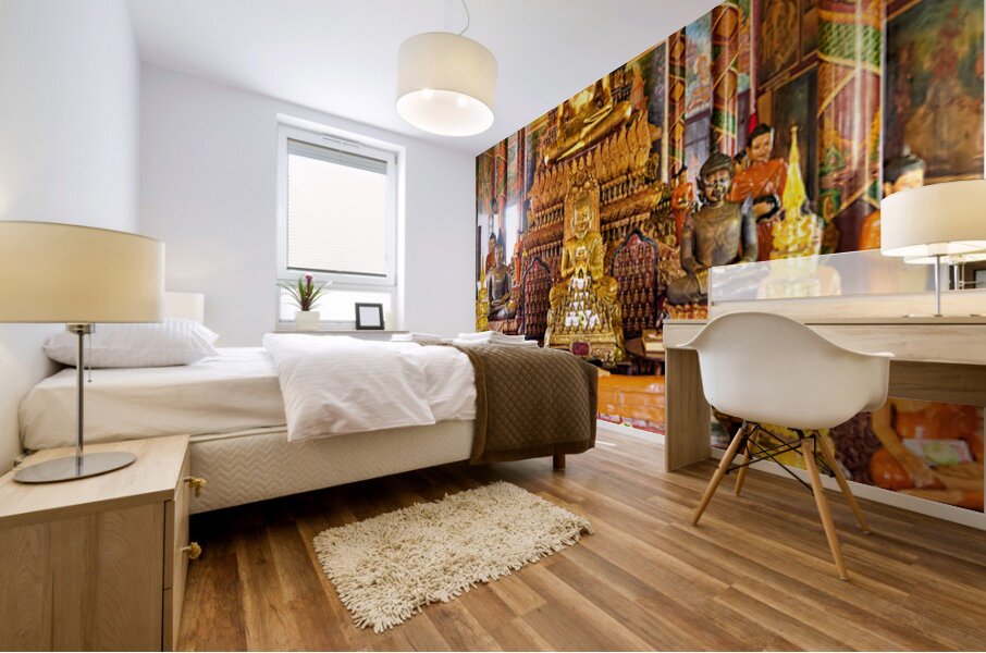 ABOUT THIS ARTWORK: GOLDEN BUDDHA STATUES AND OFFERINGS IN AN ORNATE TEMPLE.