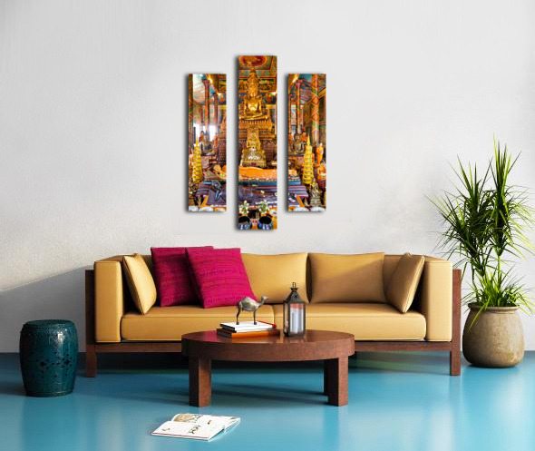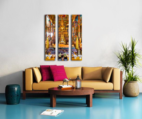 Golden Buddha statues and offerings in an ornate temple. Frame print