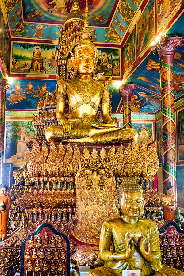 Golden Buddha statues and vibrant murals adorn a richly decorated Buddhist temple showcasing spiritual devotion and cultural artistry in Southeast Asia.