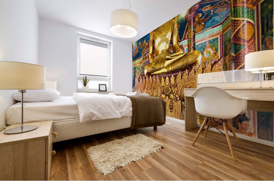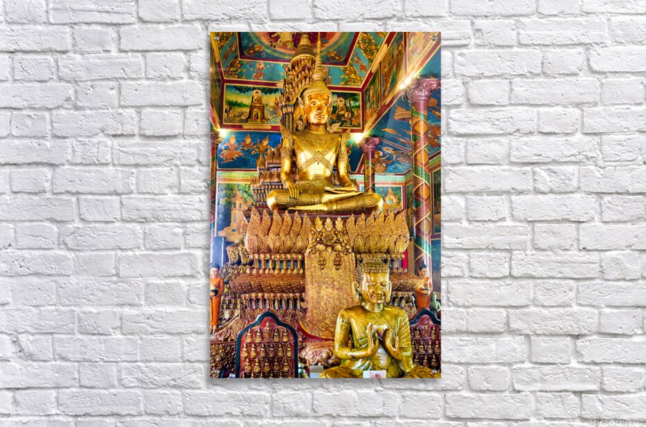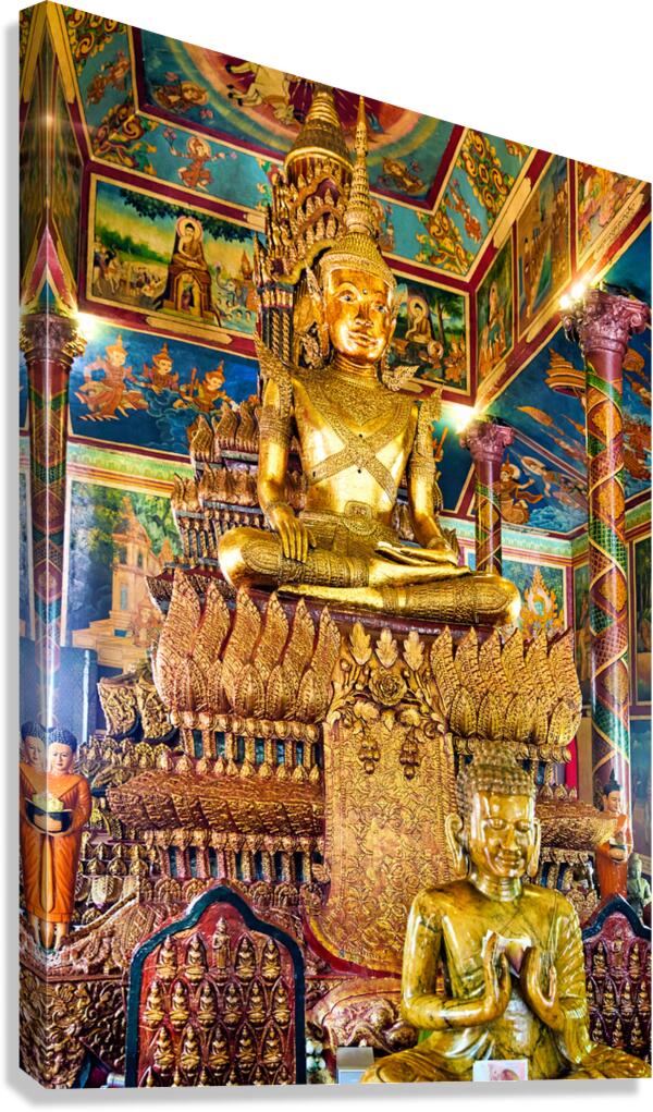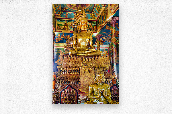 Golden Buddha statues and vibrant murals adorn a richly decorated Buddhist temple showcasing spiritual devotion and cultural artistry in Southeast Asi...[+]