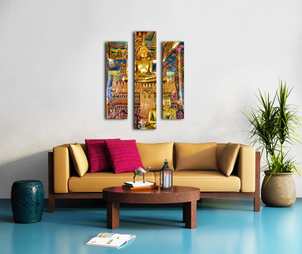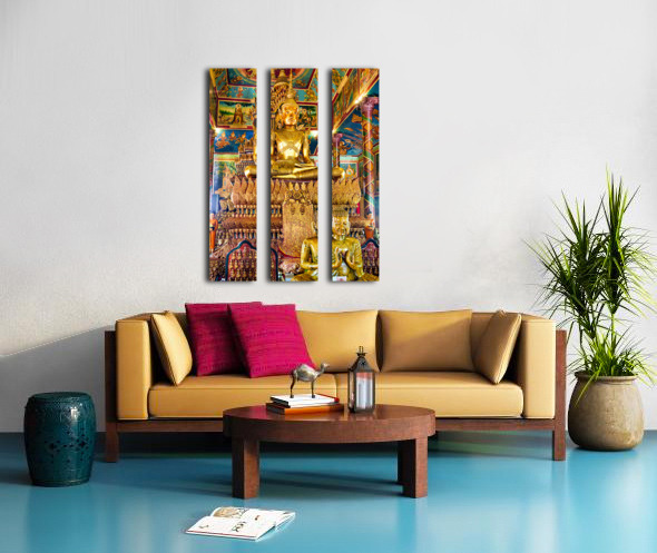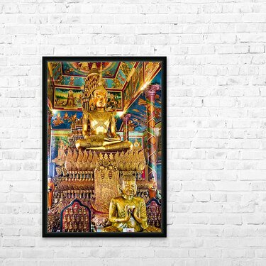 Ornate golden Buddha statue in a richly decorated temple. Frame print