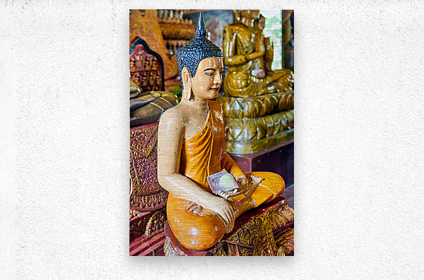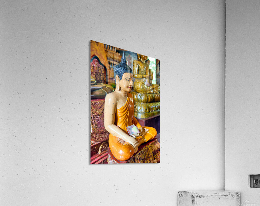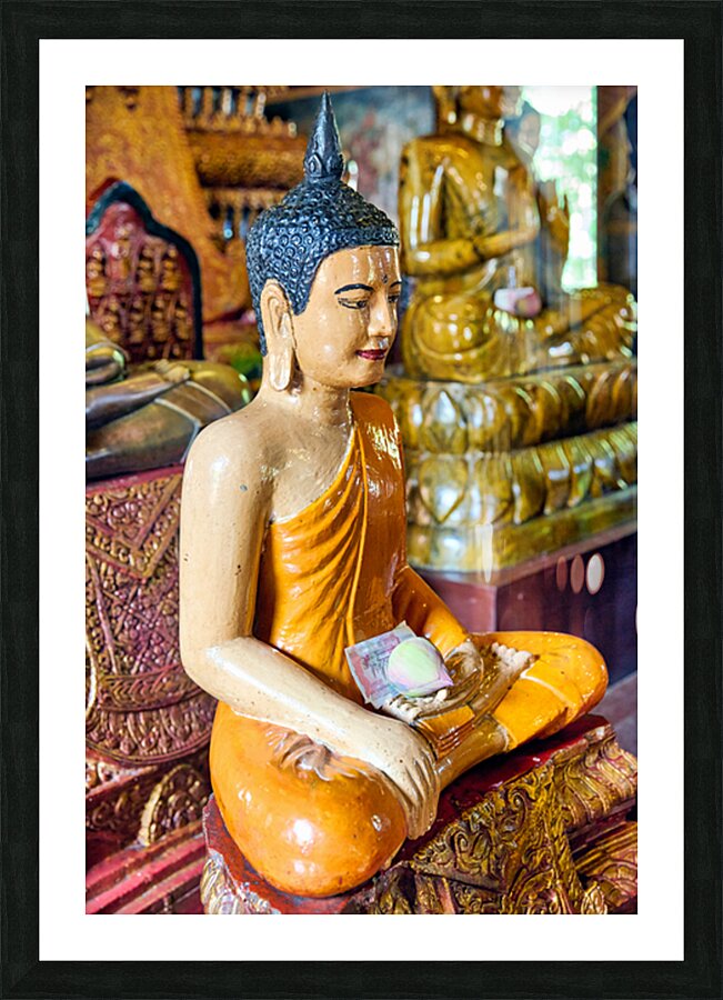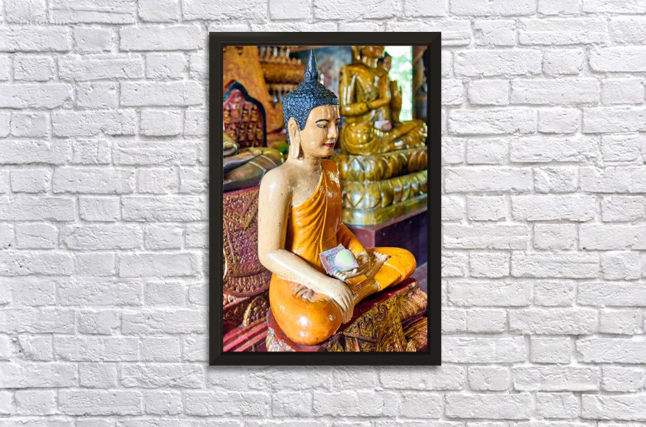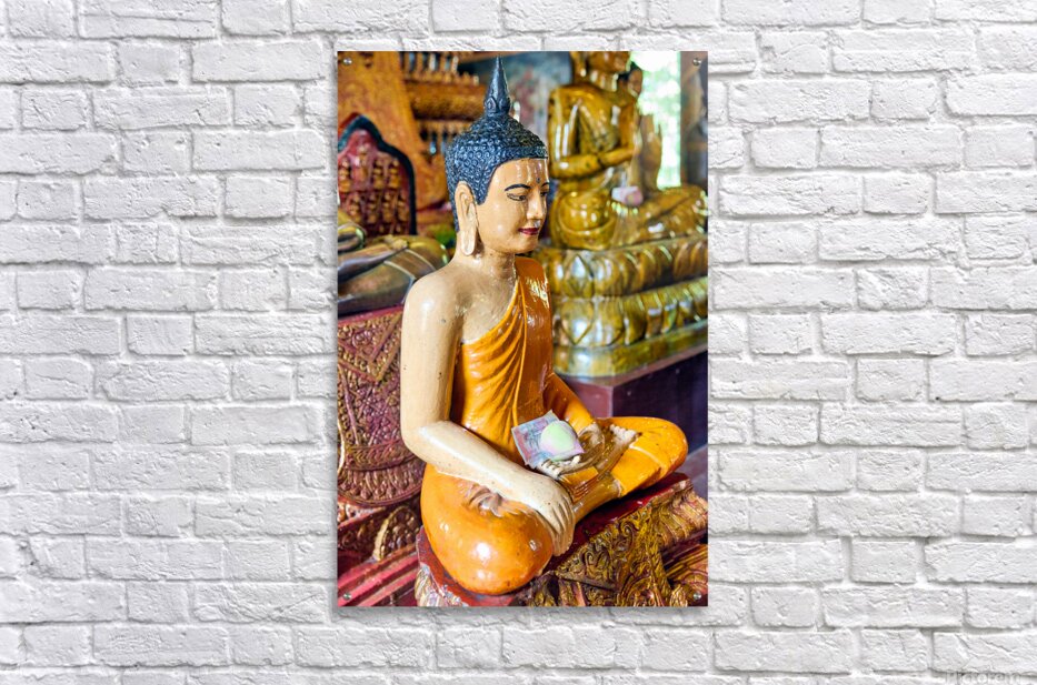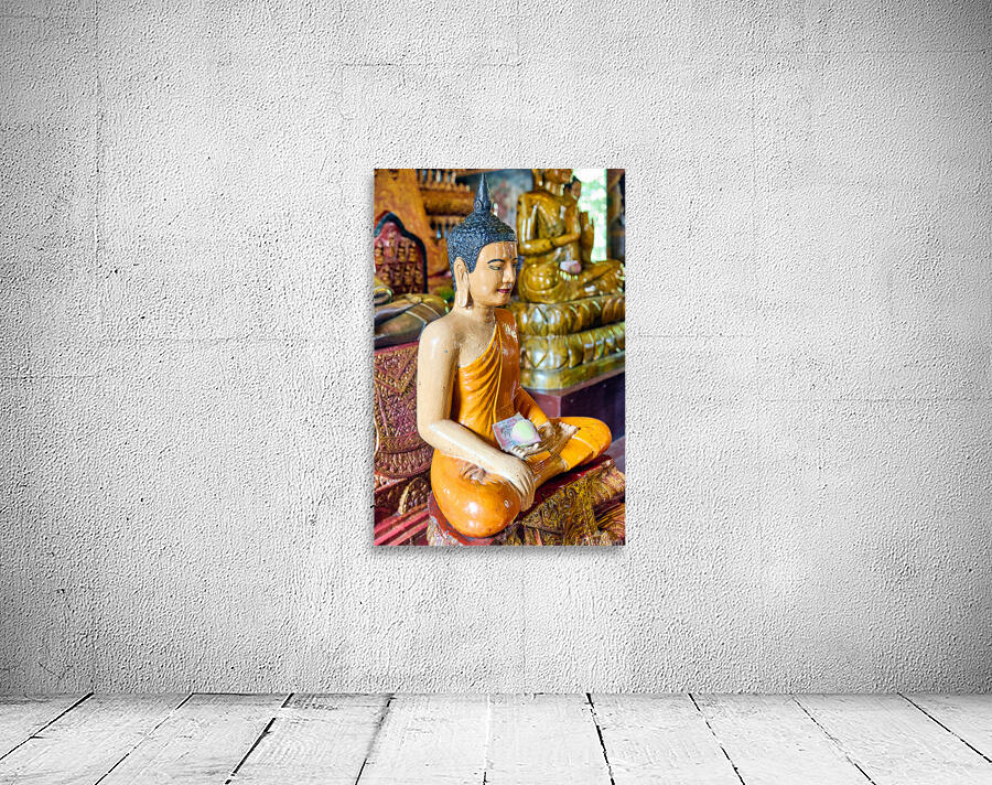 A Buddha statue in a temple receives offerings of a lotus bud and currency likely Cambodian Riel from devotees as a sign of respect and devotion.