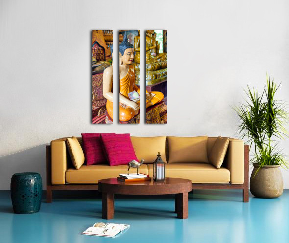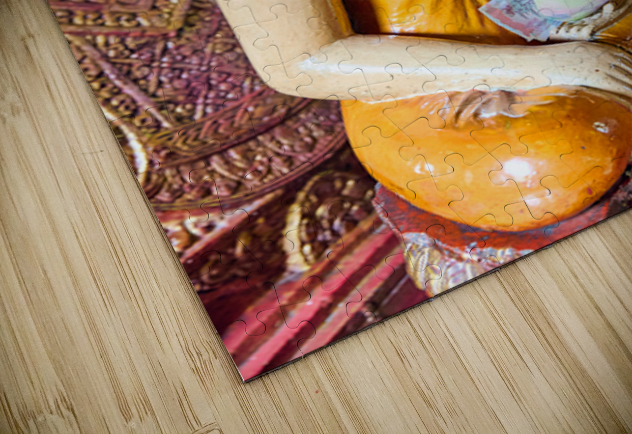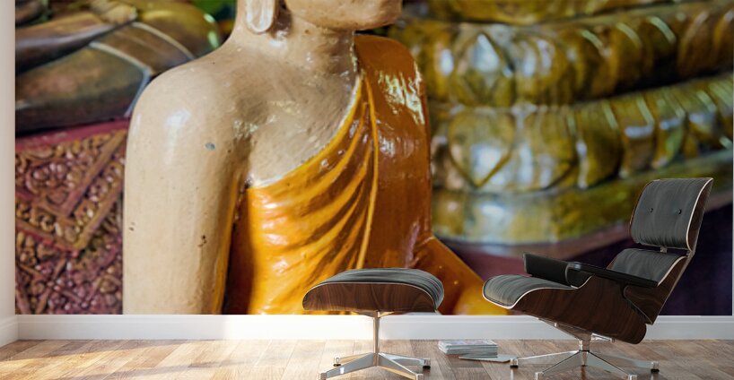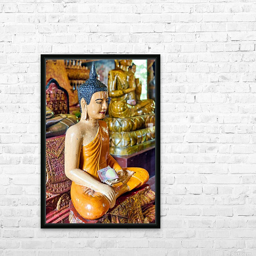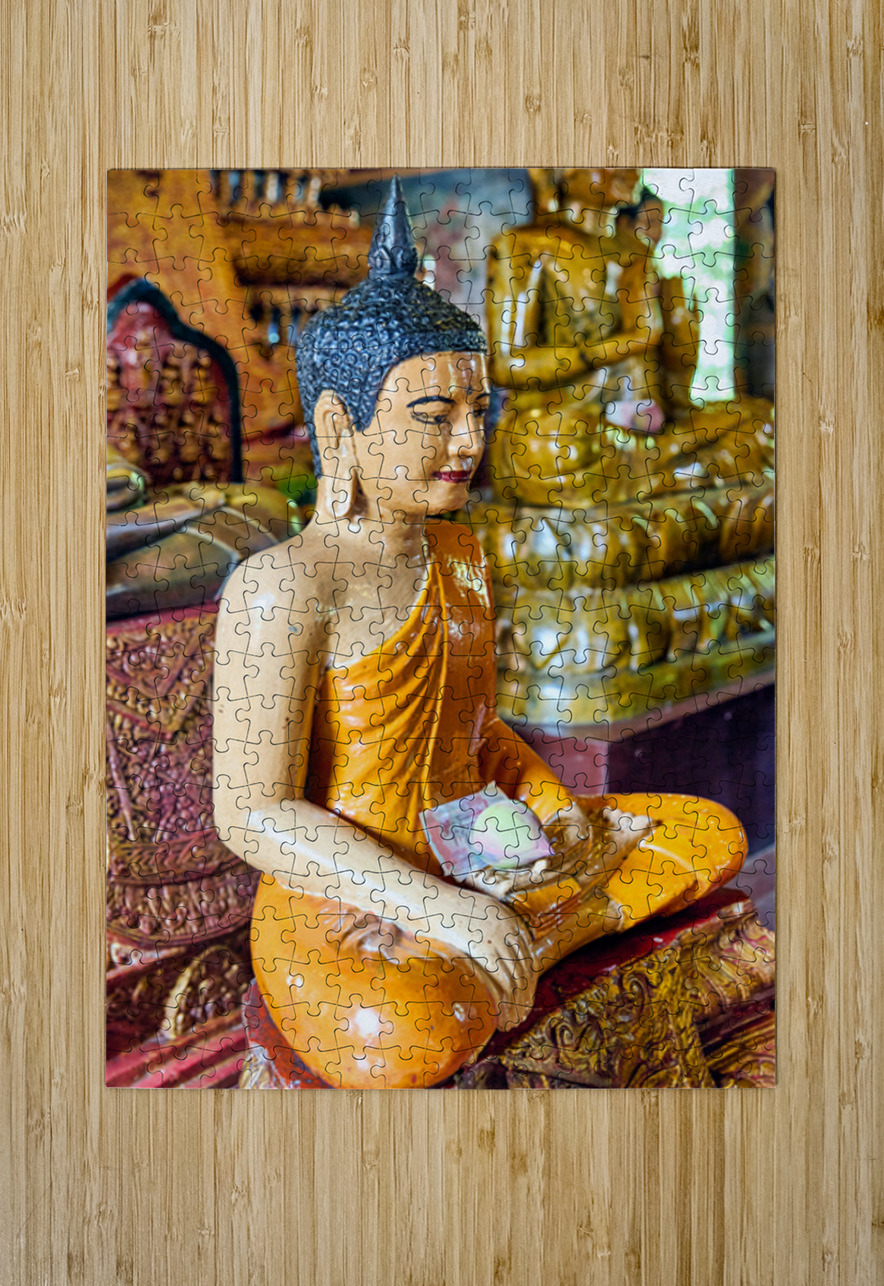 A Buddha statue in a temple receives offerings of a lotus bud and currency likely Cambodian Riel from devotees as a sign of respect and devotion.