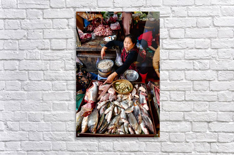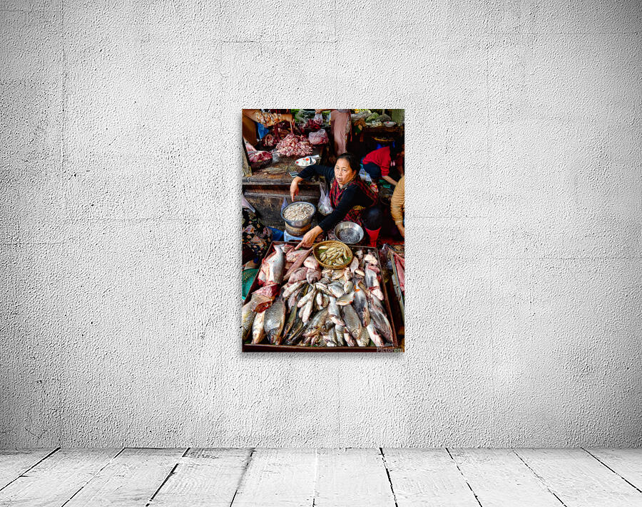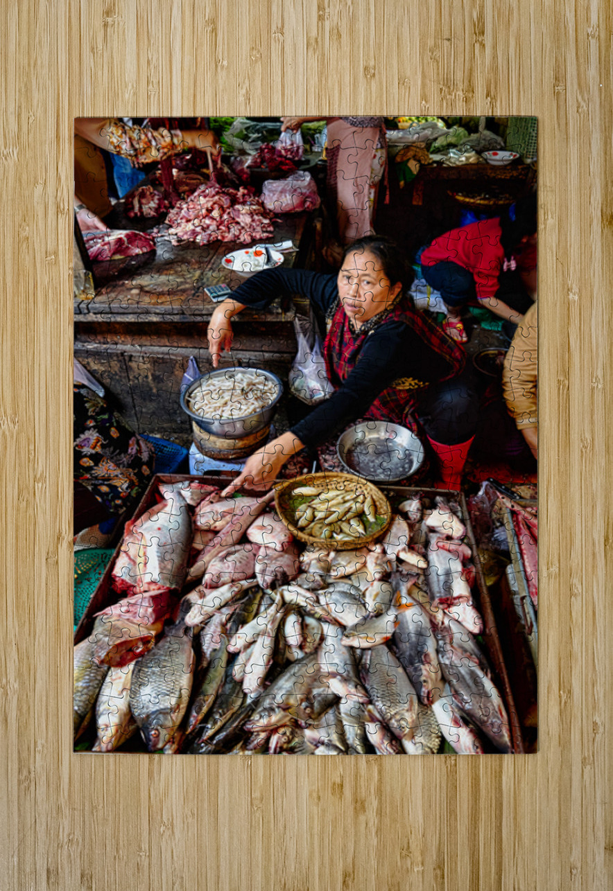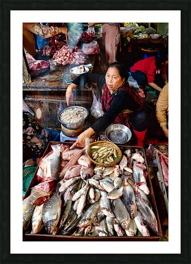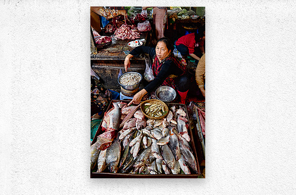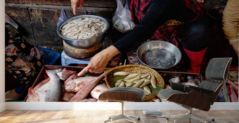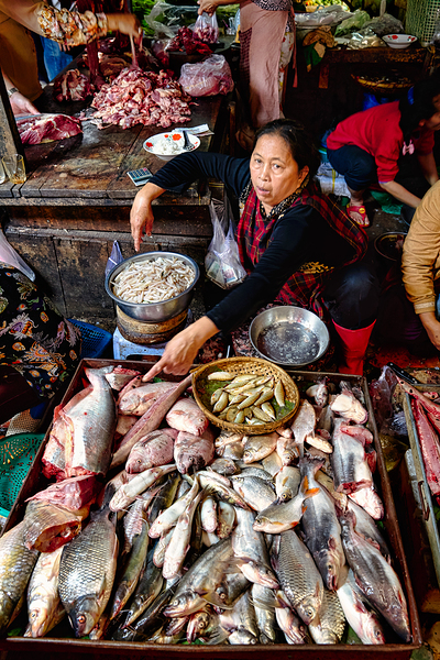 A female vendor at a bustling market sells fresh fish and raw meat pointing to her selection to provide daily provisions.