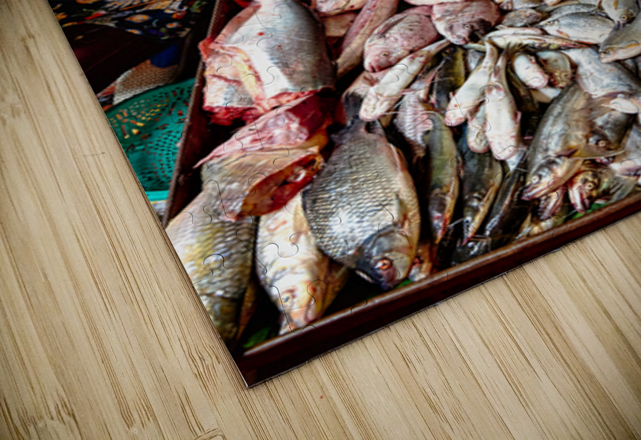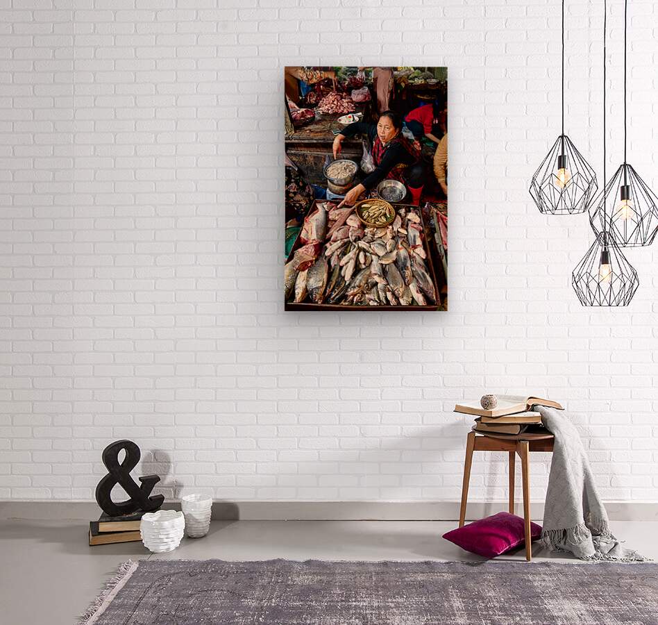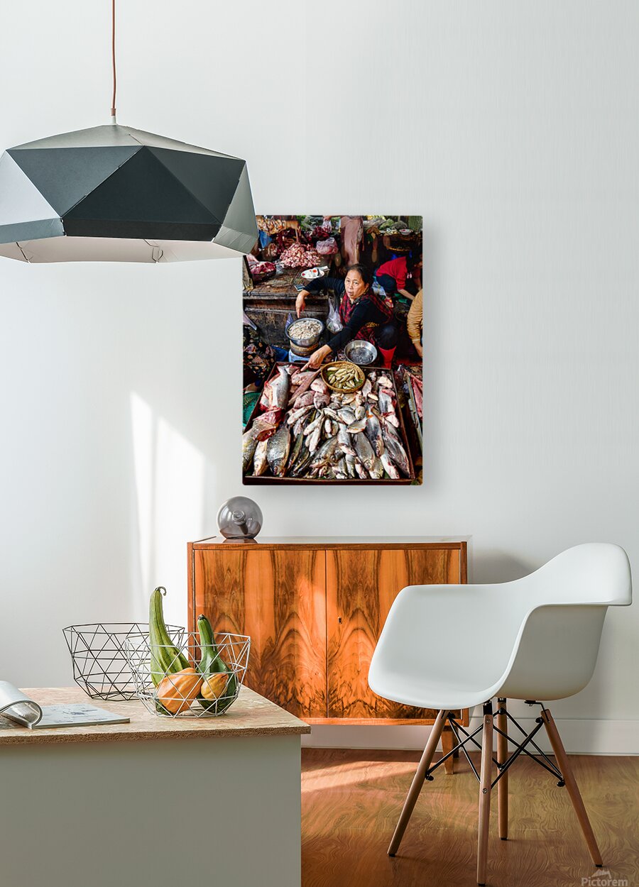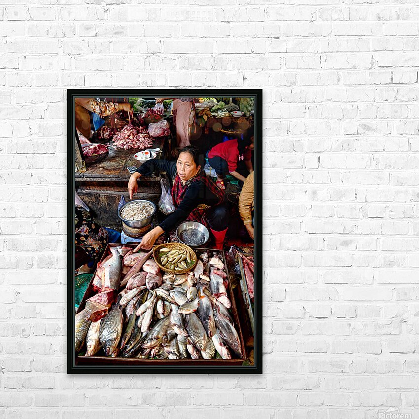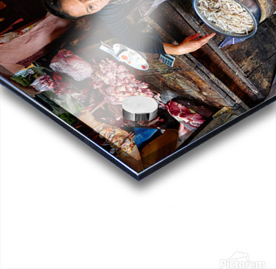 A female vendor at a bustling market sells fresh fish and raw meat pointing to her selection to provide daily provisions.