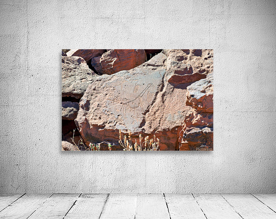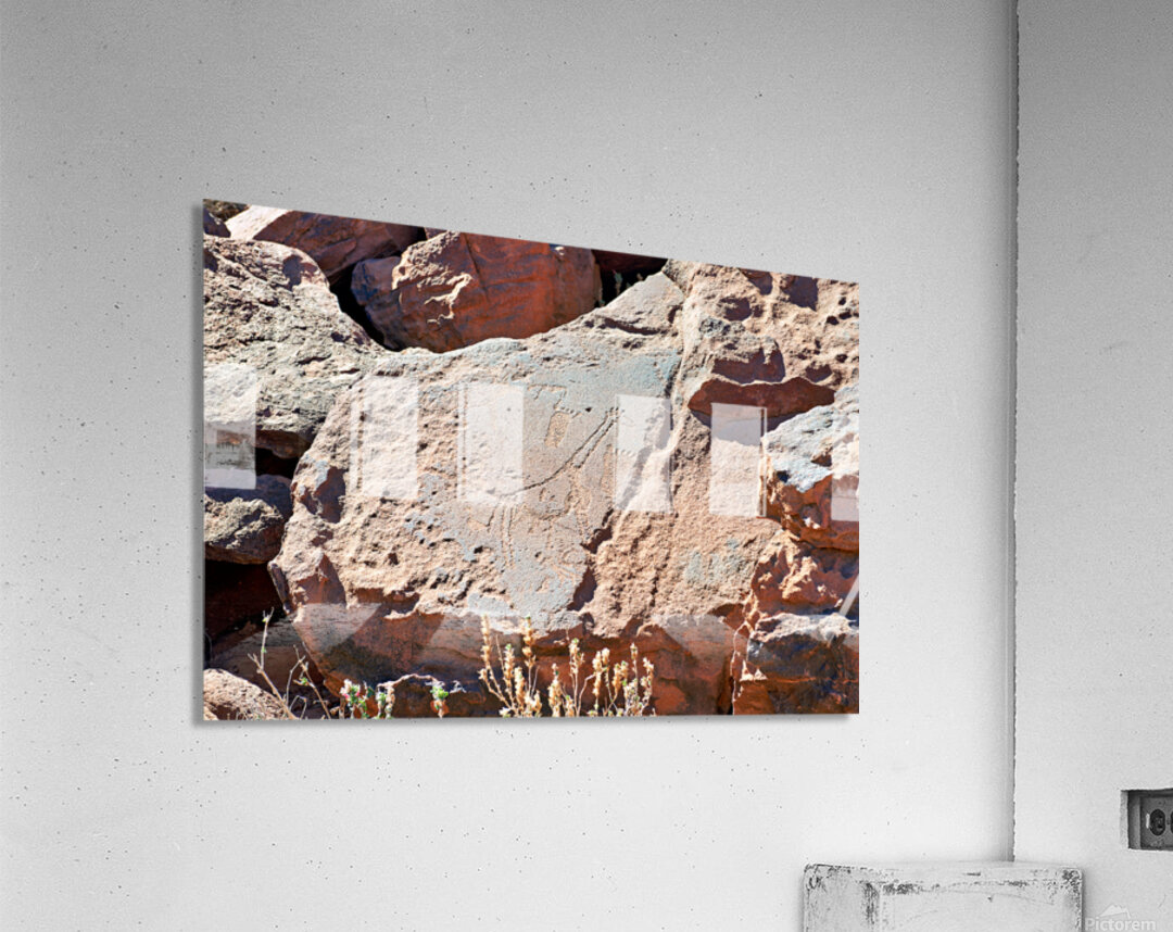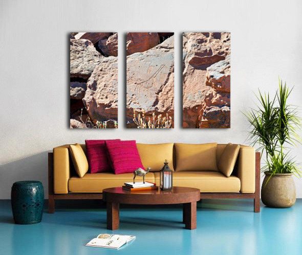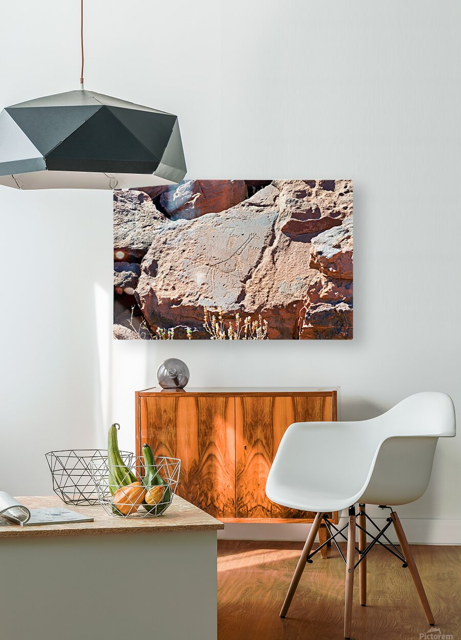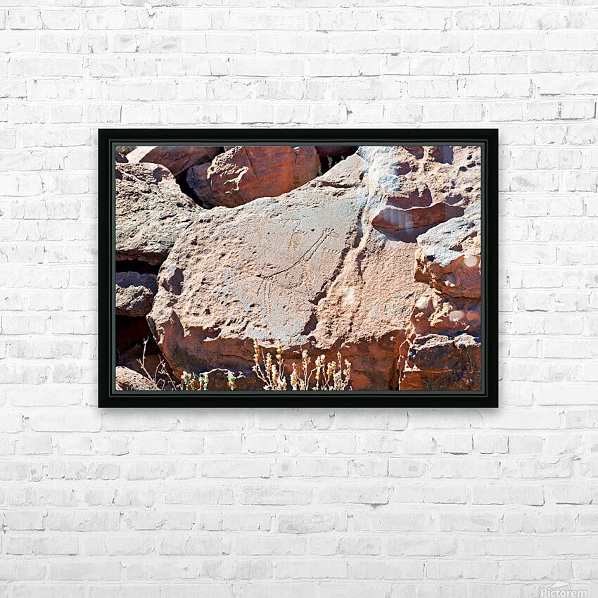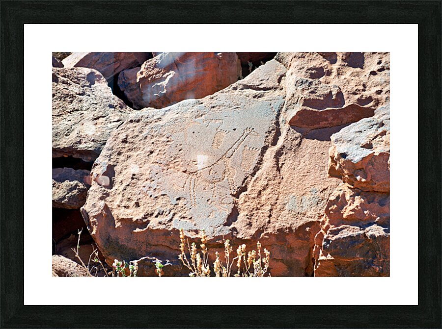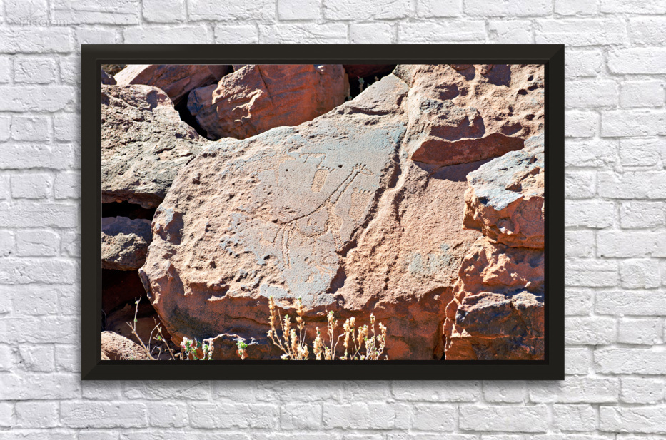 "Prehistoric rock engravings in Twyfelfontein Namibia" in a framed print.