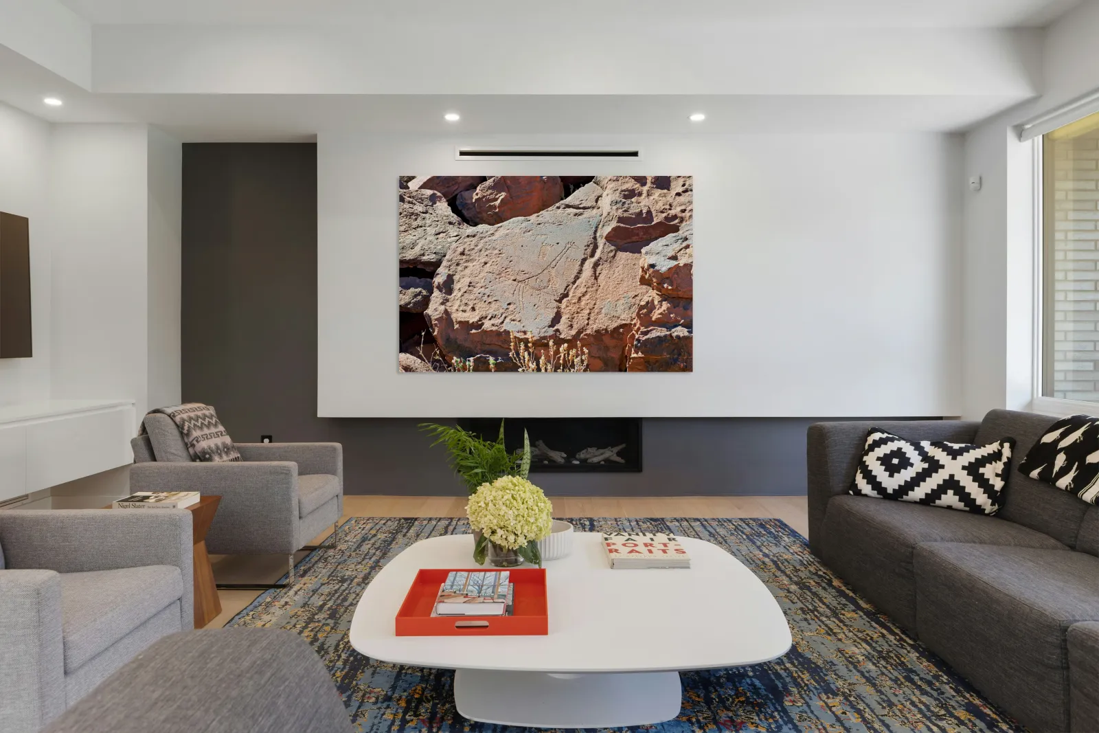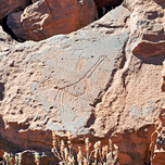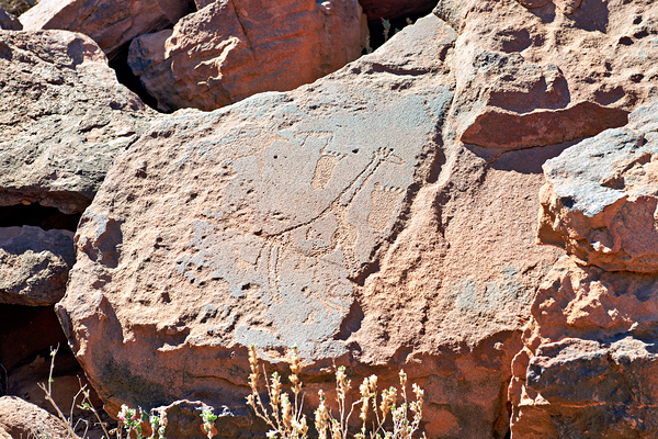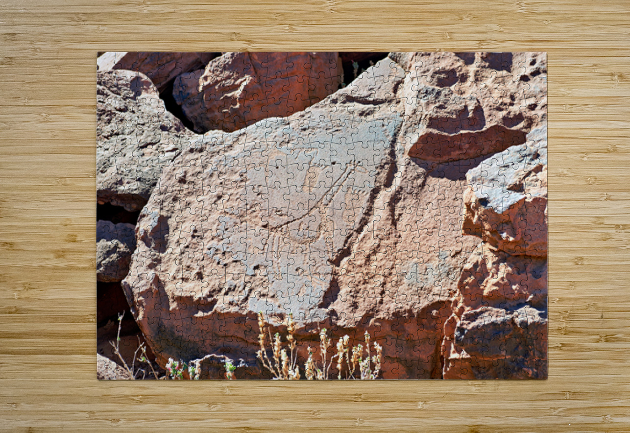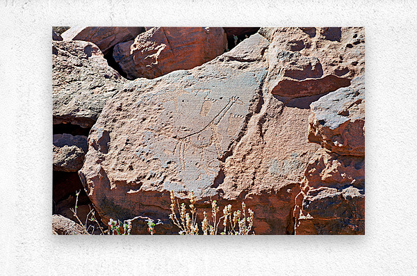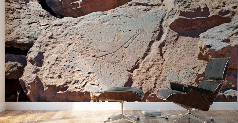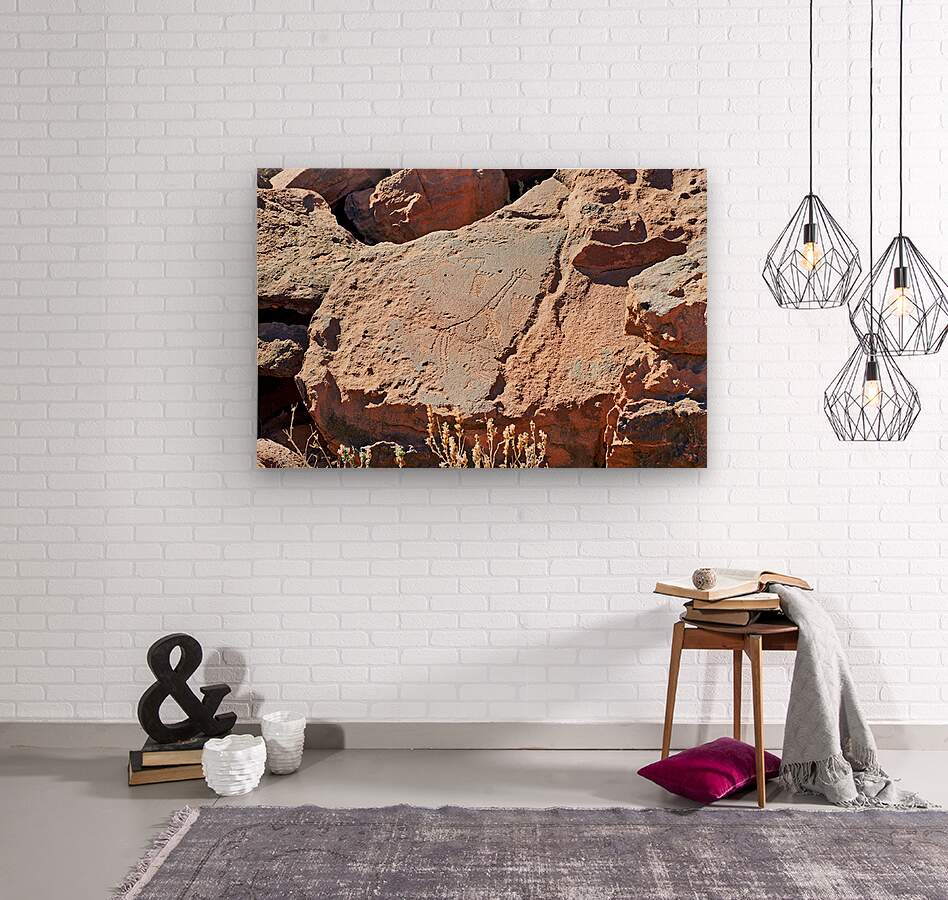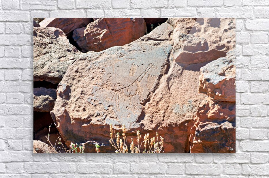 "Prehistoric rock engravings in Twyfelfontein Namibia" in a framed print.