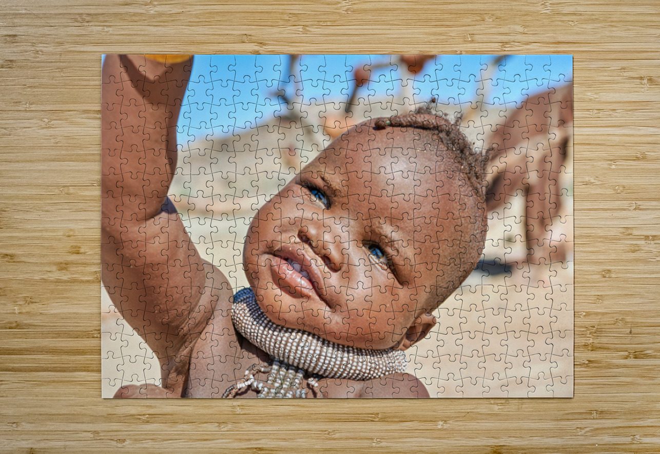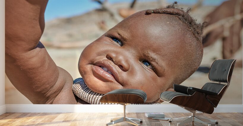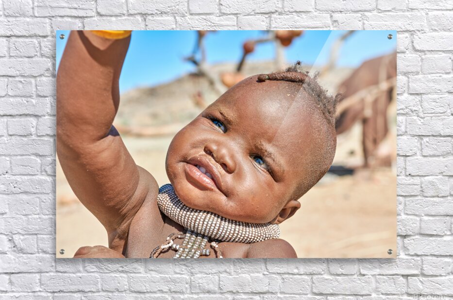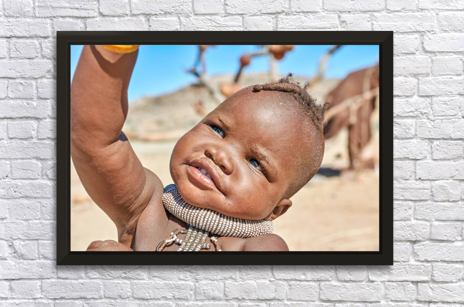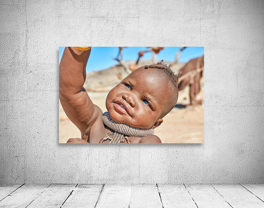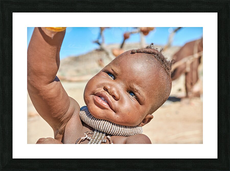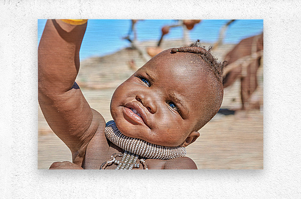 A Himba child raises their hand in the Kunene region of Namibia. The child wears traditional jewelry and shows a bright expression.