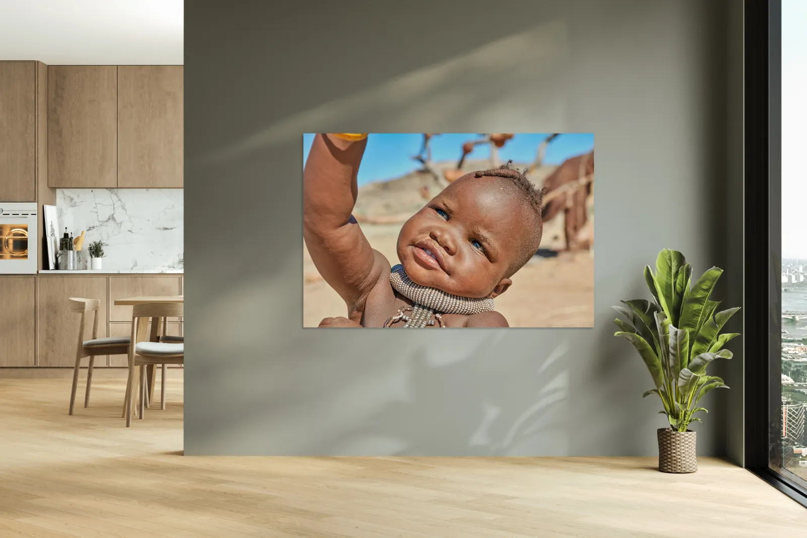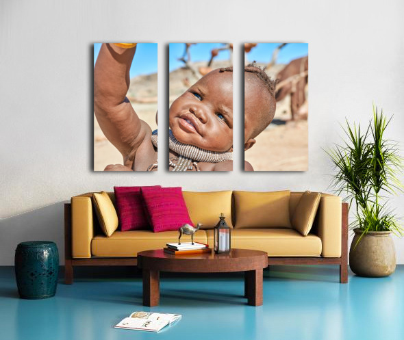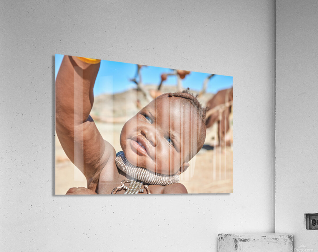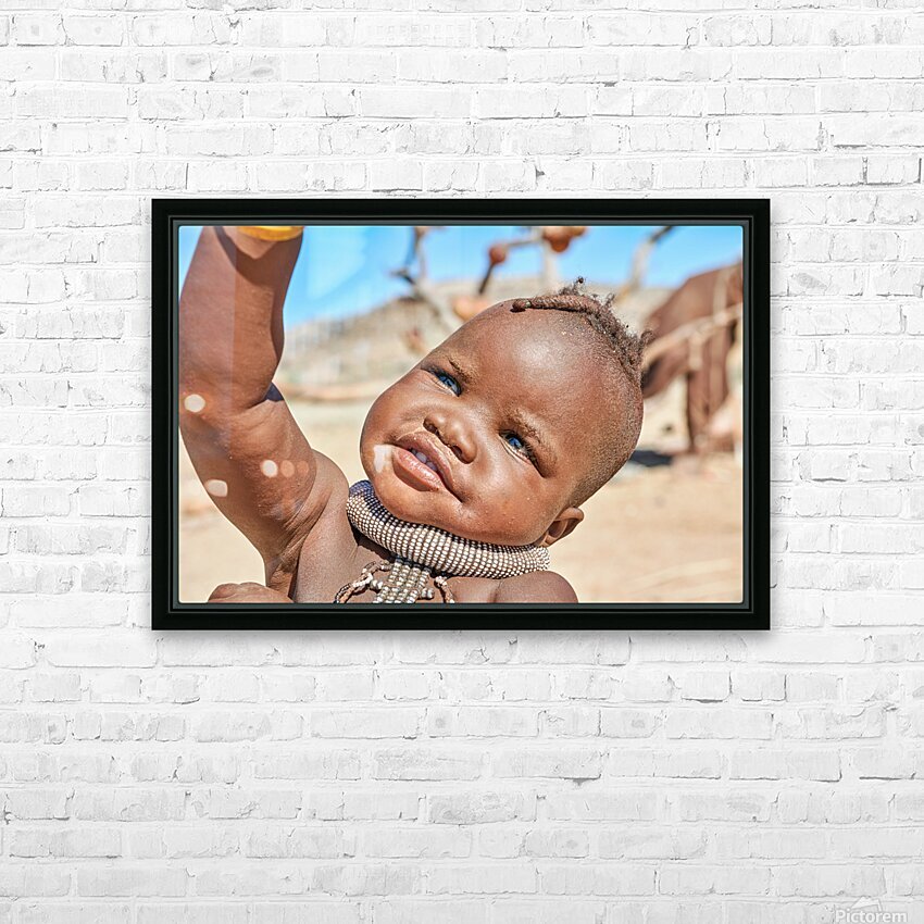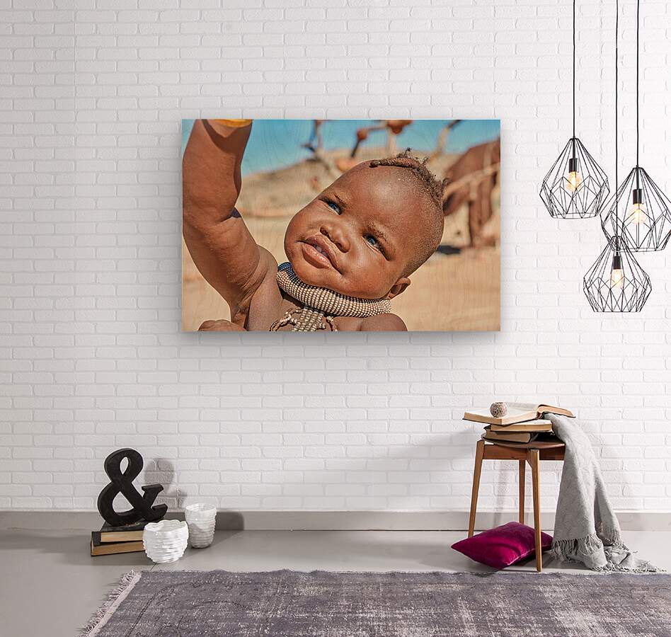 A Himba child raises their hand in the Kunene region of Namibia. The child wears traditional jewelry and shows a bright expression.