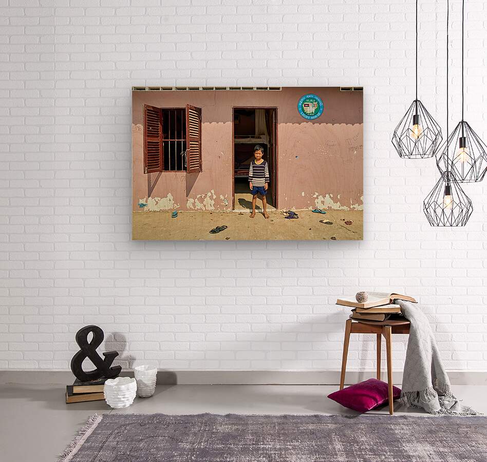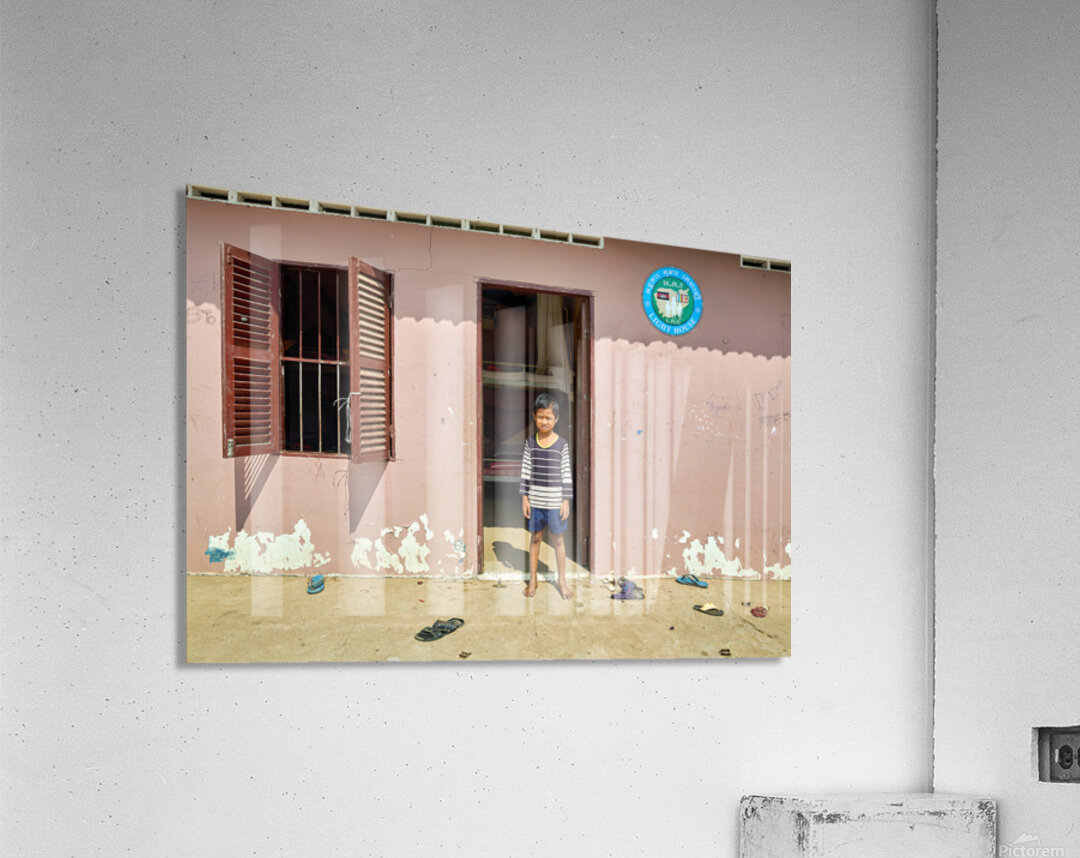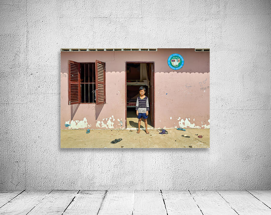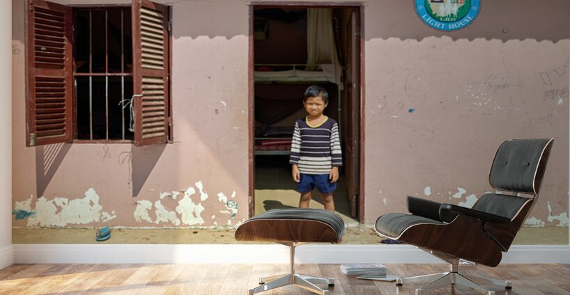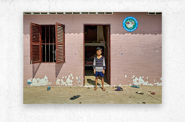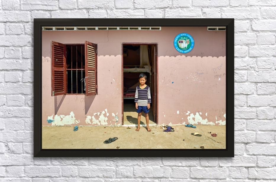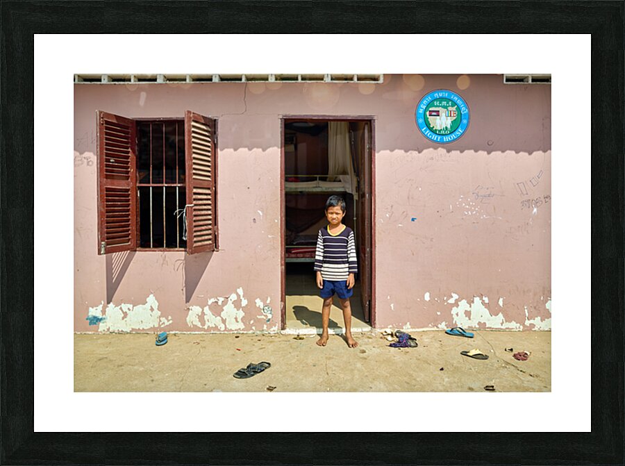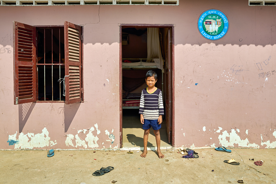 A young boy stands barefoot in the doorway of the Light House likely an orphanage or community center in Cambodia. Bunk beds are visible inside.