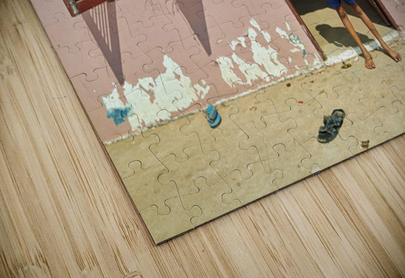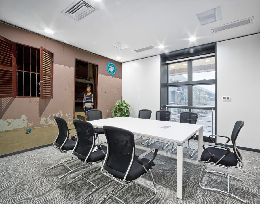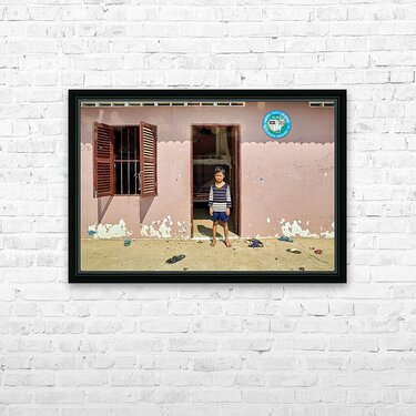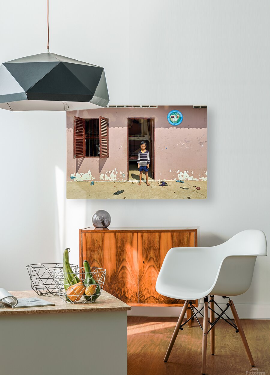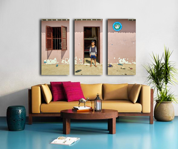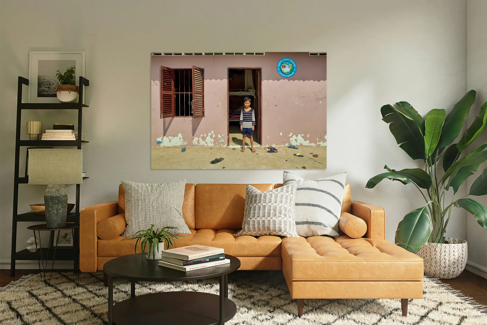 A young boy stands barefoot in the doorway of the Light House likely an orphanage or community center in Cambodia. Bunk beds are visible inside.