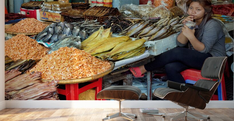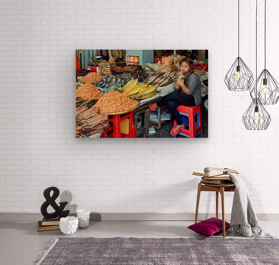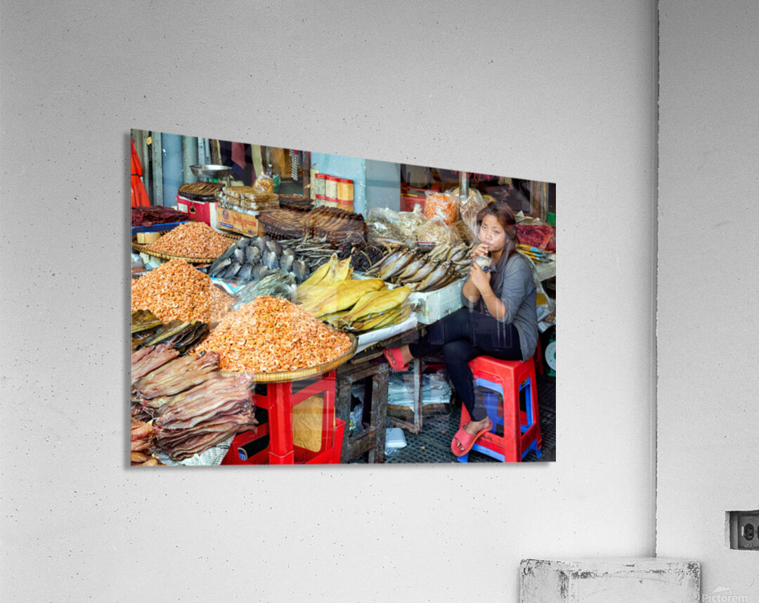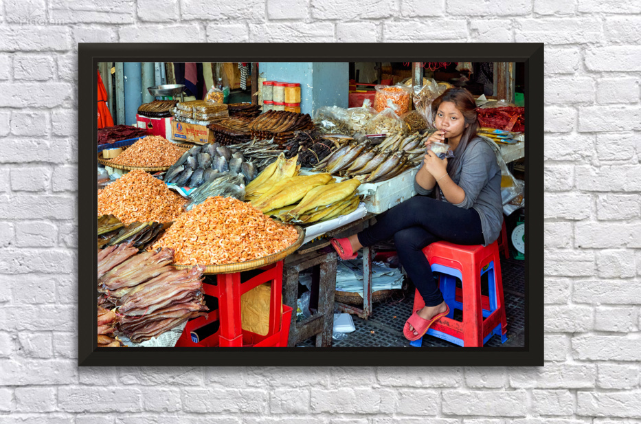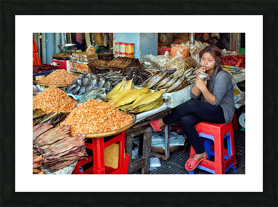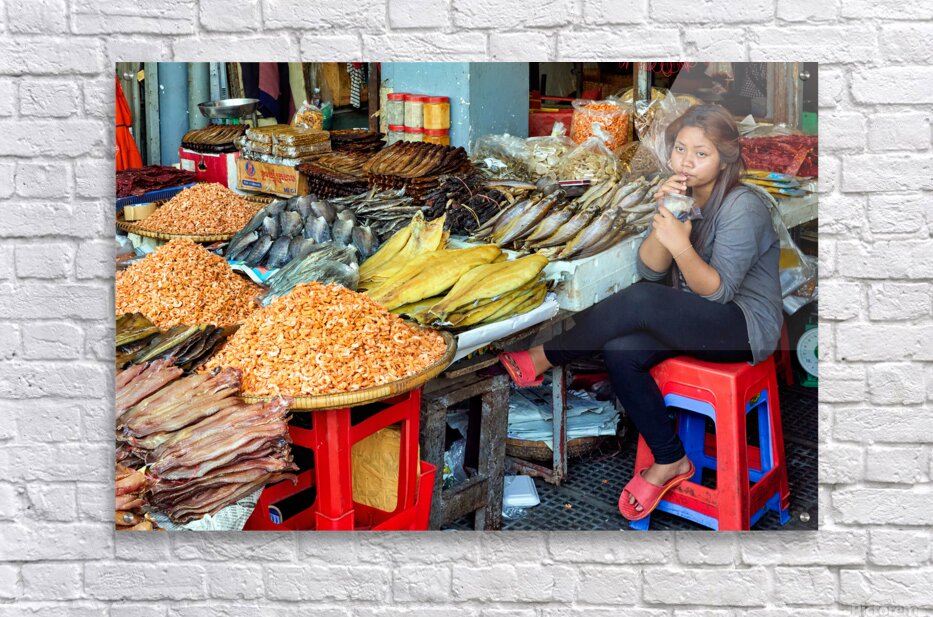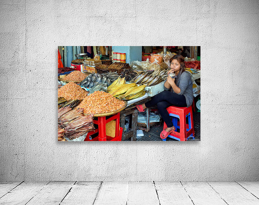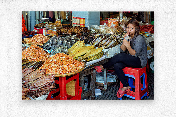 A market vendor in Southeast Asia takes a break sipping a drink while surrounded by her stalls array of dried fish and shrimp.