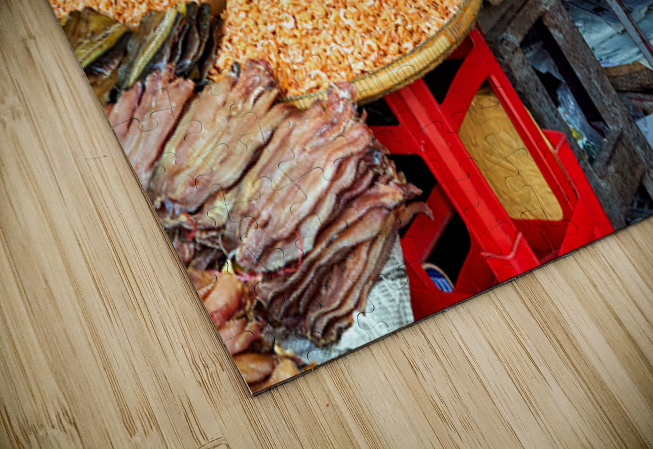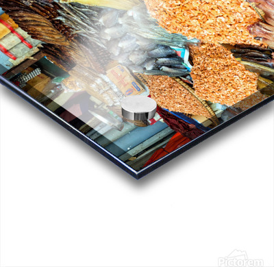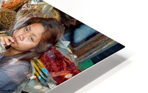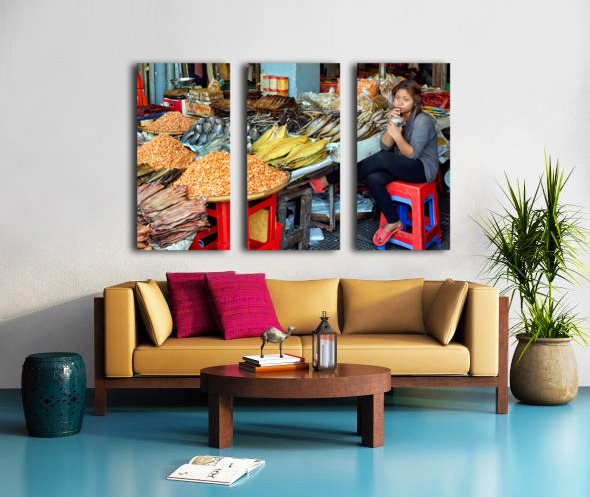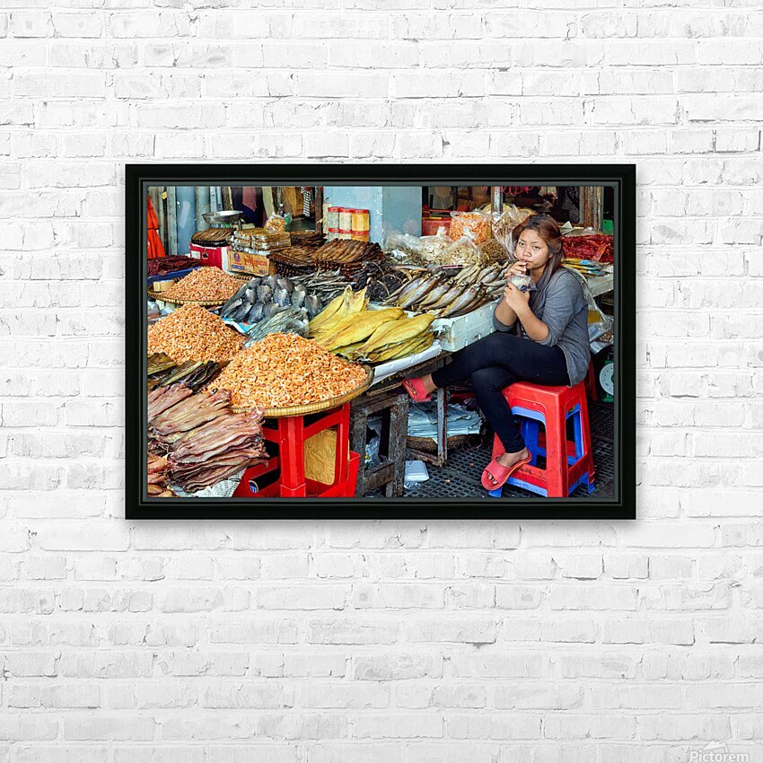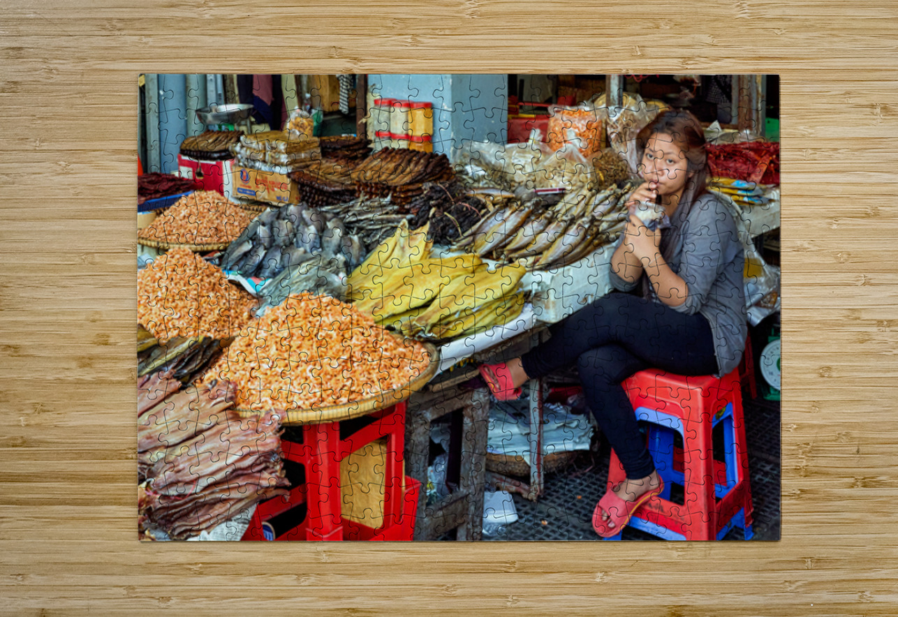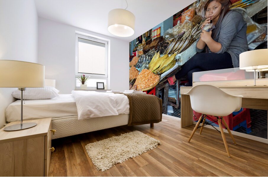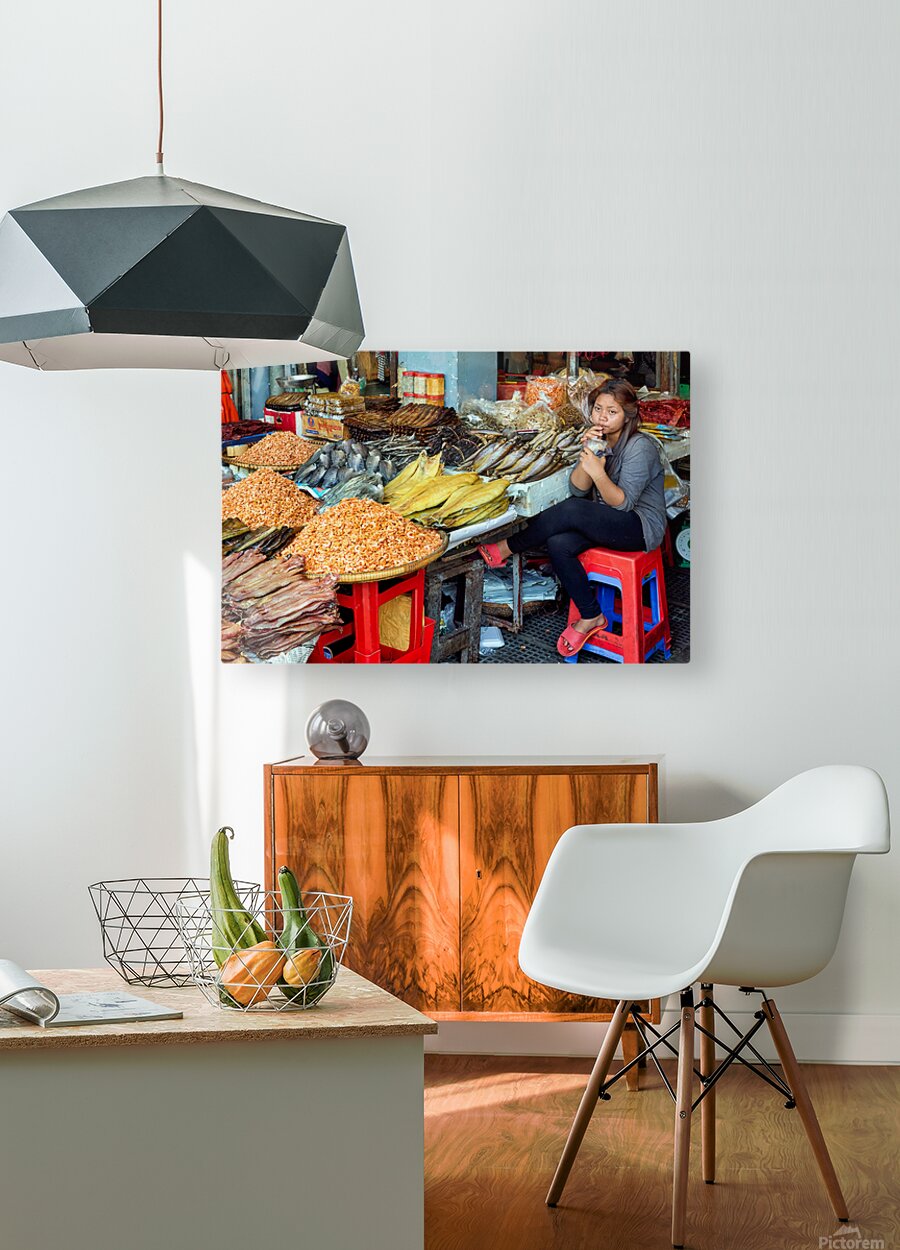 A market vendor in Southeast Asia takes a break sipping a drink while surrounded by her stalls array of dried fish and shrimp.