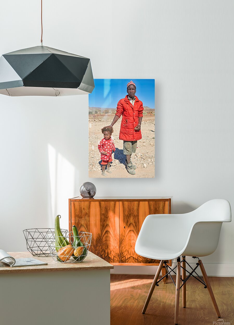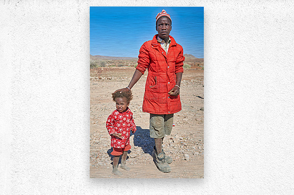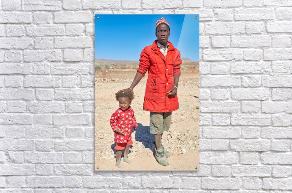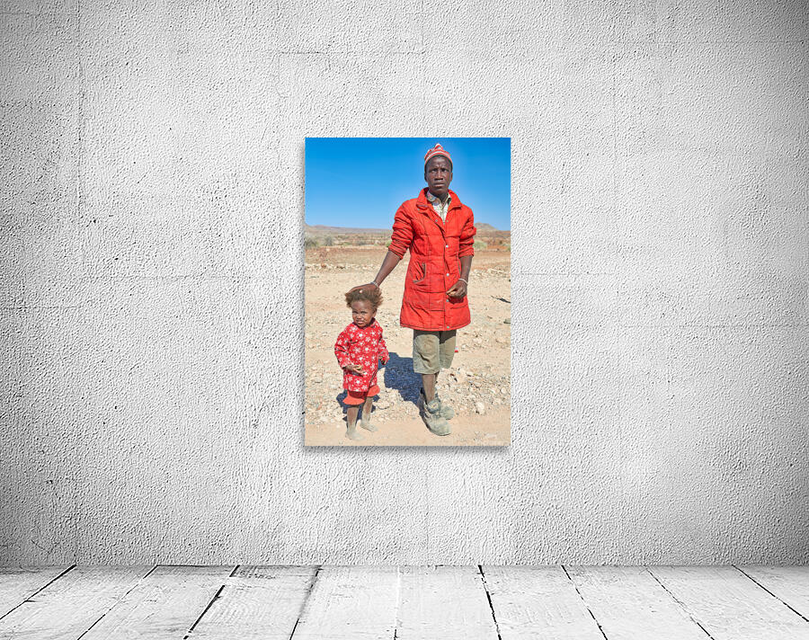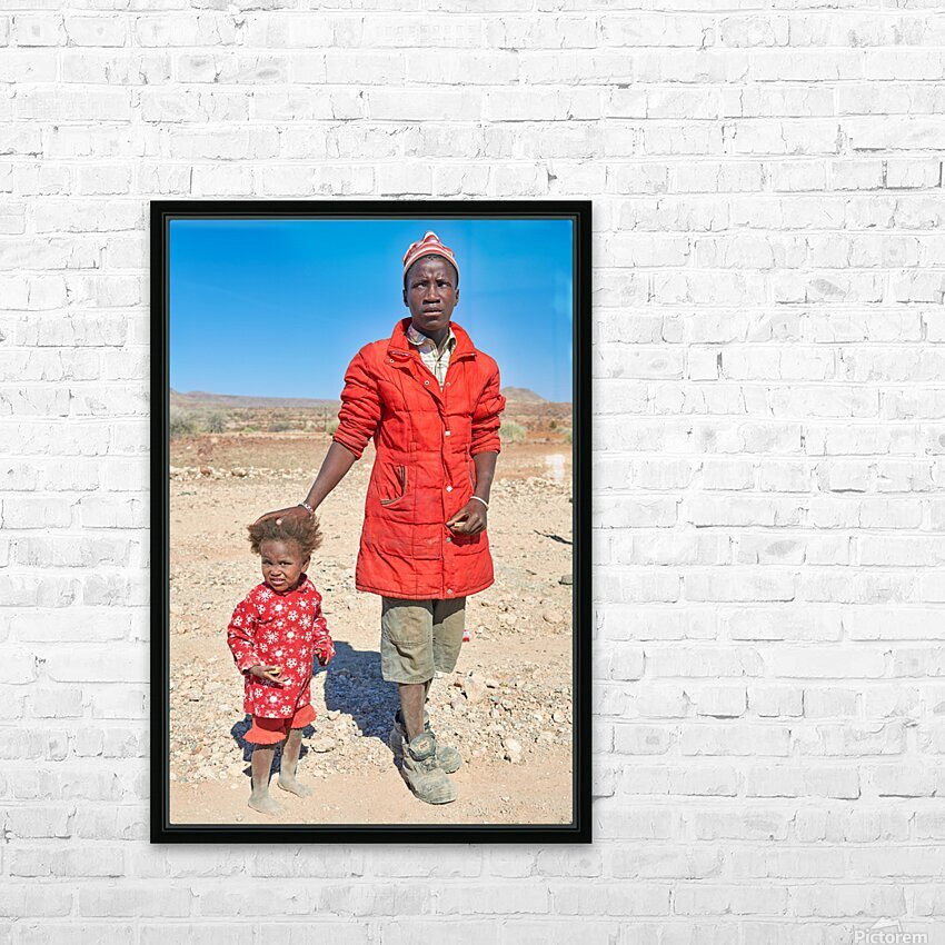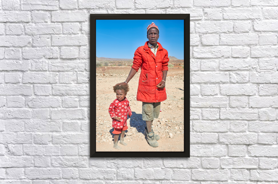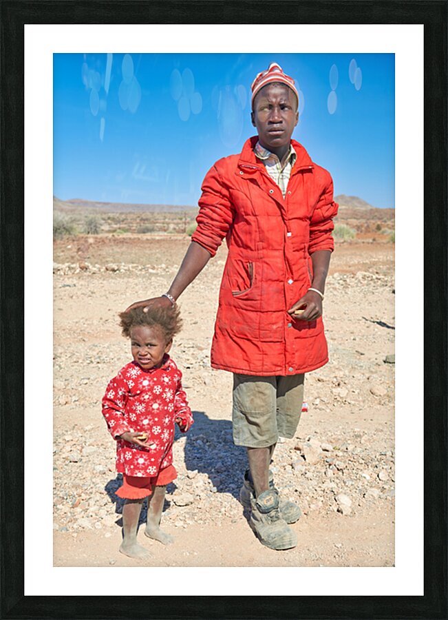 "Father and daughter stand together in Palmwag Kunene Region" in a framed print.