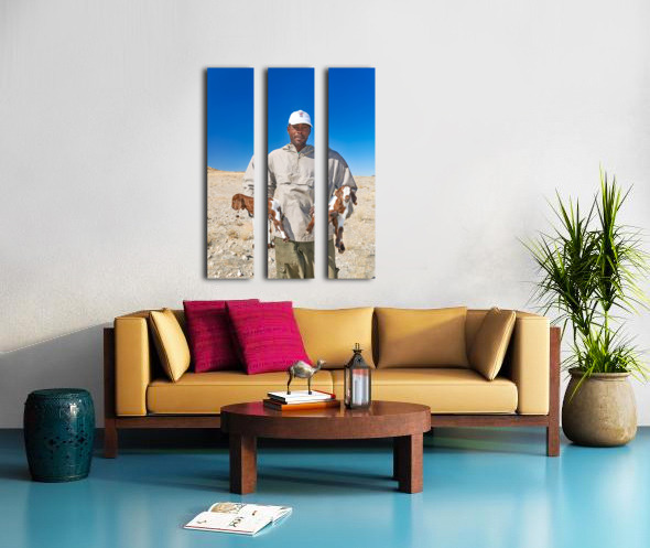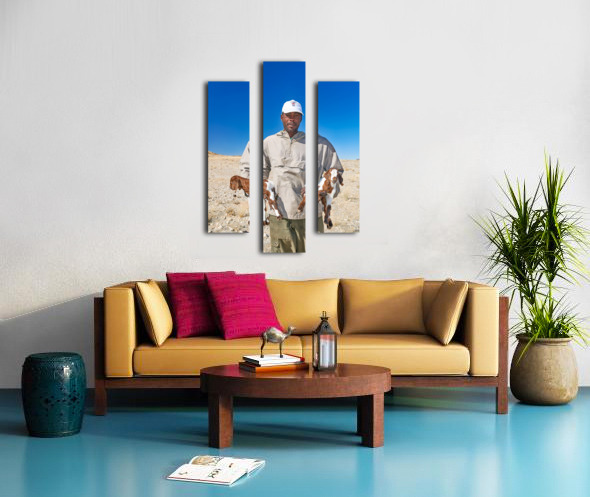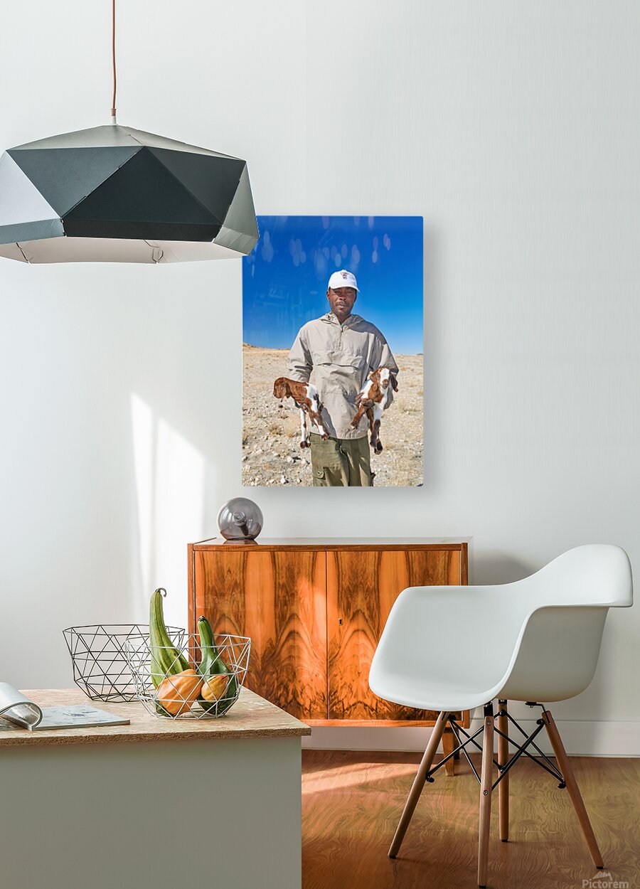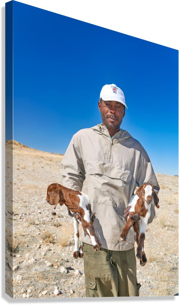 Get this artwork "Shepherd holds his young goats in Namibia under bright blue sky" in a framed print.