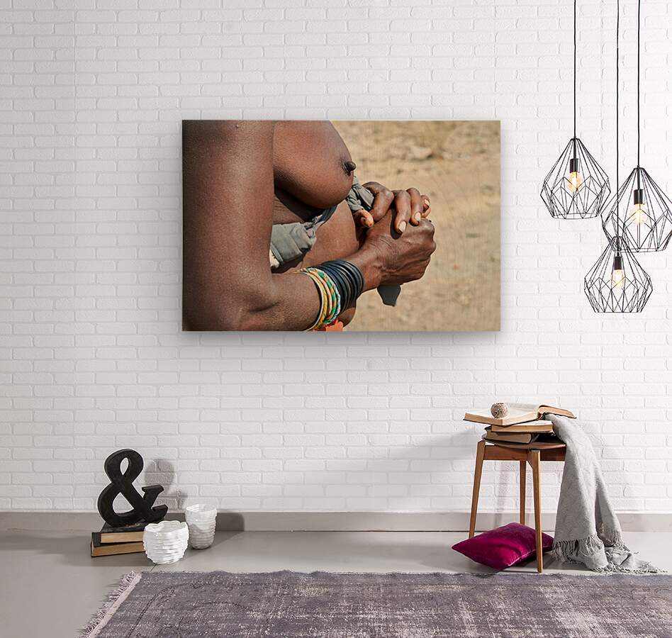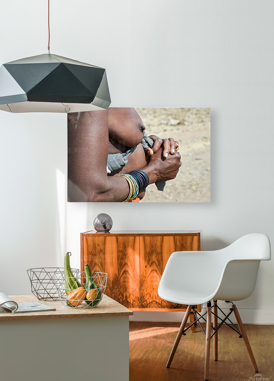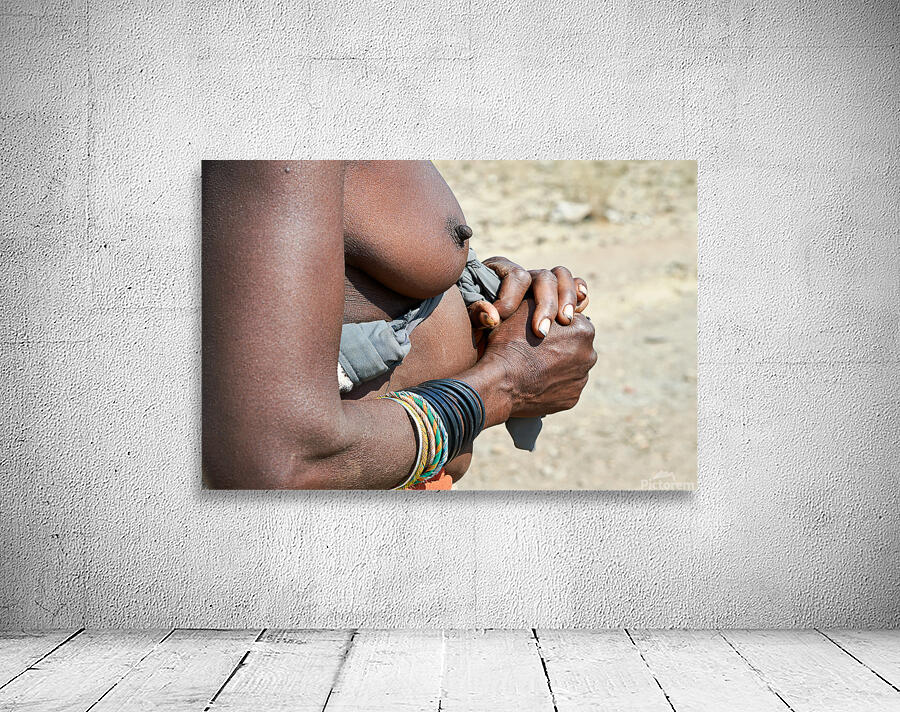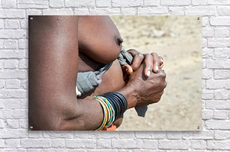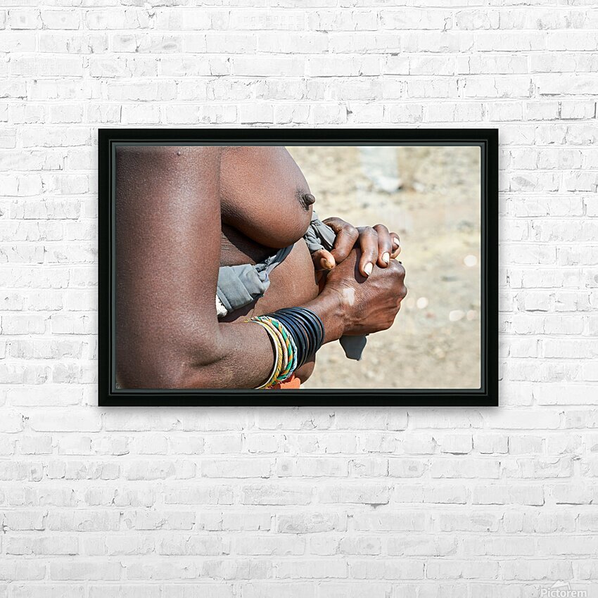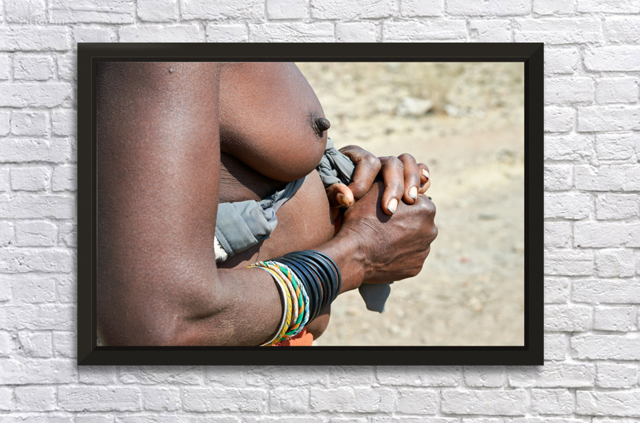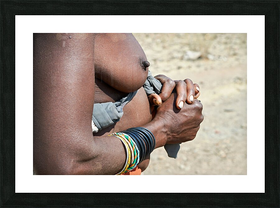"Detailed view of hands and chest of Zemba woman in Namibia" in a framed print.