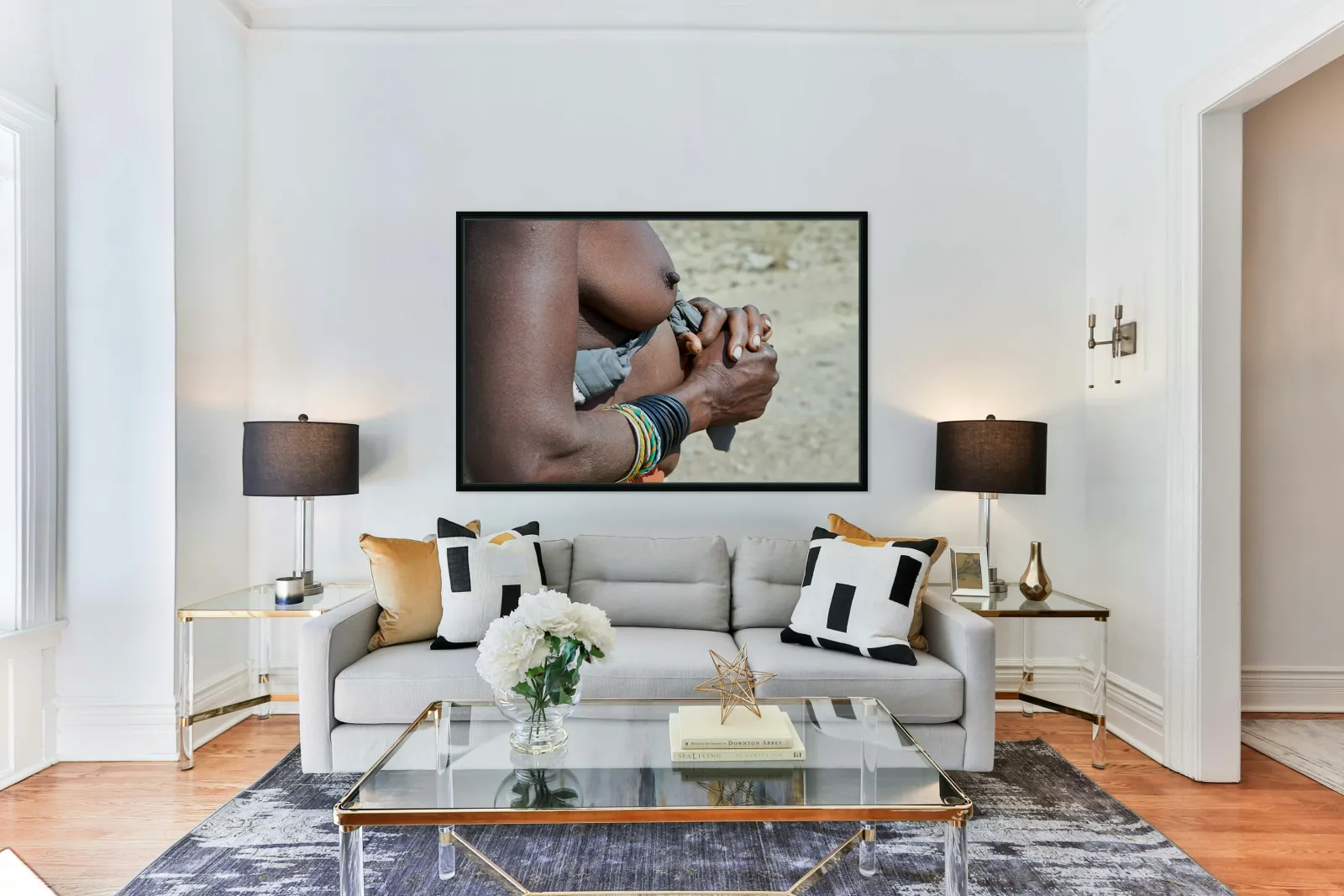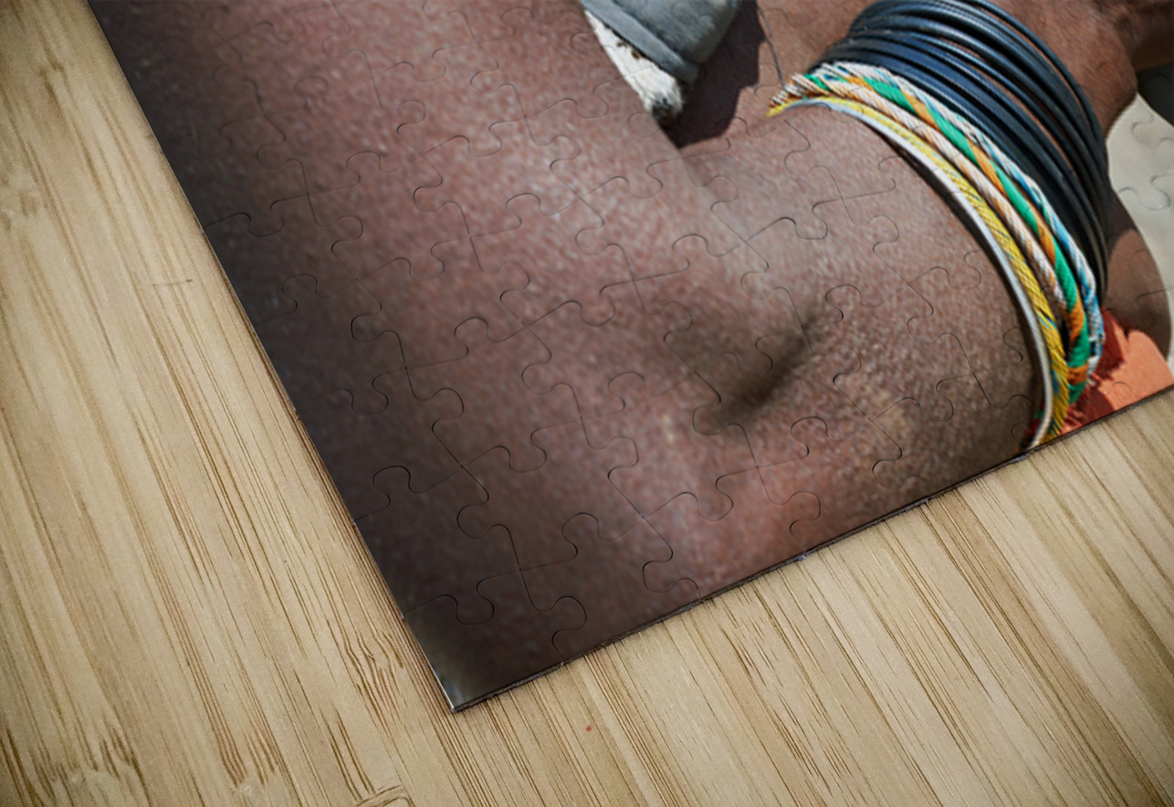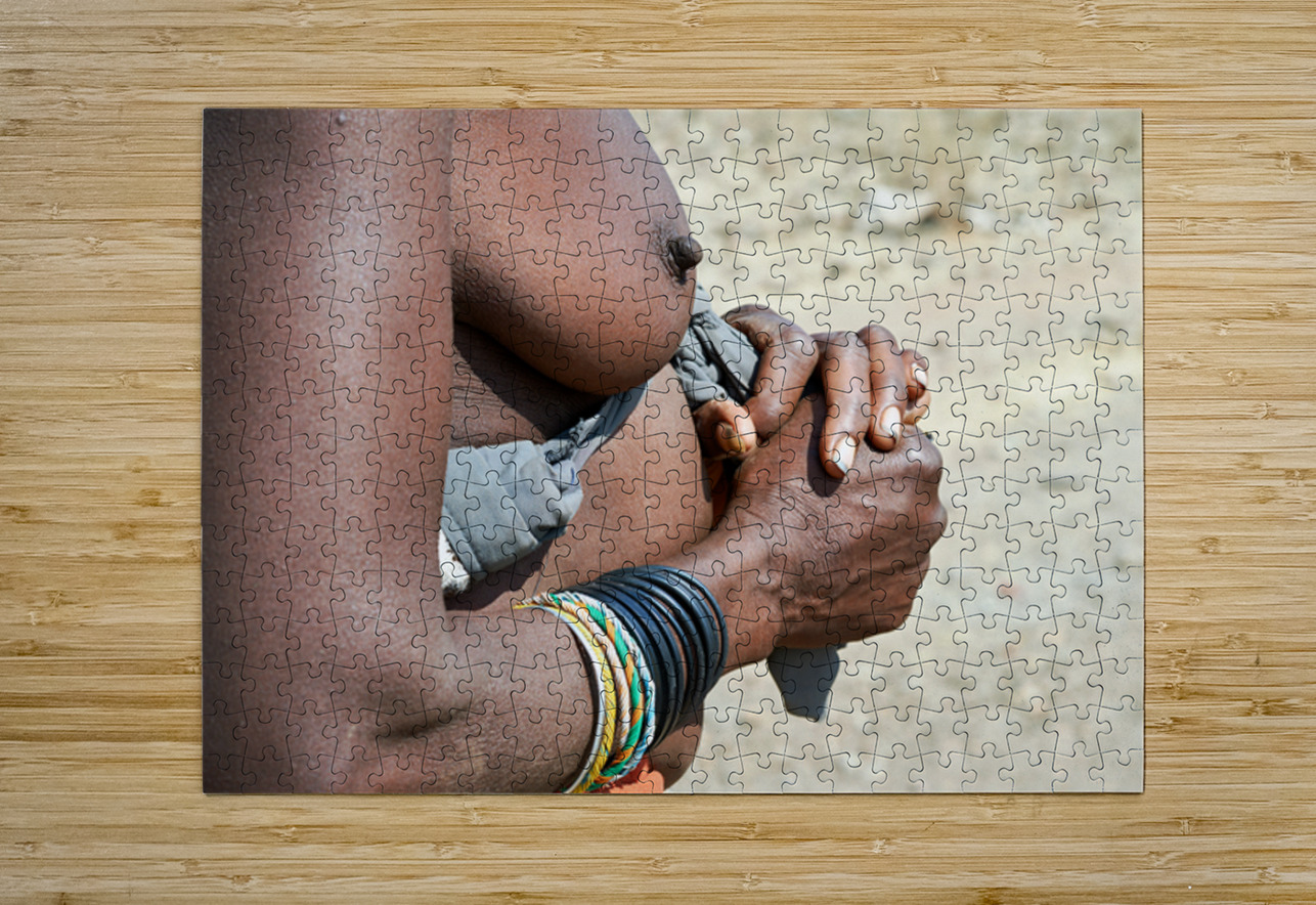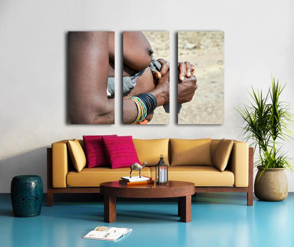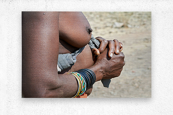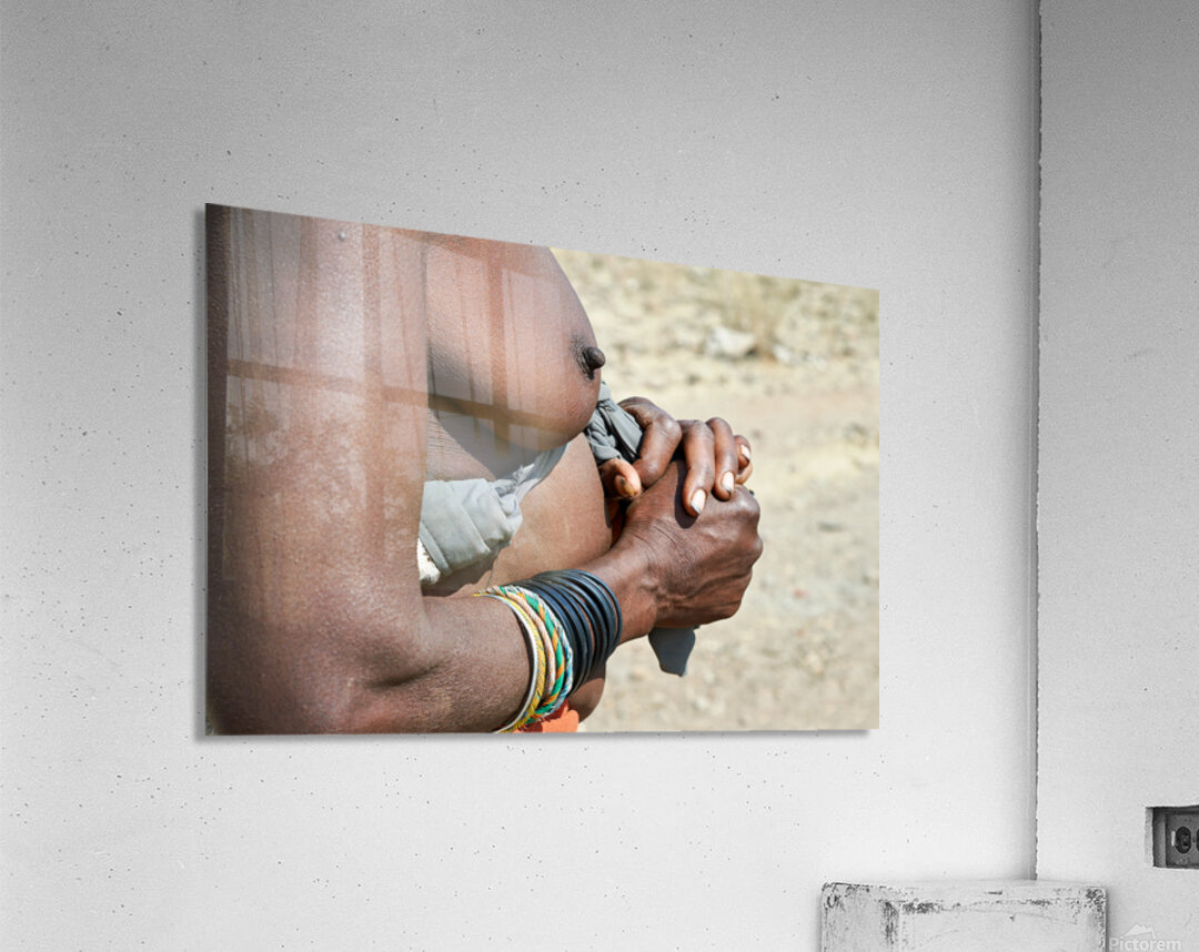"Detailed view of hands and chest of Zemba woman in Namibia" in a framed print.