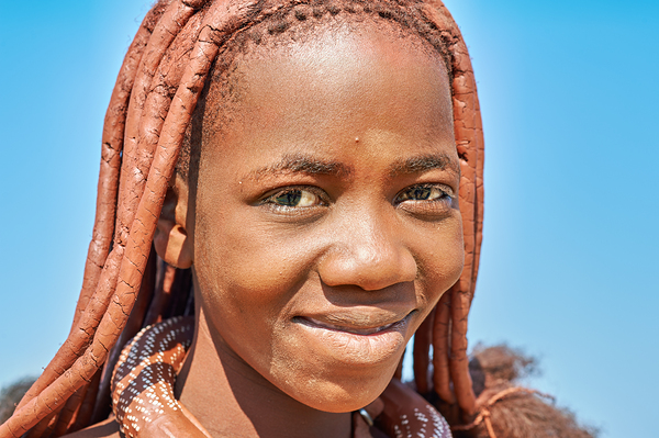 A Himba woman stands in the Kunene region of Namibia. She has long braided hair and smiles softly at the camera under a clear sky.