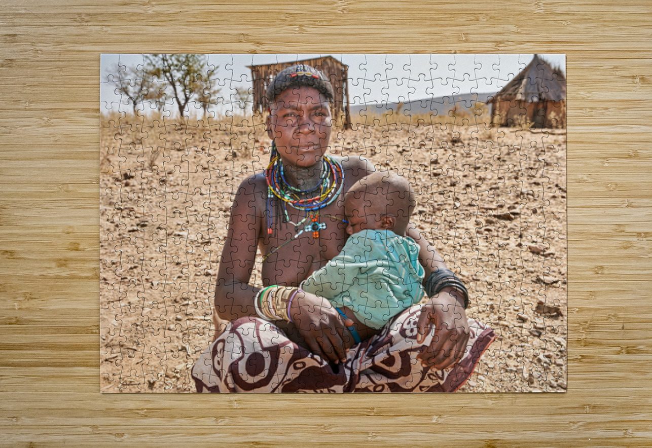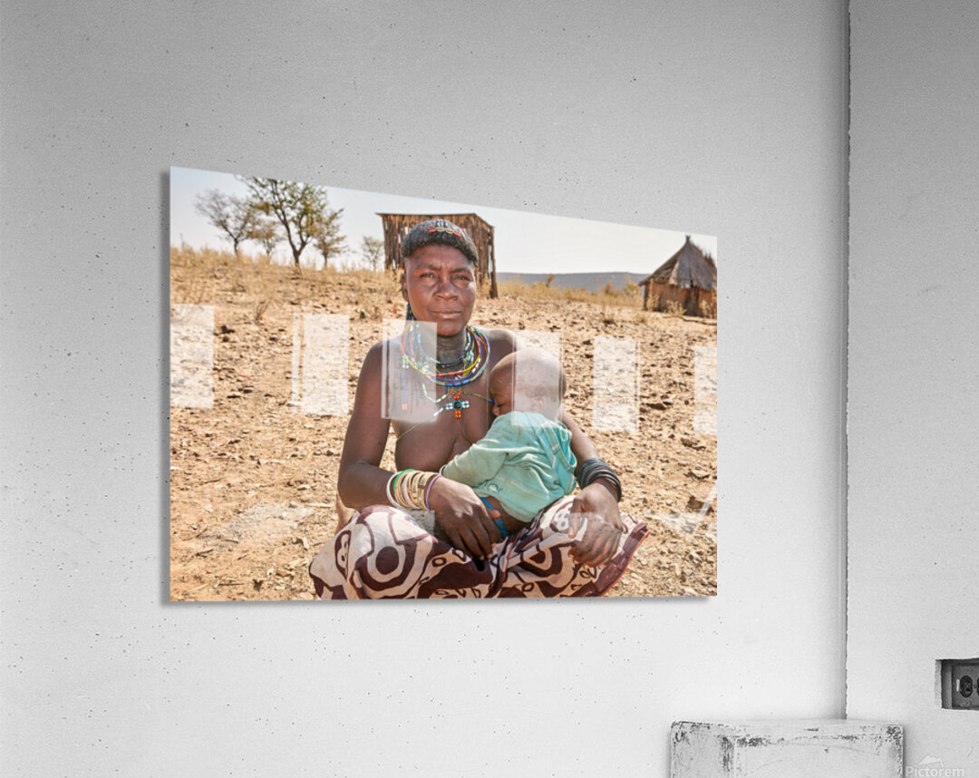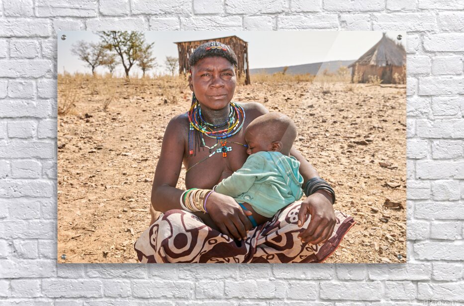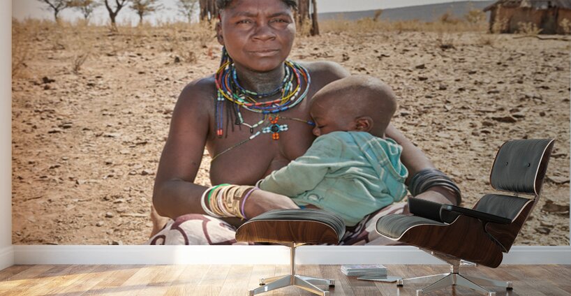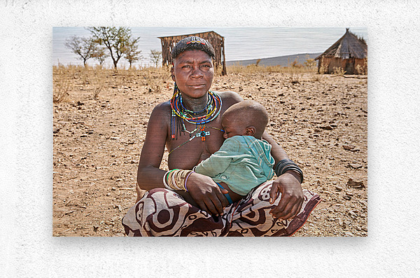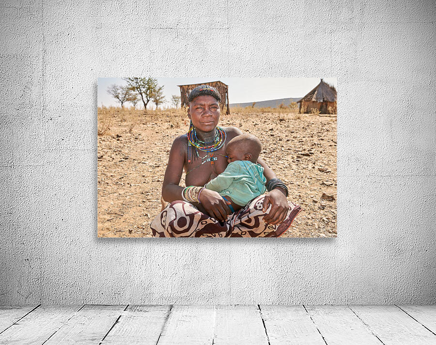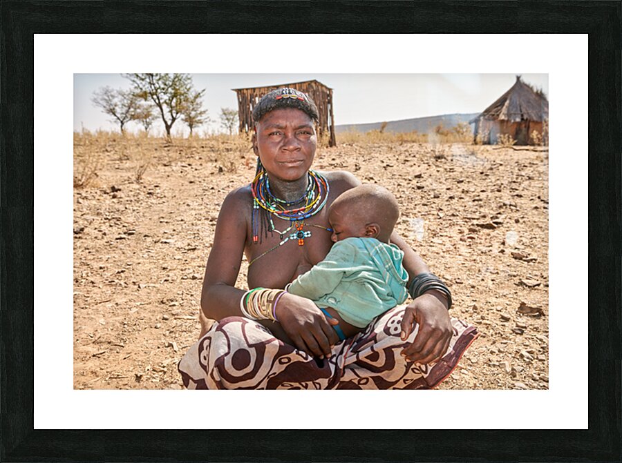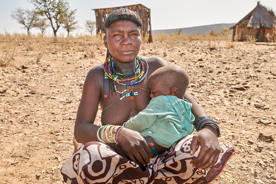 A young woman of the Zemba Bantu ethnic group holds her child in Kunene Region Namibia. The setting shows a dry landscape with huts nearby.
