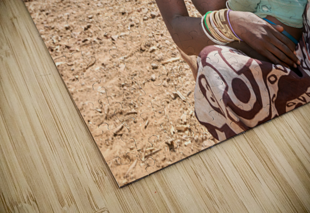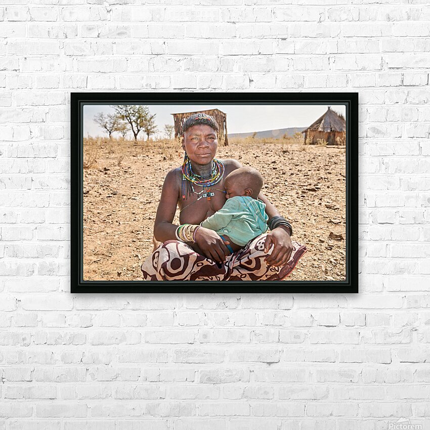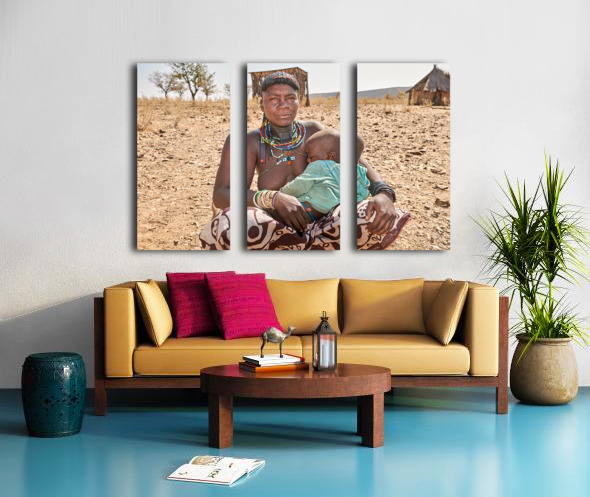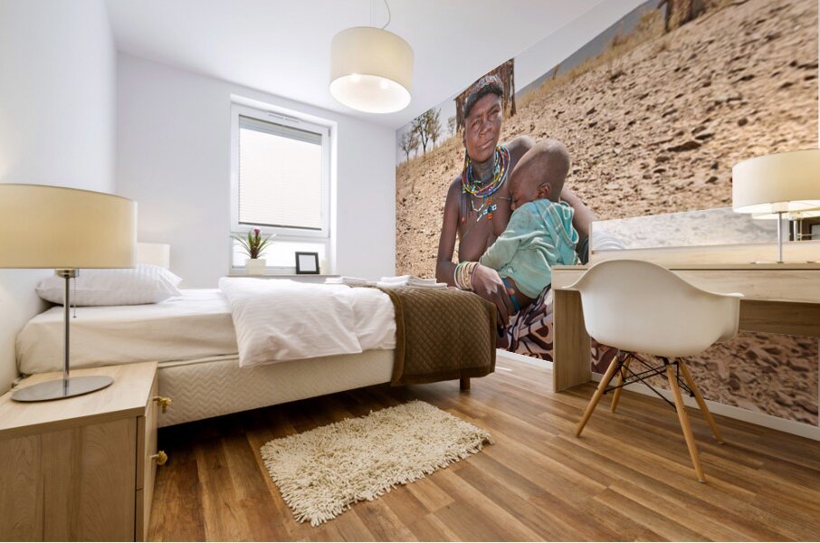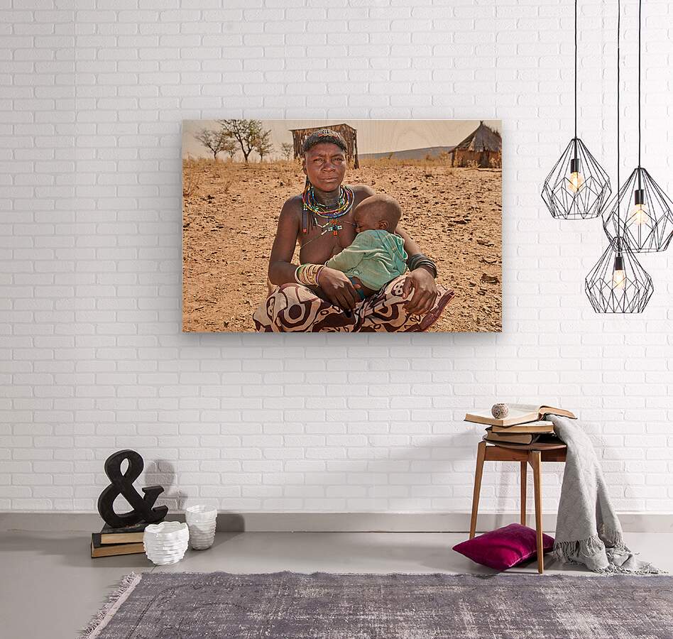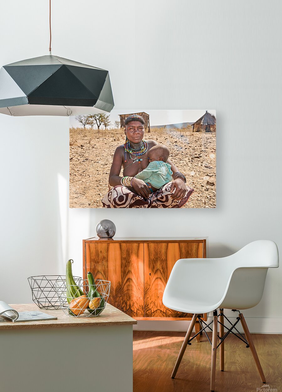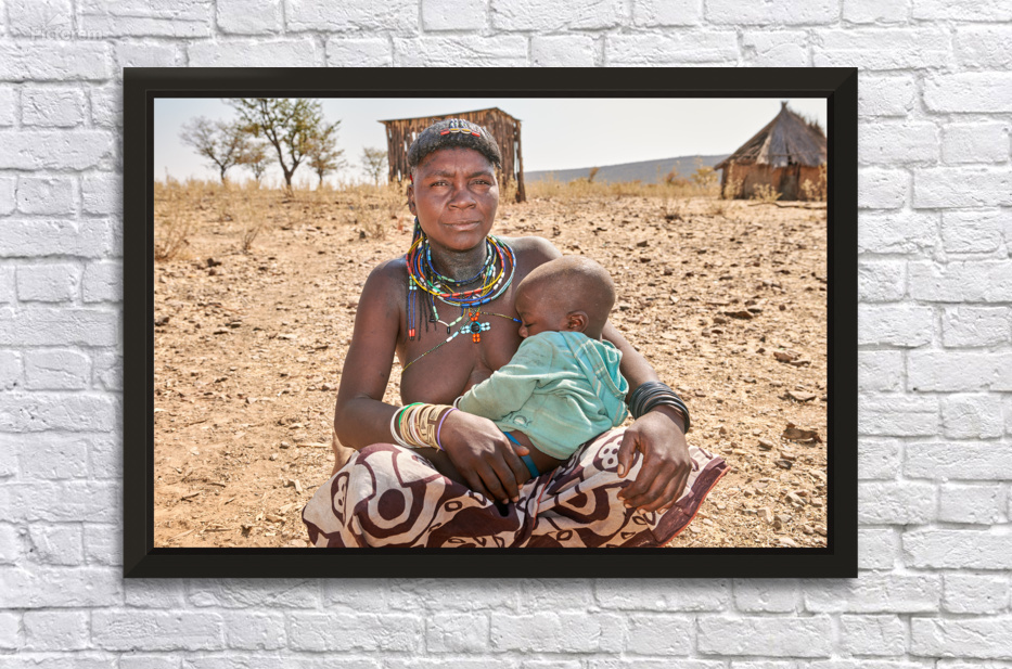 A young woman of the Zemba Bantu ethnic group holds her child in Kunene Region Namibia. The setting shows a dry landscape with huts nearby.
