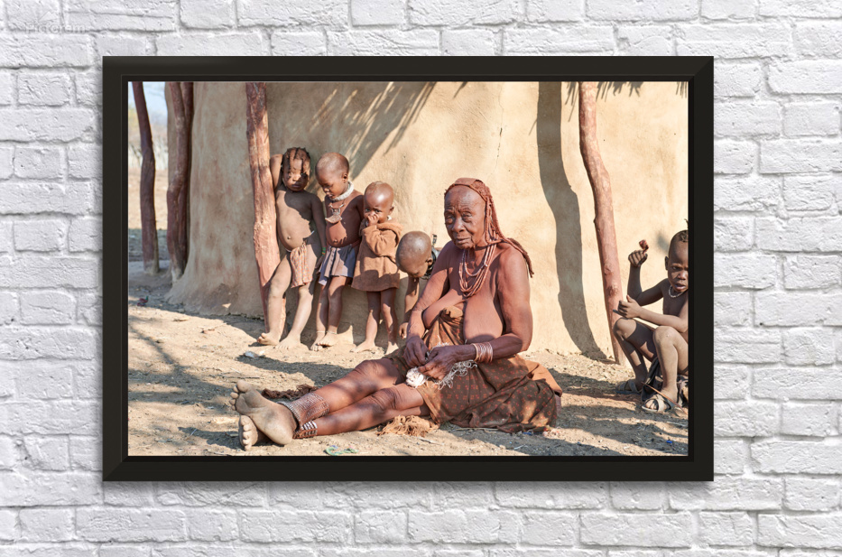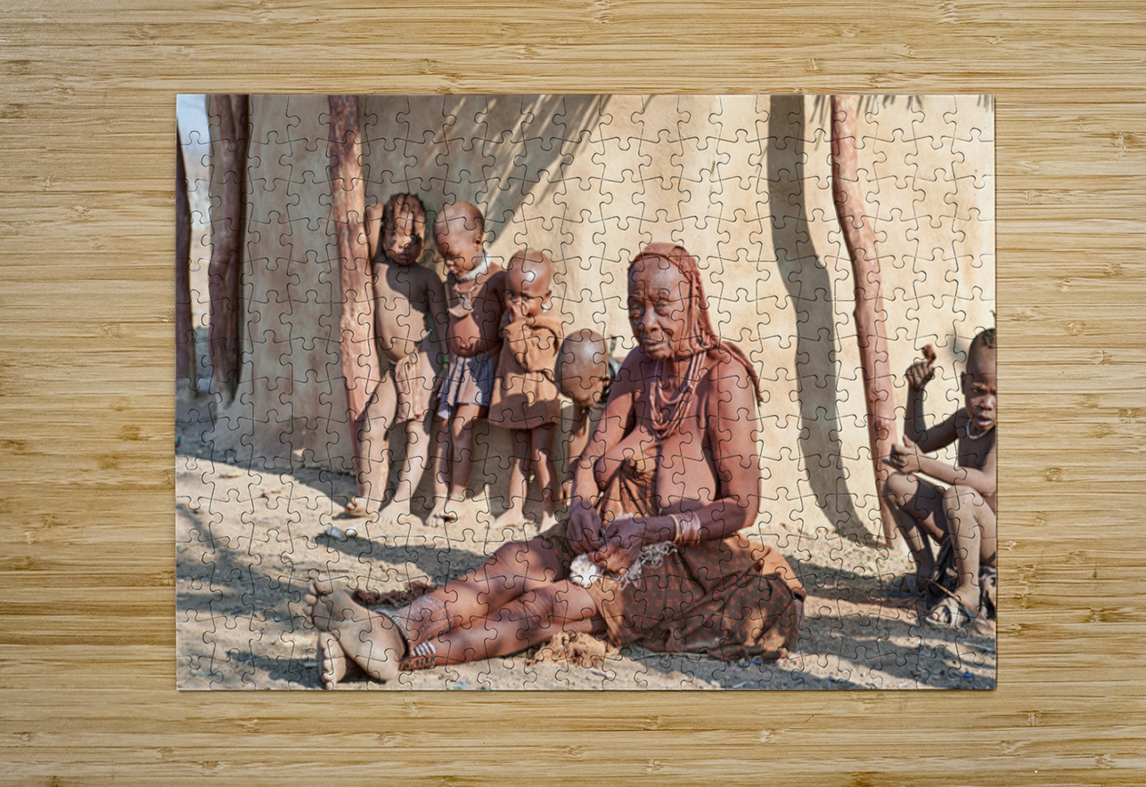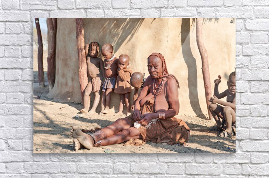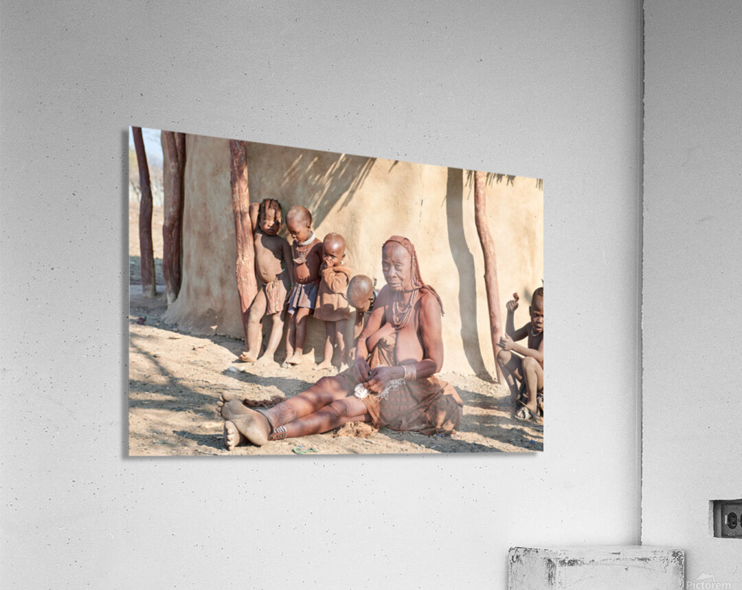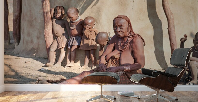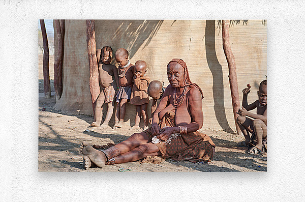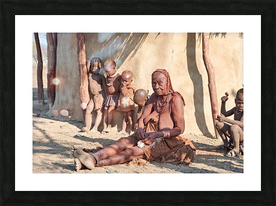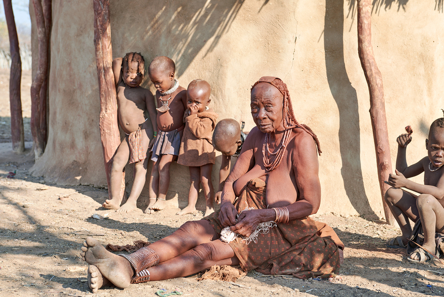 A Himba woman sits outside a hut while children gather around her in a village in Kunene Namibia. Daily activities reflect local culture.