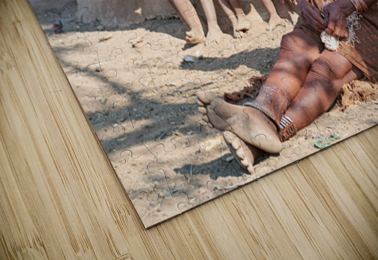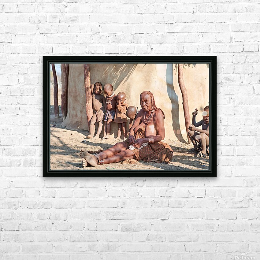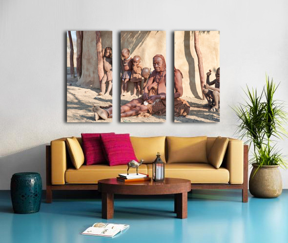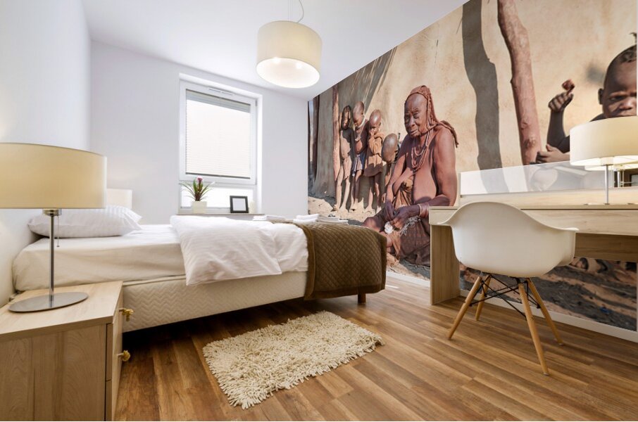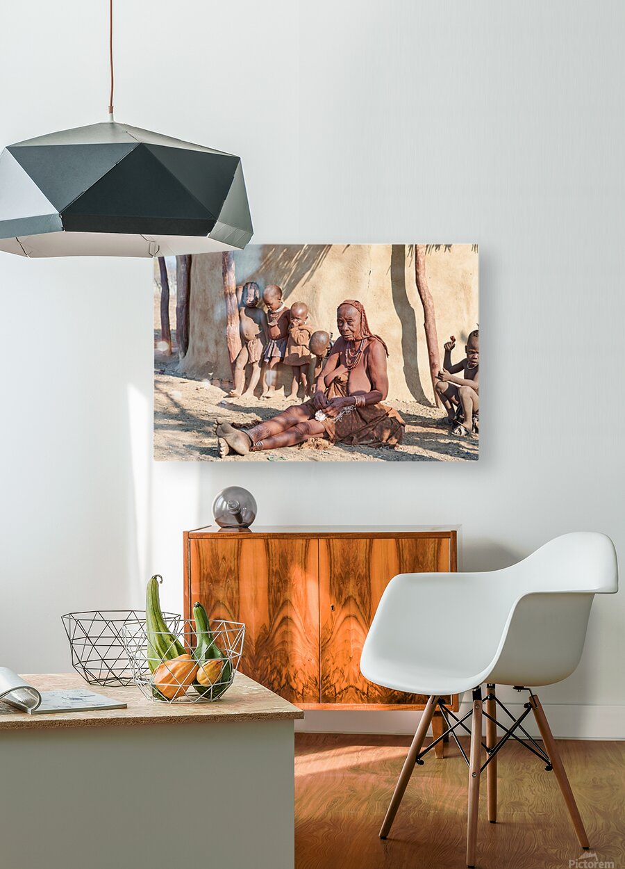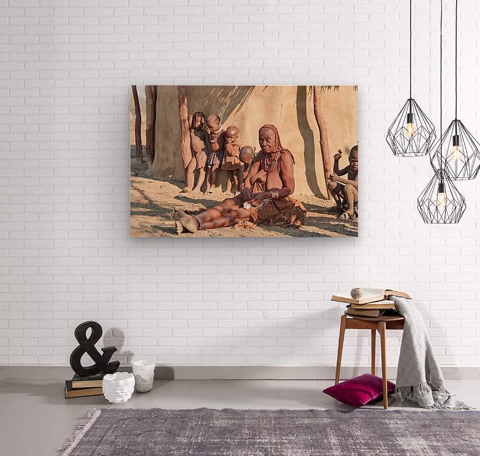 A Himba woman sits outside a hut while children gather around her in a village in Kunene Namibia. Daily activities reflect local culture.