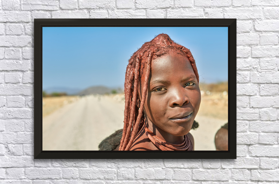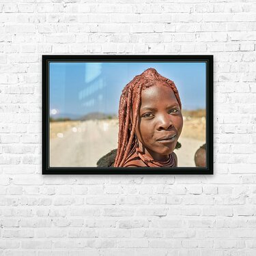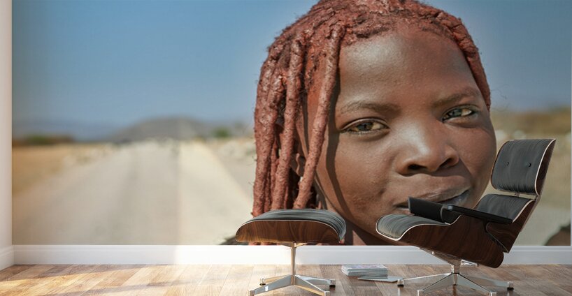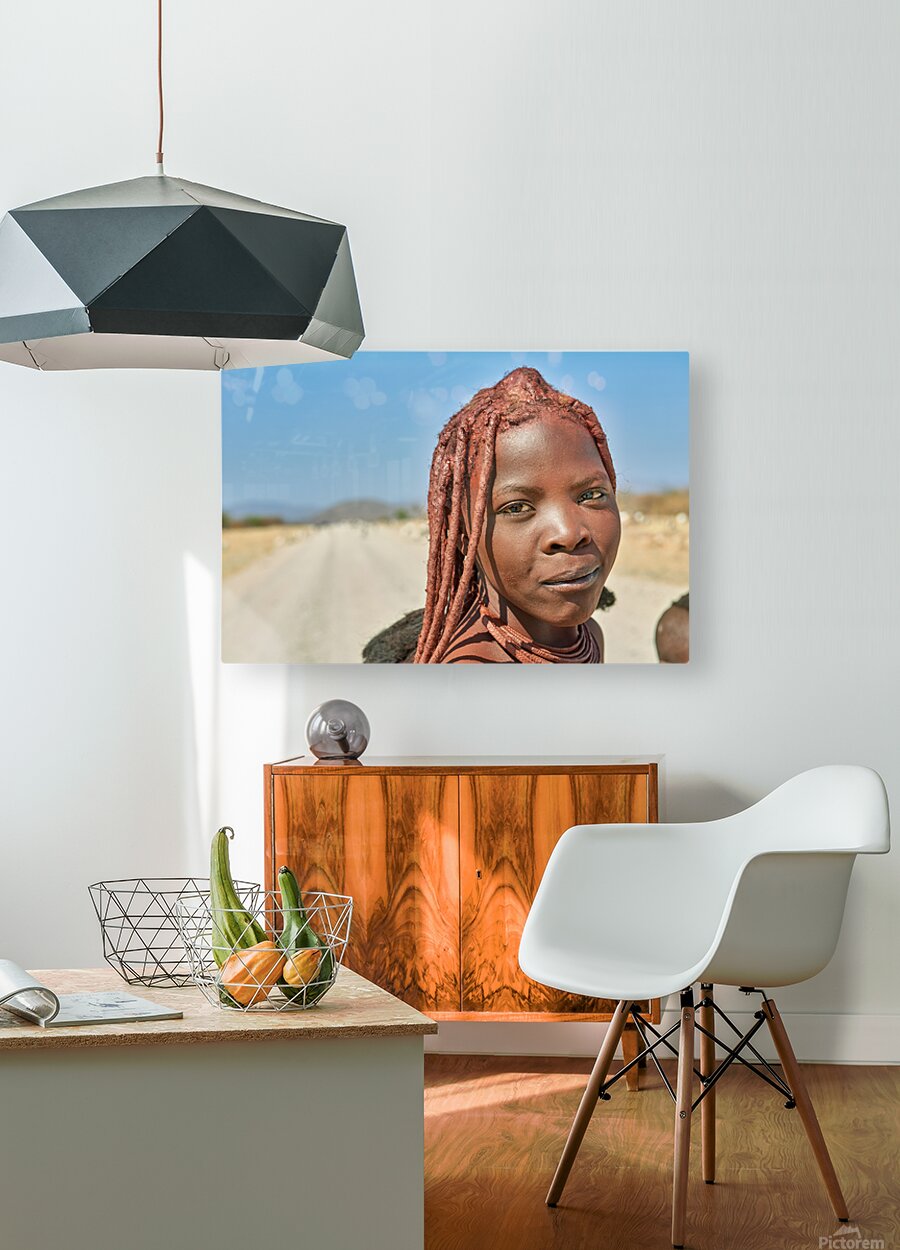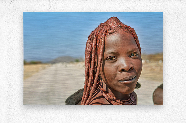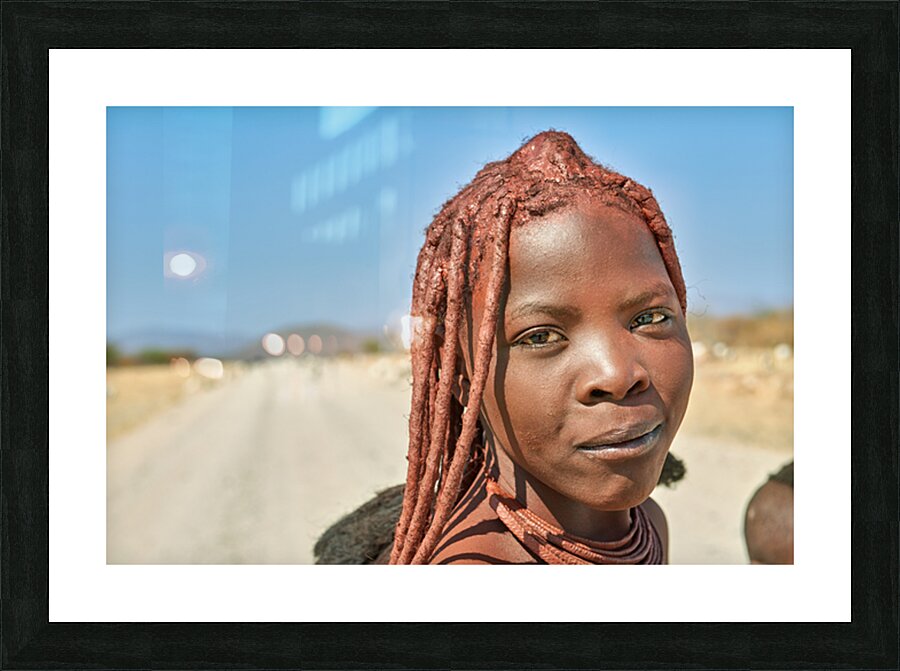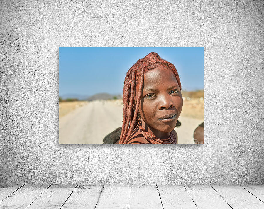 A Himba woman stands on a dirt road in the Kunene region of Namibia. She showcases traditional features with unique hairstyles and accessories.