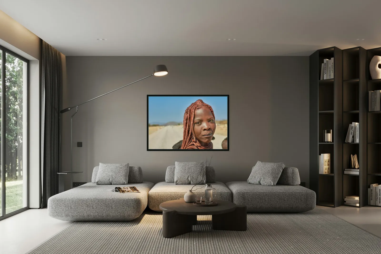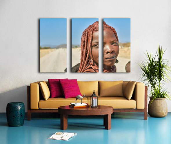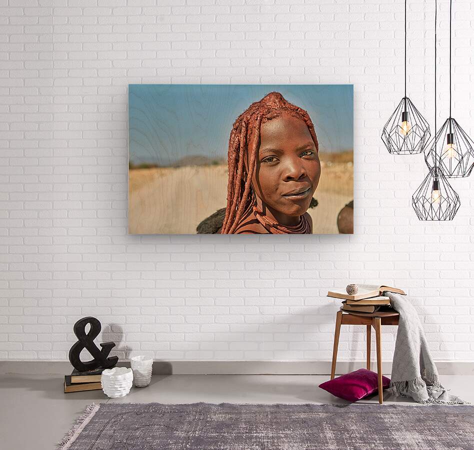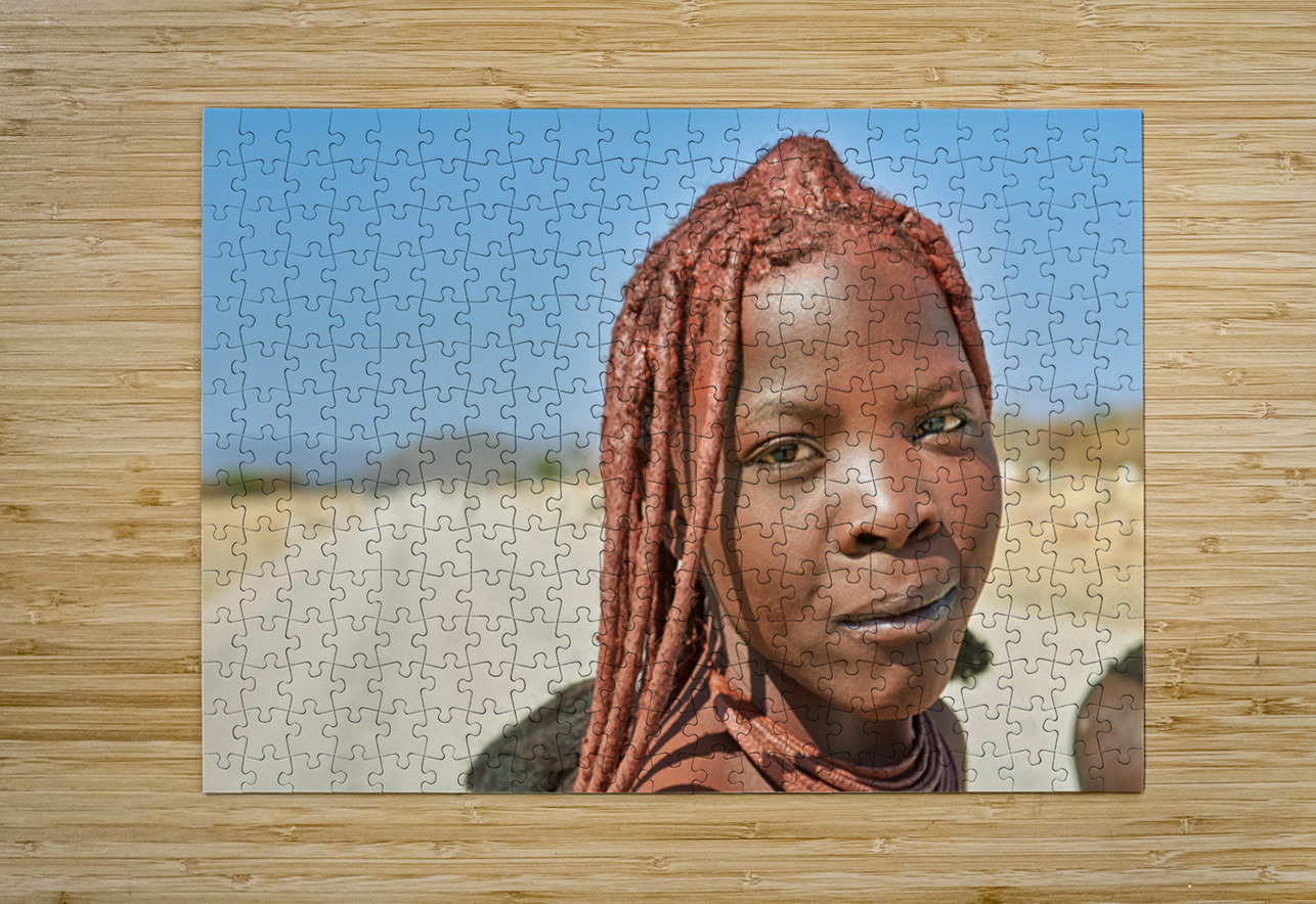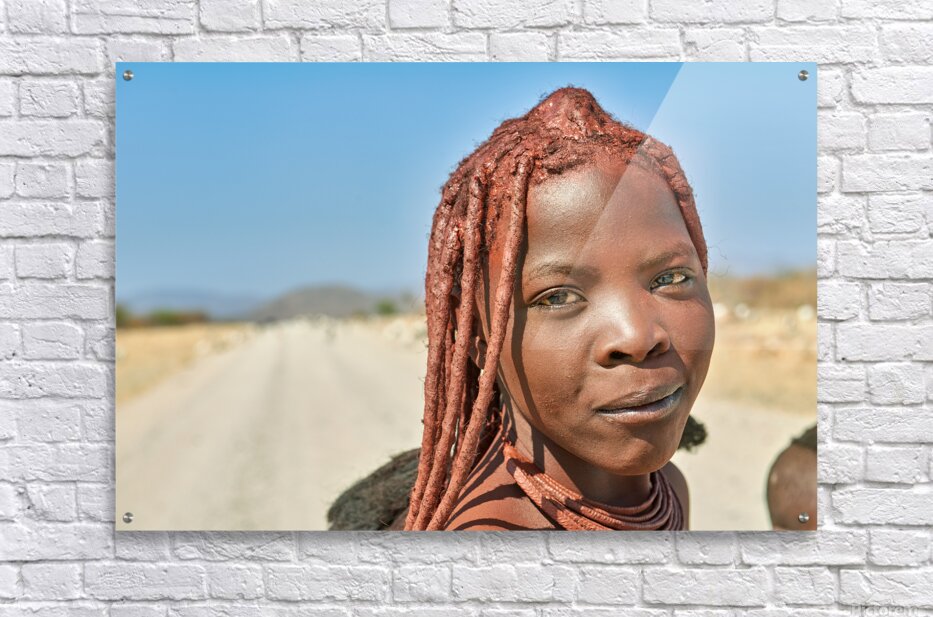 A Himba woman stands on a dirt road in the Kunene region of Namibia. She showcases traditional features with unique hairstyles and accessories.