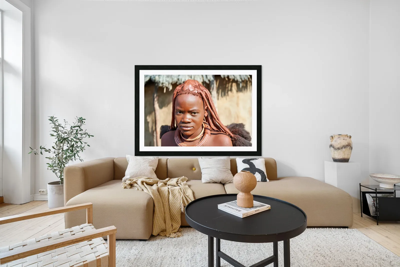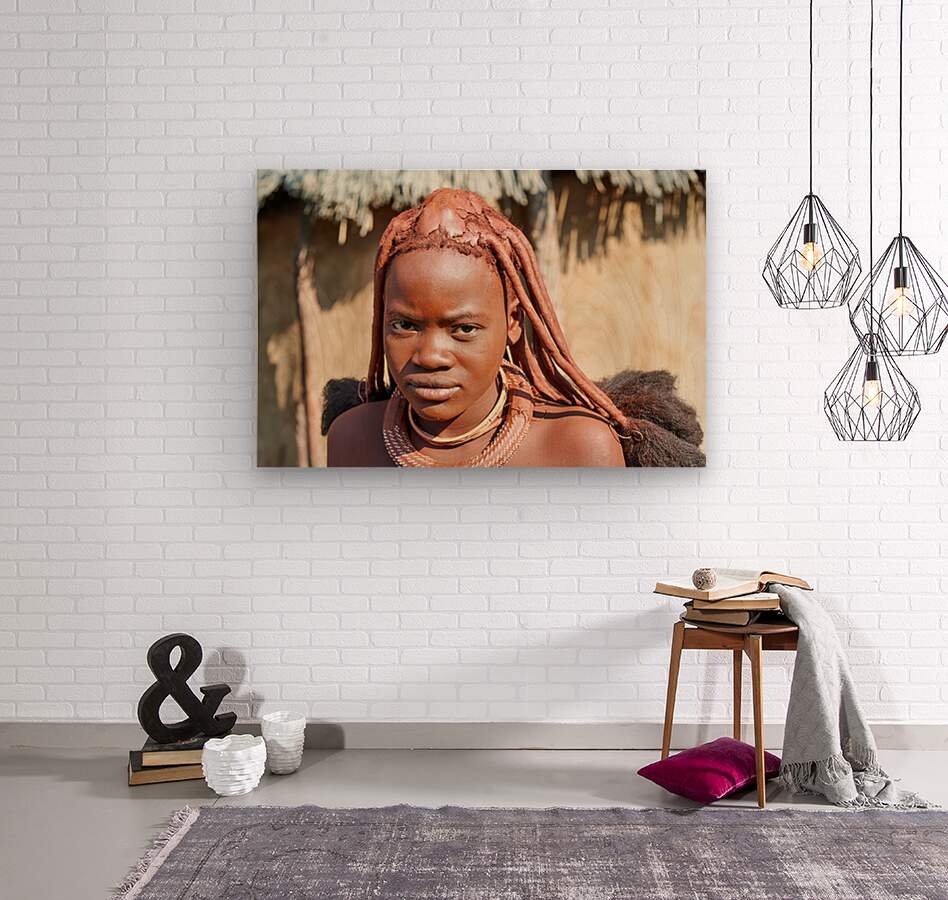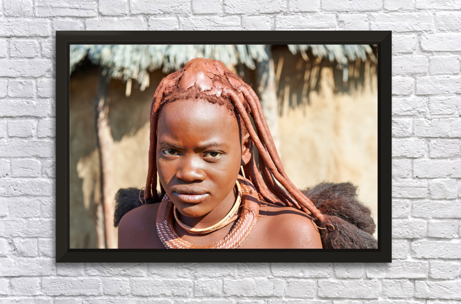 A woman from a Himba village displays her traditional hair headdress. She stands in front of her home in Kunene Region Namibia.