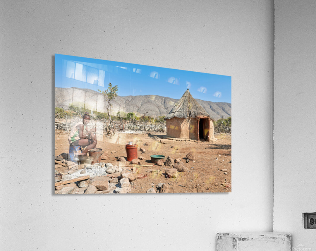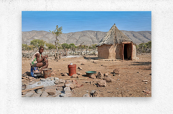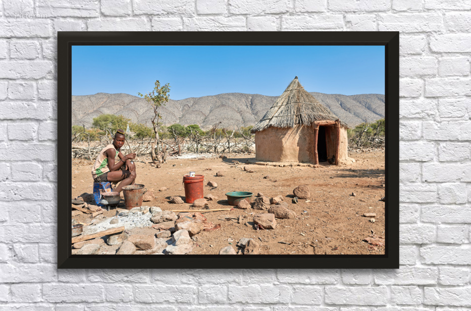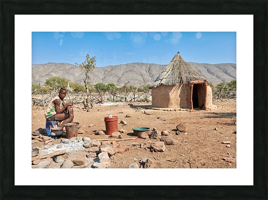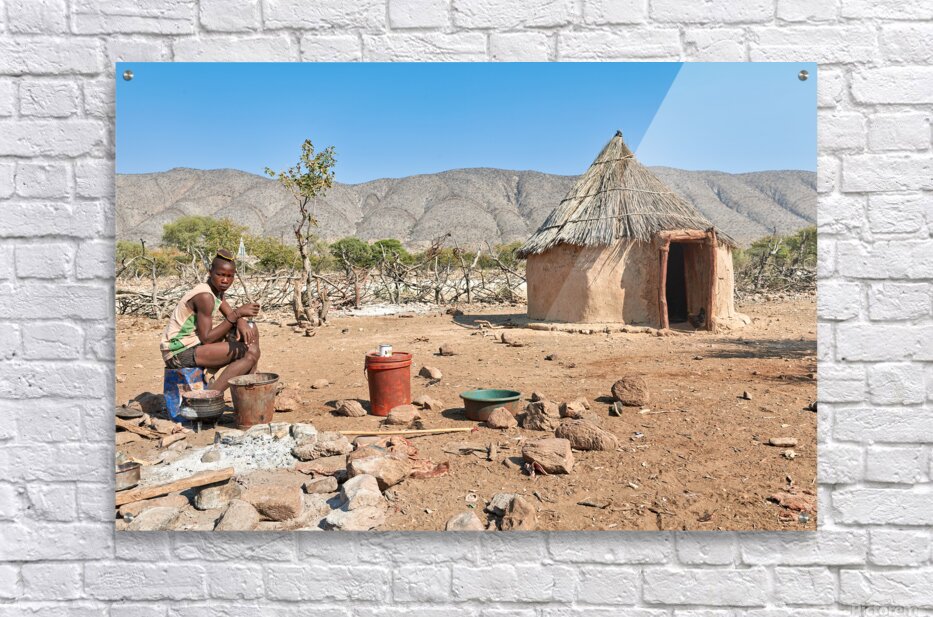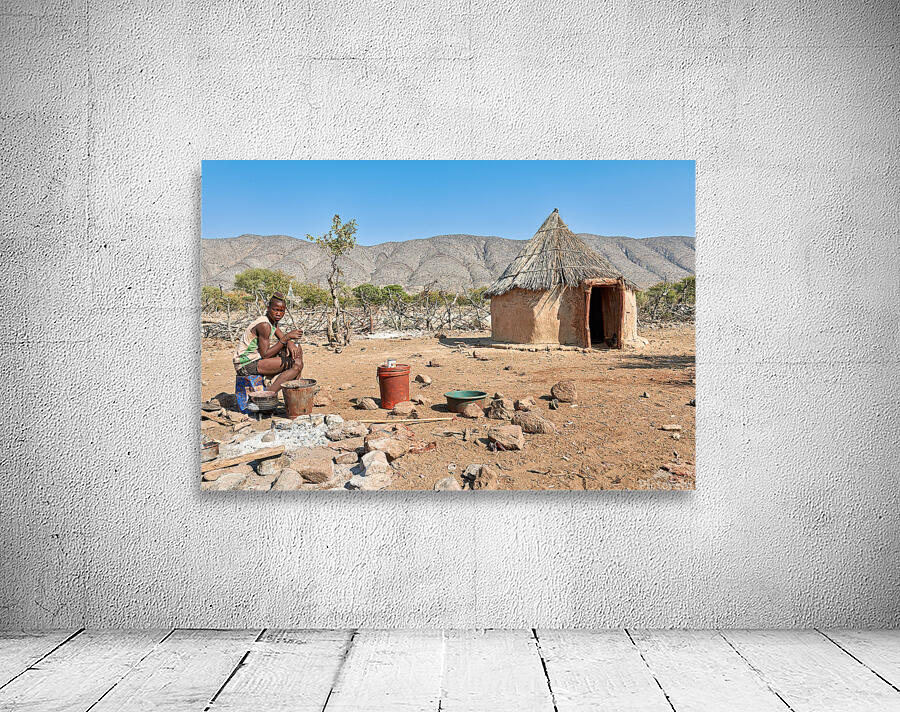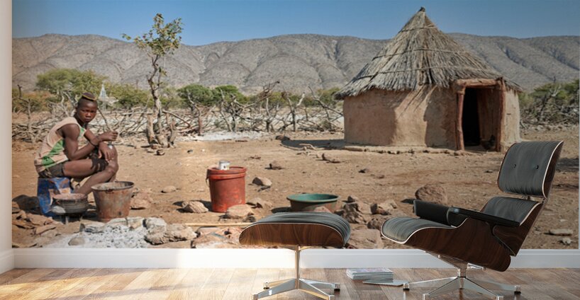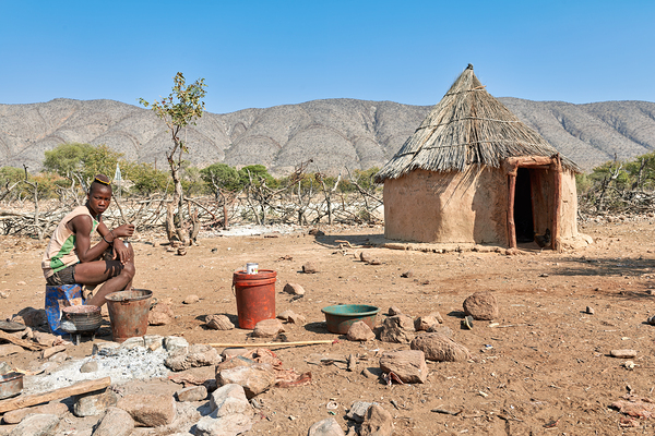A young man sits by a fire outside his hut in a Himba village in the Kunene region of Namibia. The mountains are in the background.