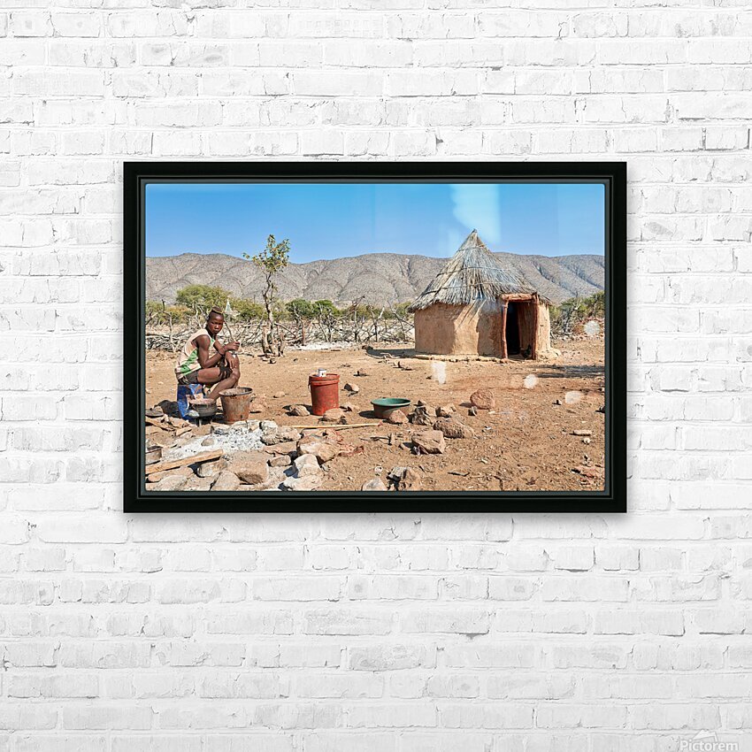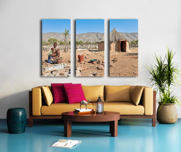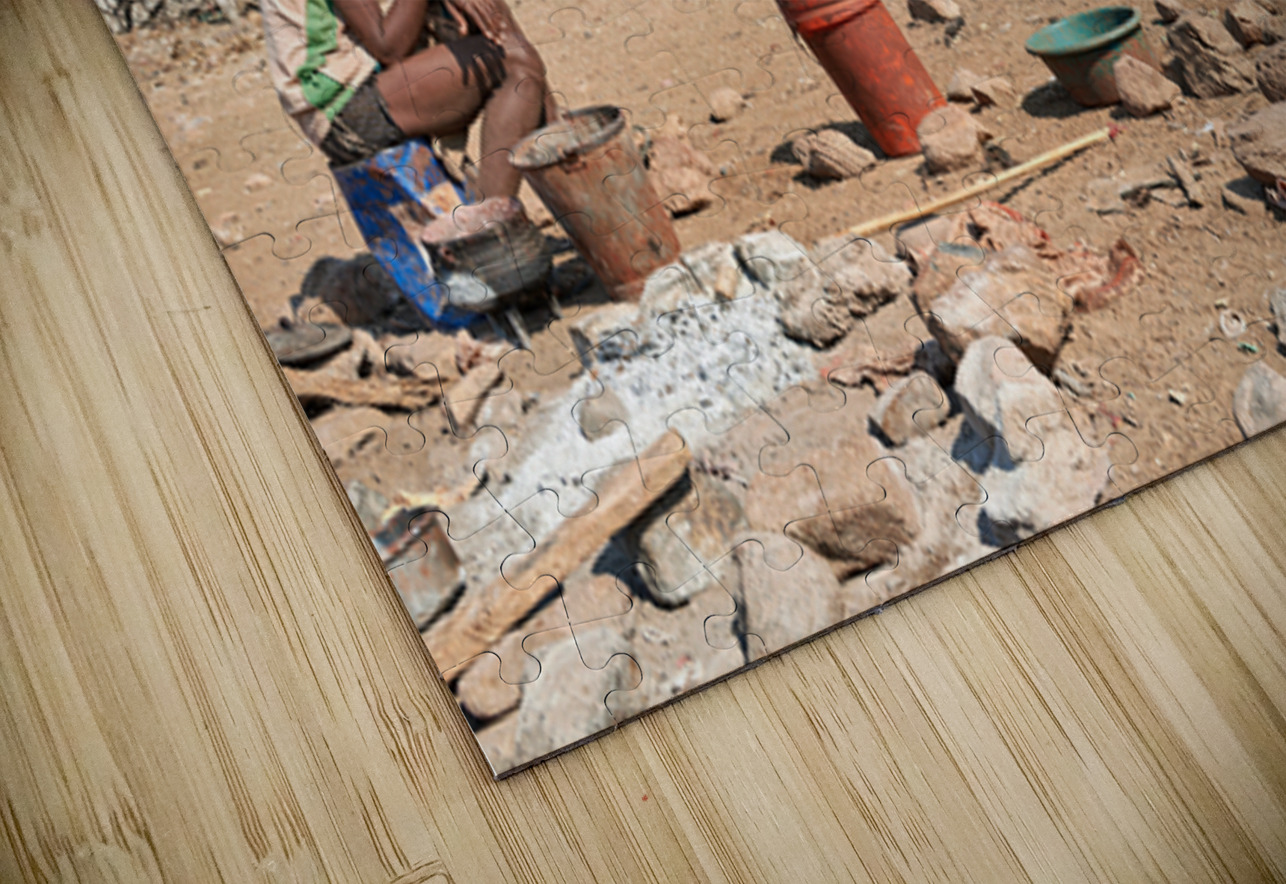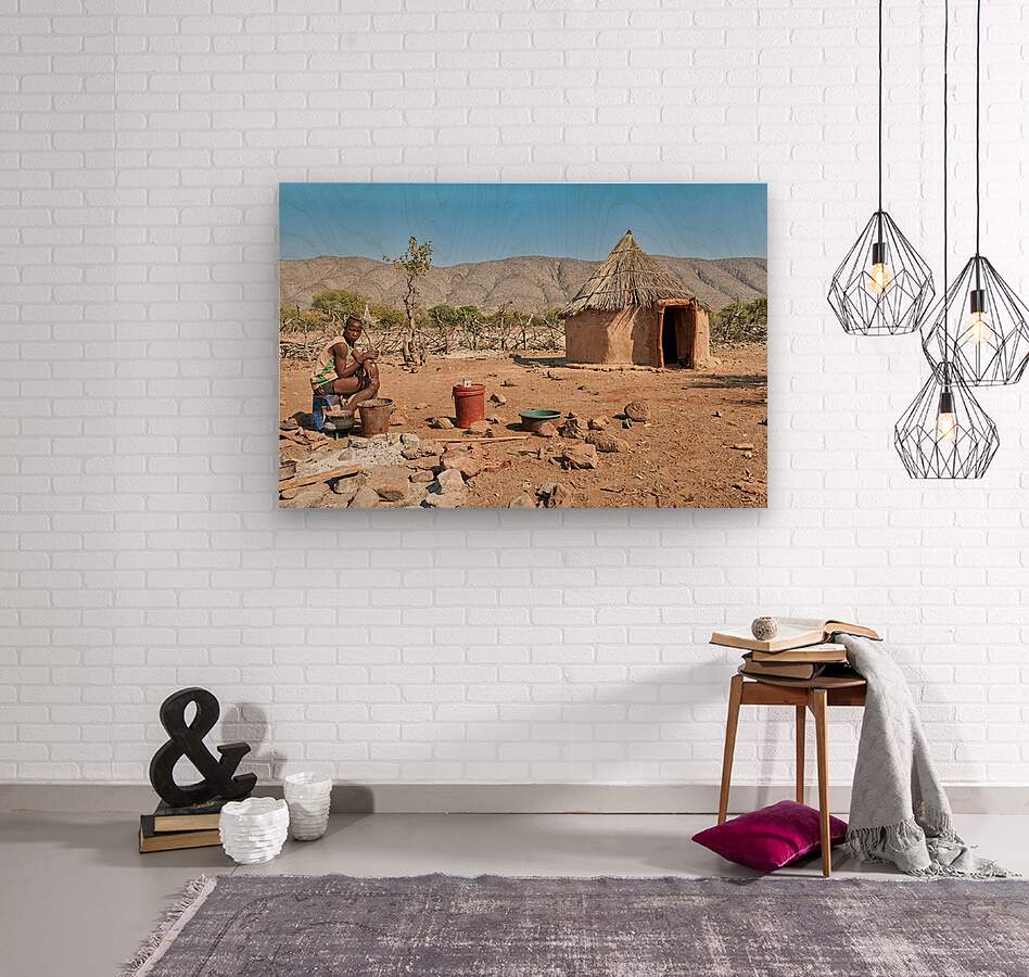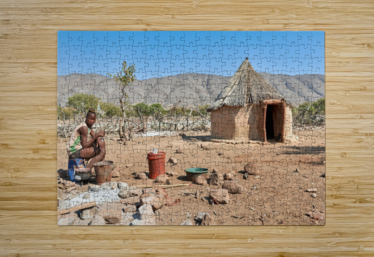 A young man sits by a fire outside his hut in a Himba village in the Kunene region of Namibia. The mountains are in the background.