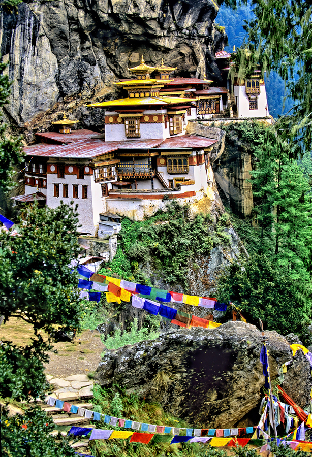 ICONIC BHUTANESE MONASTERY ON A CLIFF SURROUNDED BY PRAYER FLAG