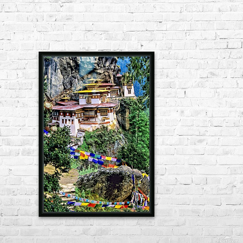 Iconic Bhutanese monastery on a cliff surrounded by prayer flag Picture Frame Printing