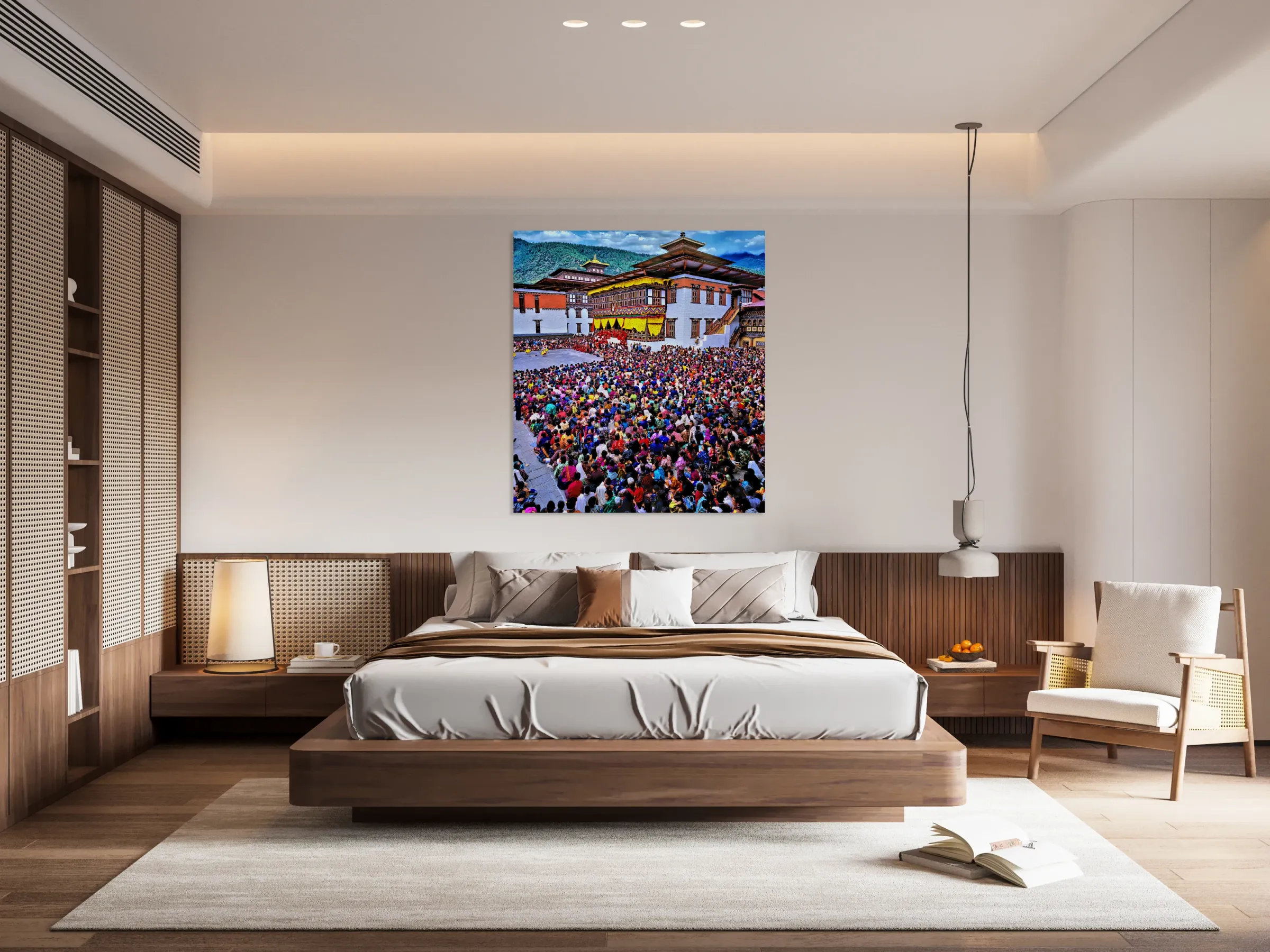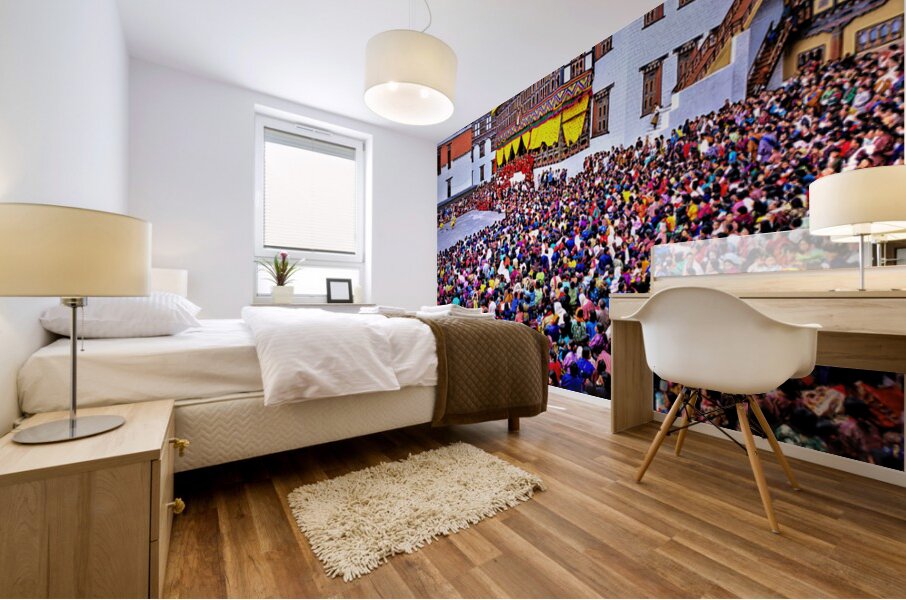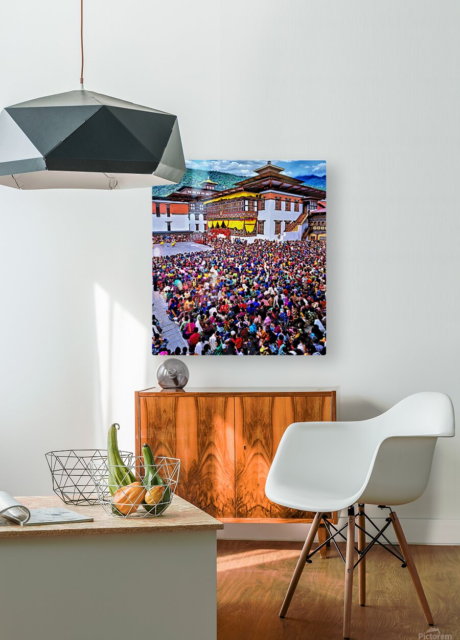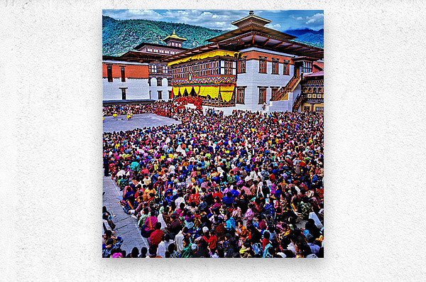 Large crowd at a traditional Bhutanese festival. Wood print