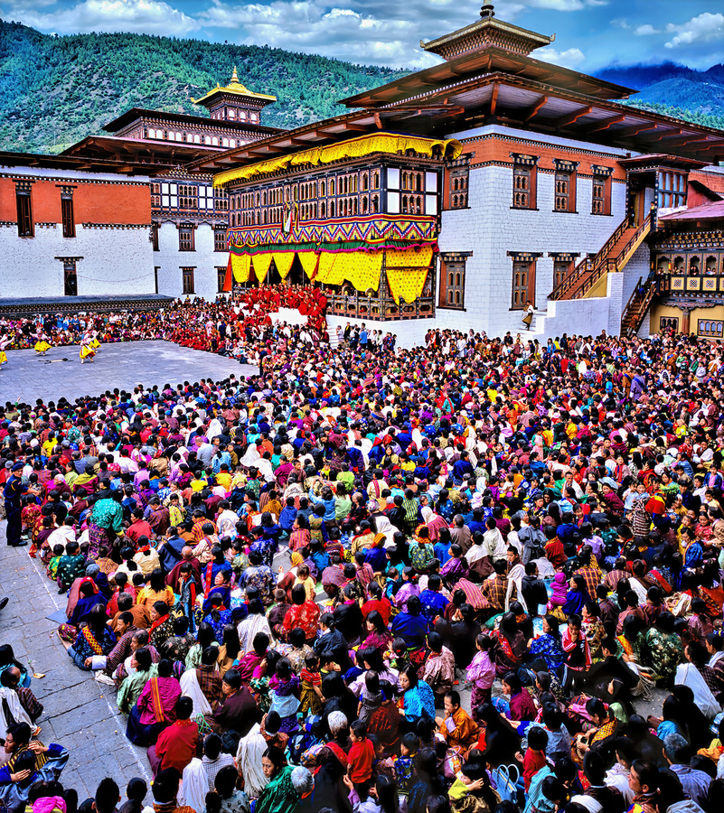 Thousands gather at a Bhutanese Dzong for a Tsechu festival watching traditional masked dances and cultural performances in a vibrant display.
