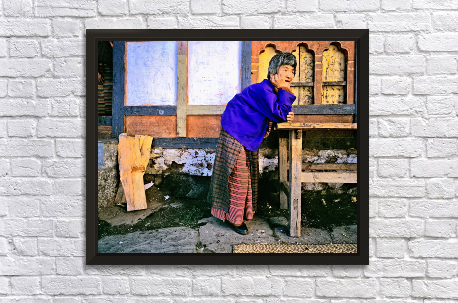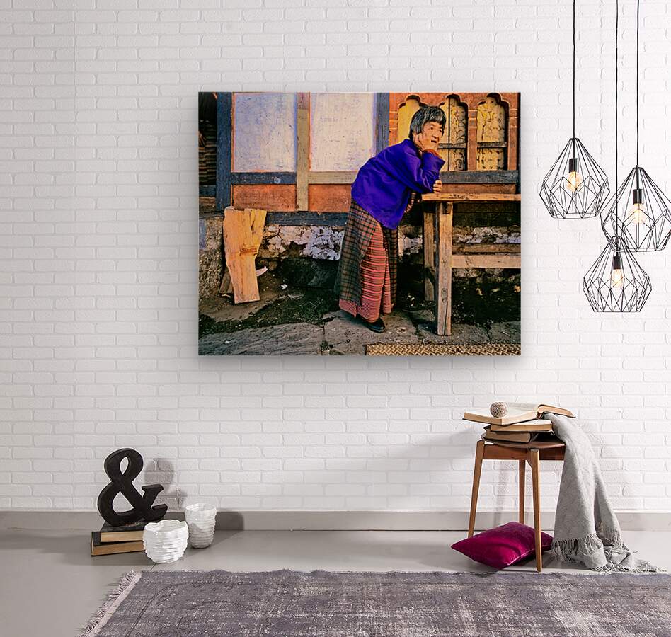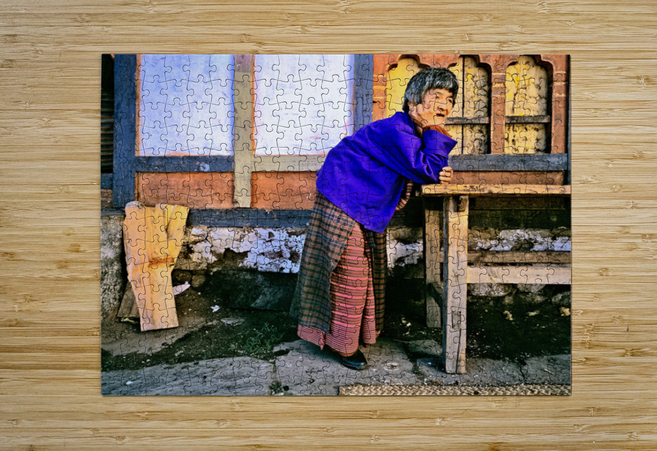An elderly Bhutanese woman in traditional attire leans on a wooden railing observing her village surroundings with a gentle knowing expression.