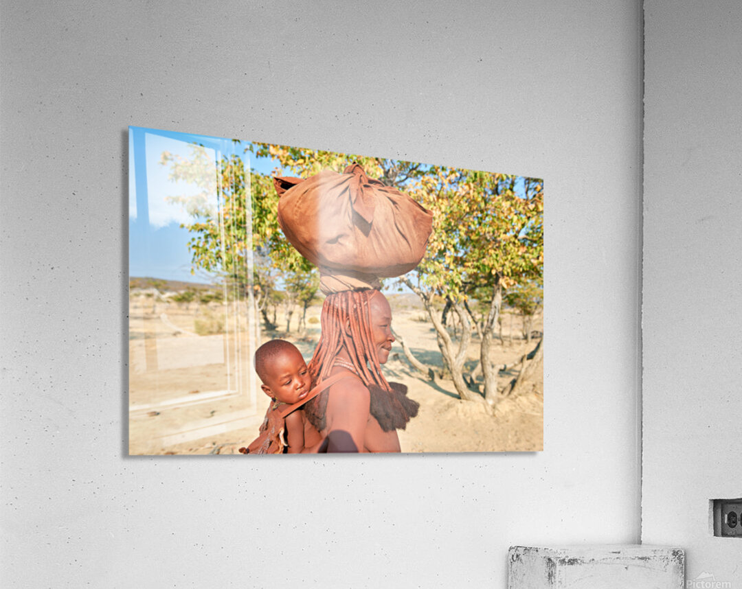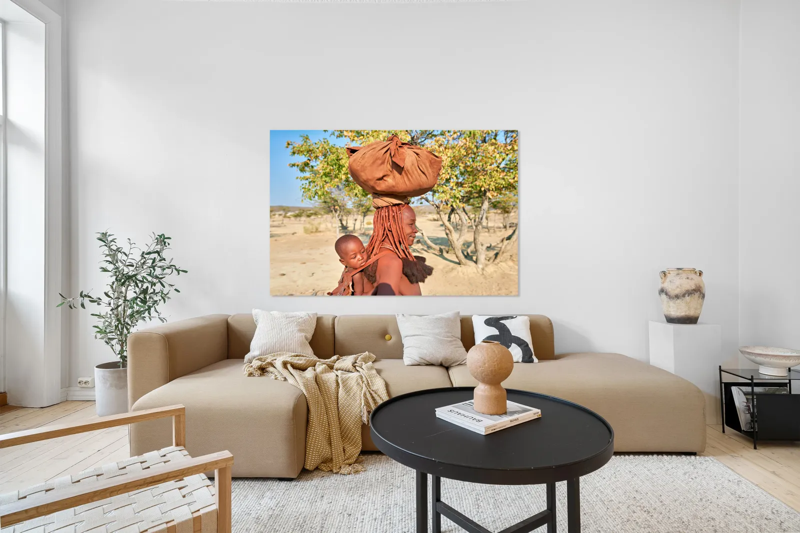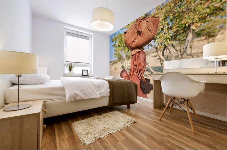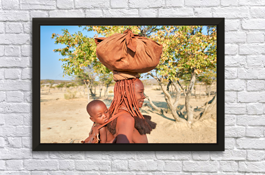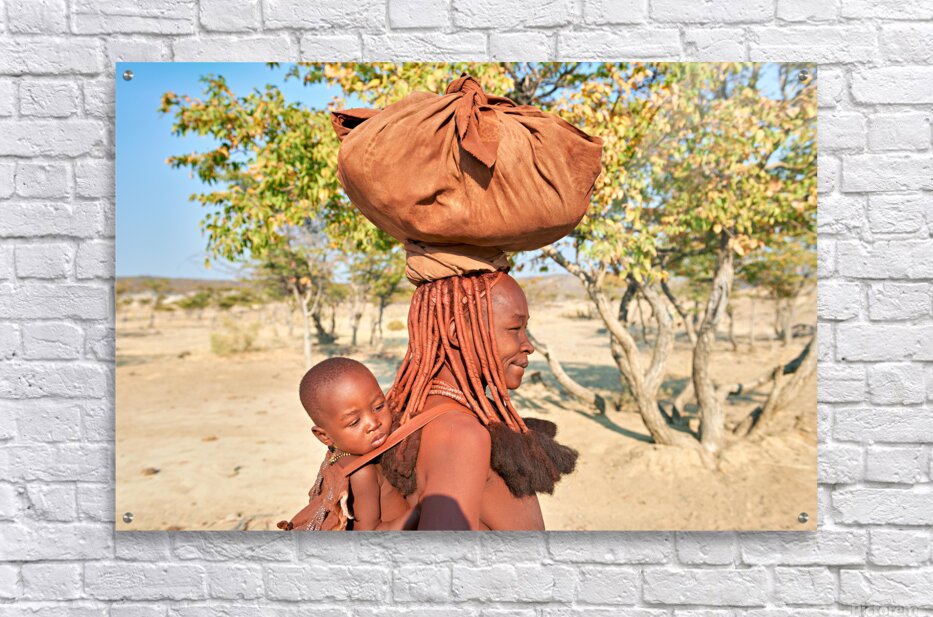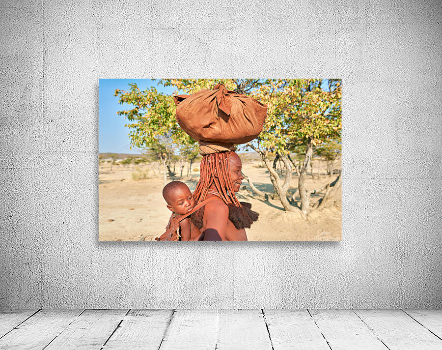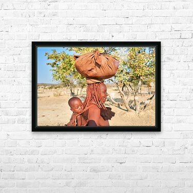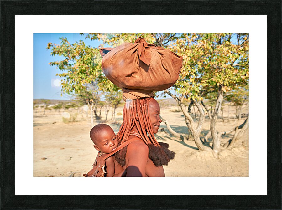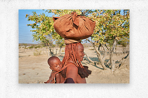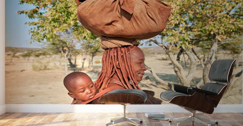 A Himba woman walks with her baby on her back in the Kunene region of Namibia. They are surrounded by trees and dry land.