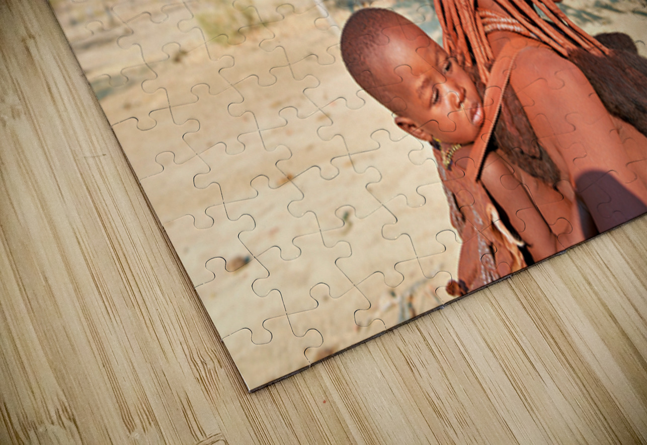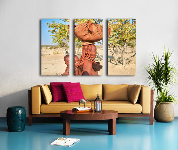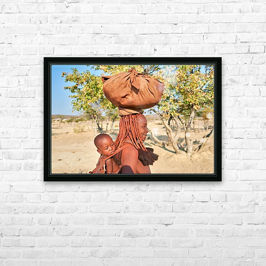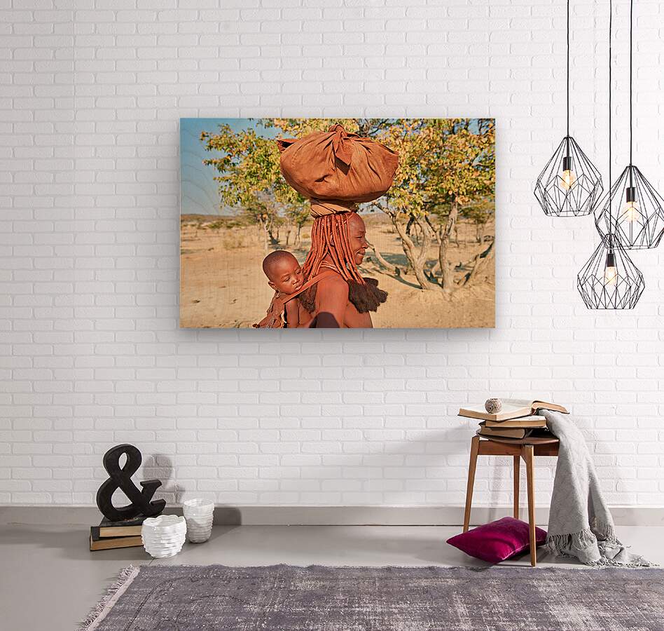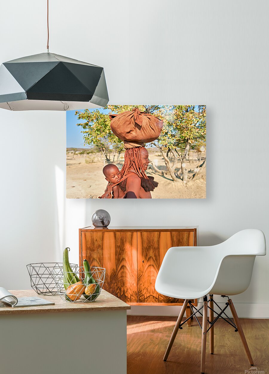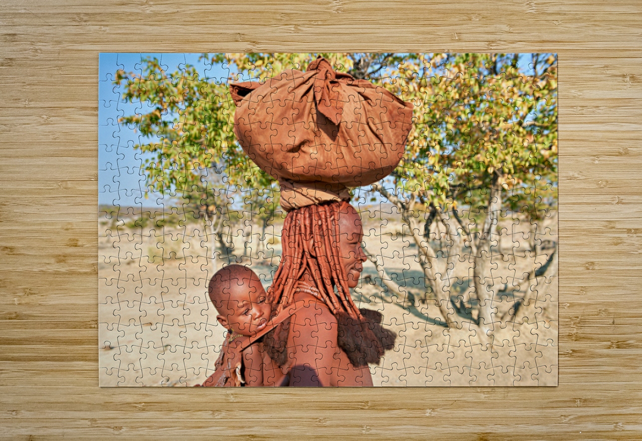 A Himba woman walks with her baby on her back in the Kunene region of Namibia. They are surrounded by trees and dry land.