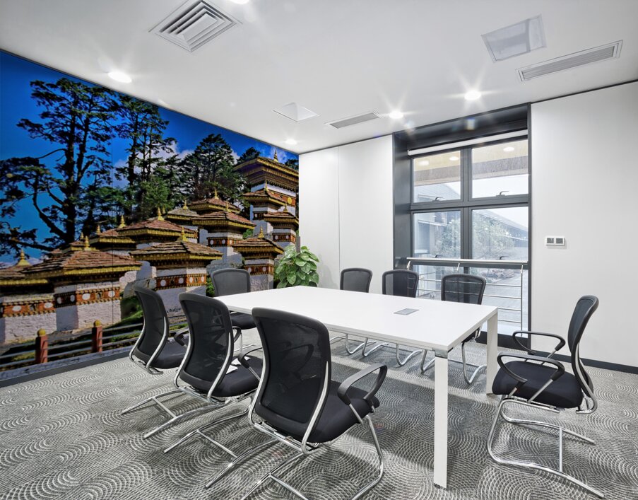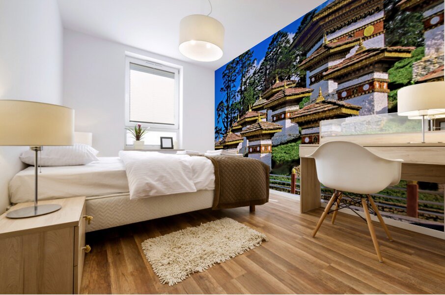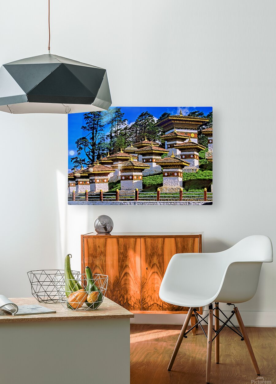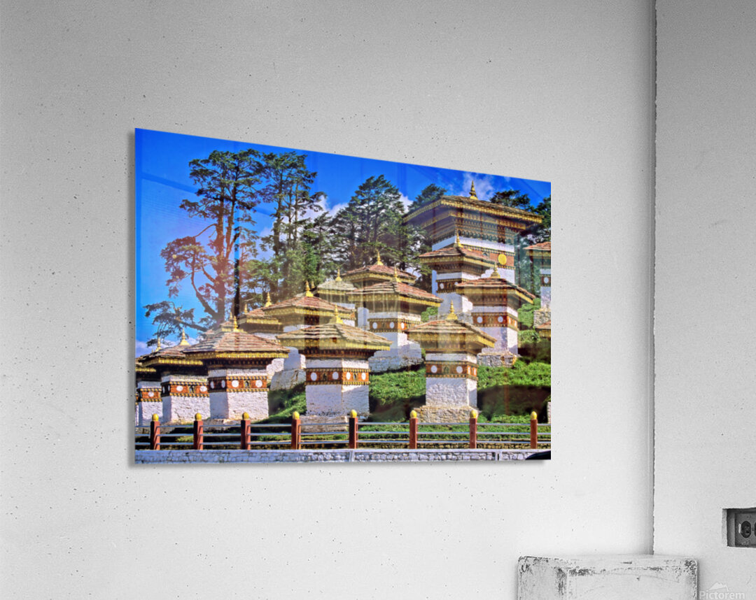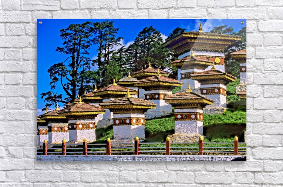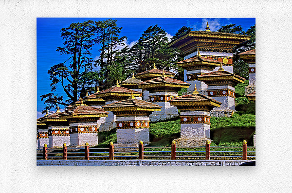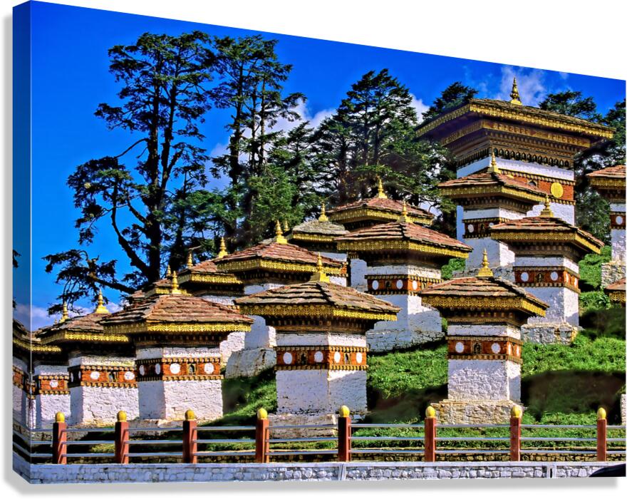 ABOUT THIS ARTWORK: DRUK WANGYAL CHORTENS BHUTAN WITH LUSH TREES AND BLUE SKY.