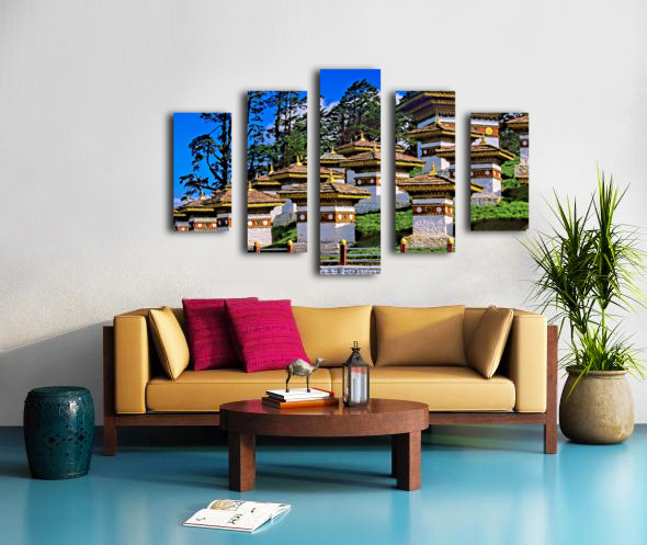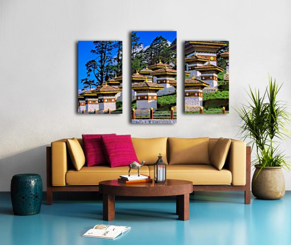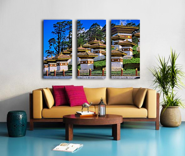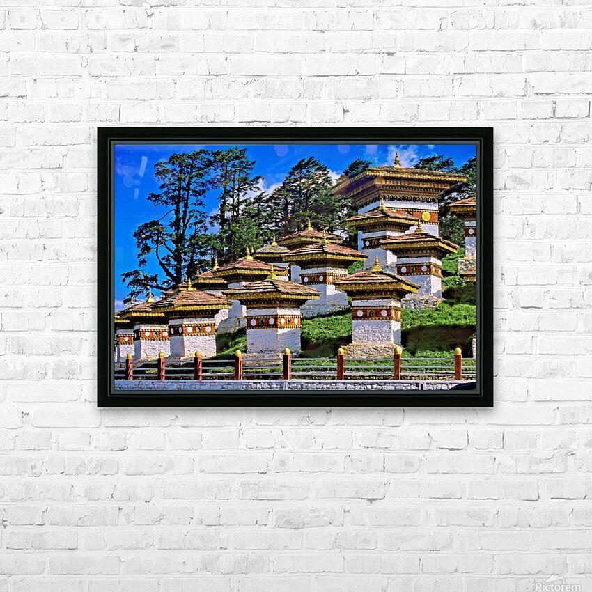 Druk Wangyal Chortens Bhutan with lush trees and blue sky. Frame print