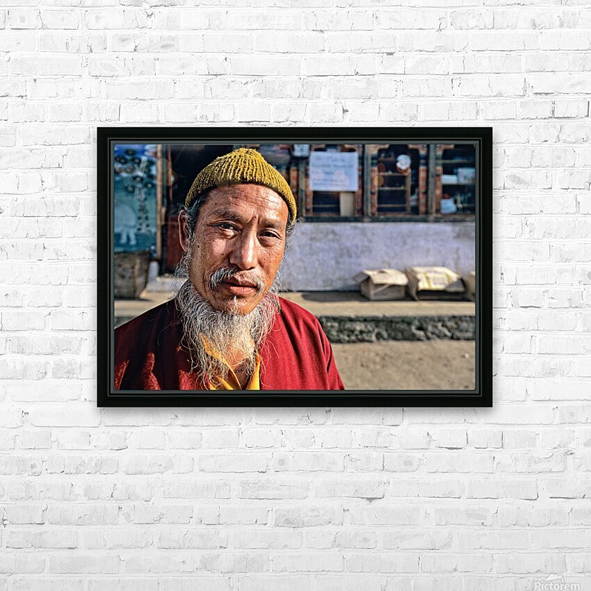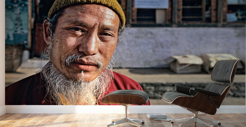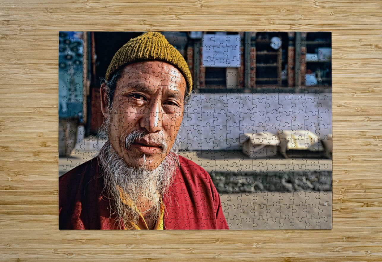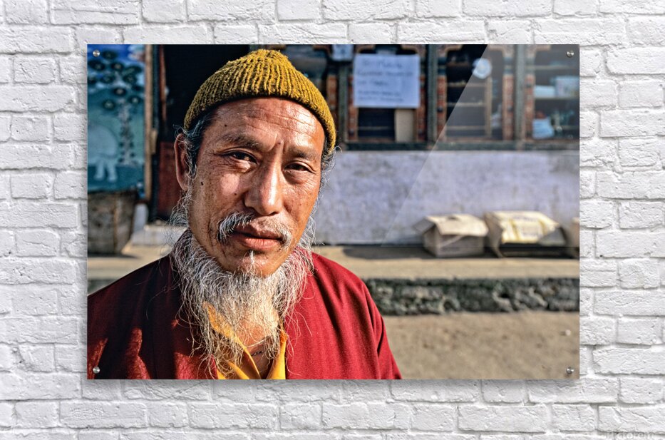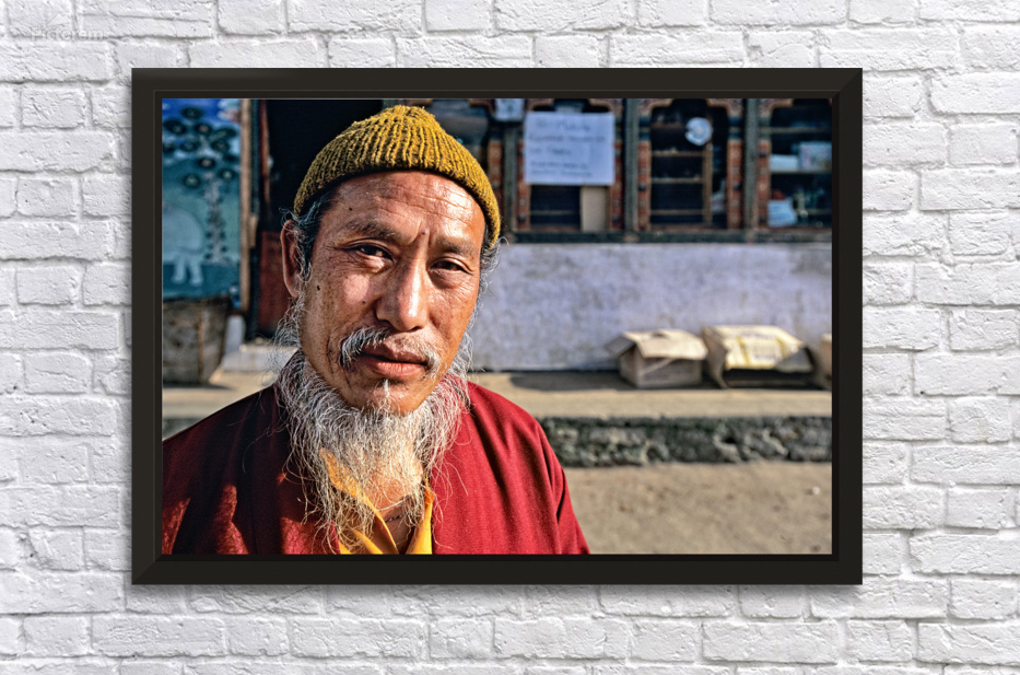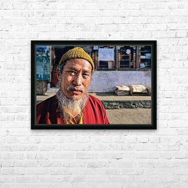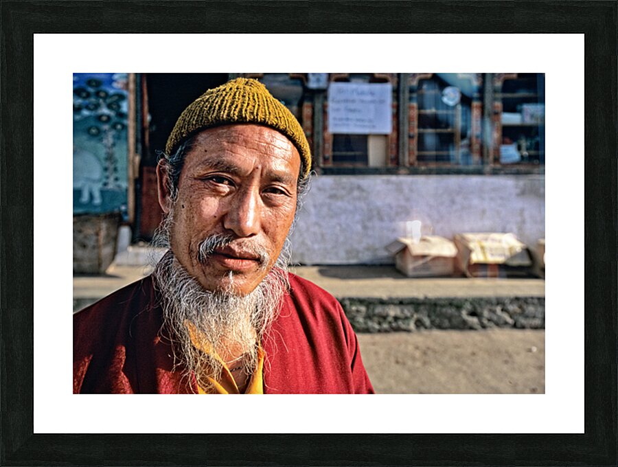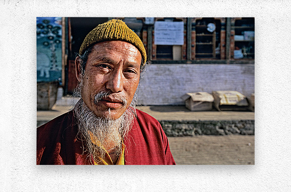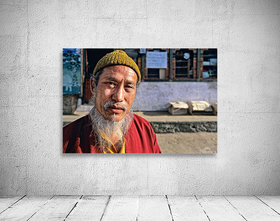 An elderly man in traditional attire with a long white beard and yellow hat poses for a portrait on a street in Bhutan reflecting local culture.