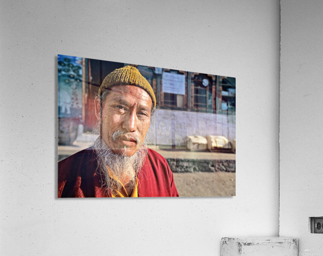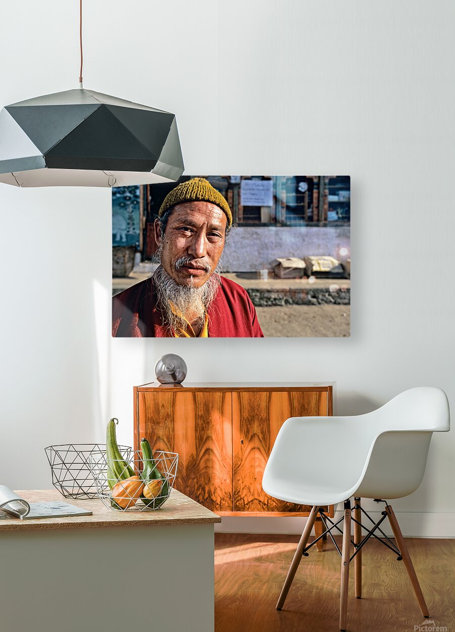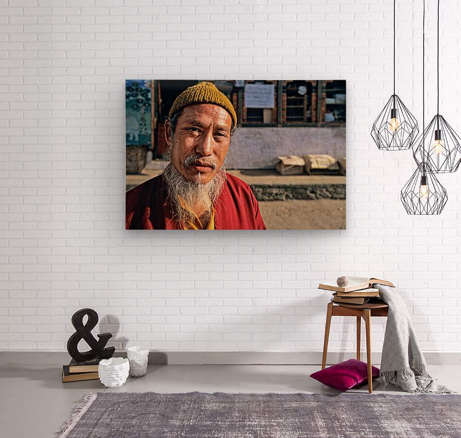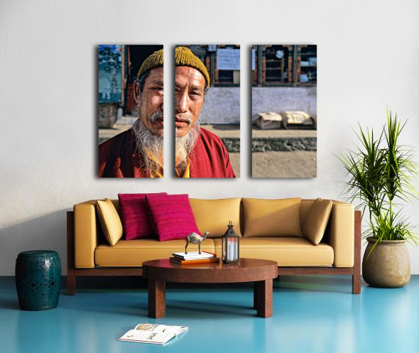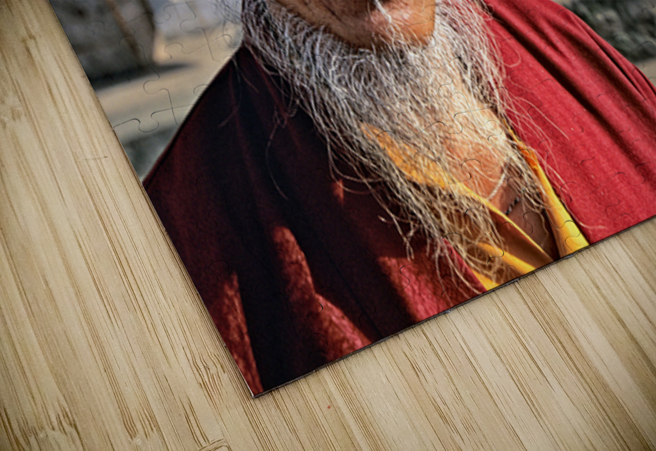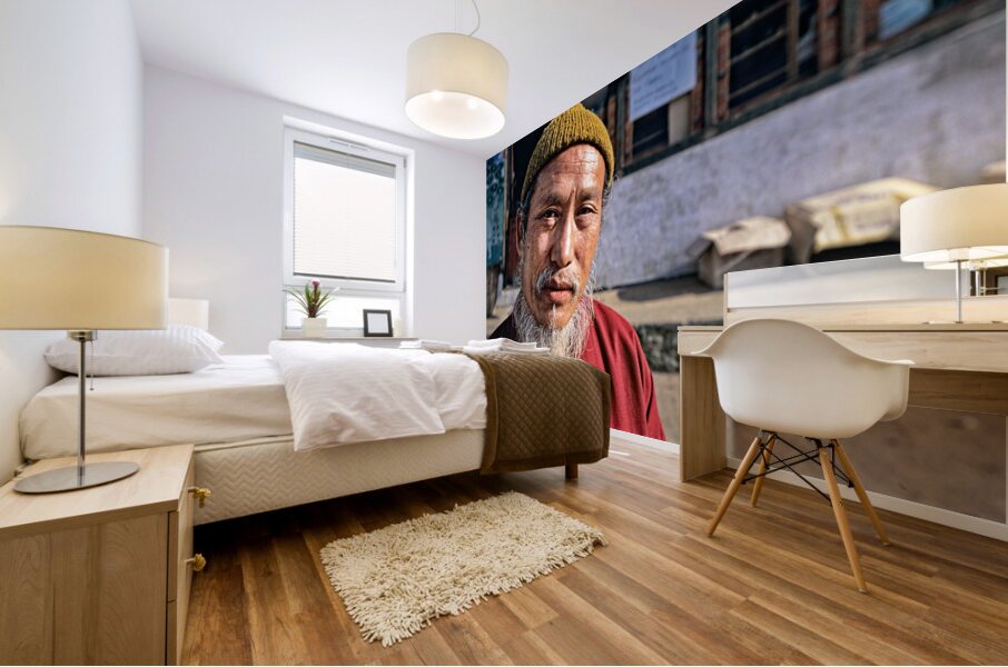 An elderly man in traditional attire with a long white beard and yellow hat poses for a portrait on a street in Bhutan reflecting local culture.