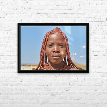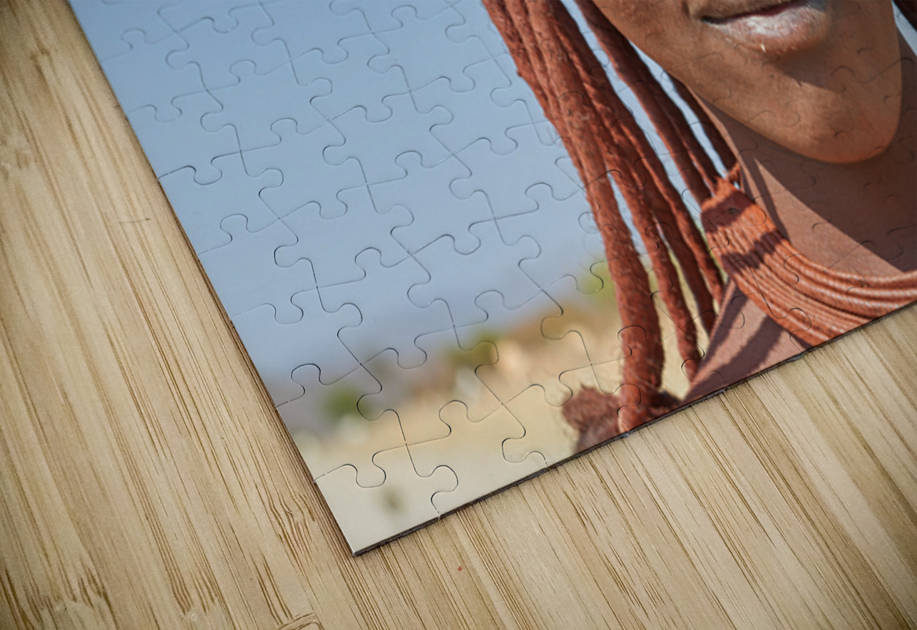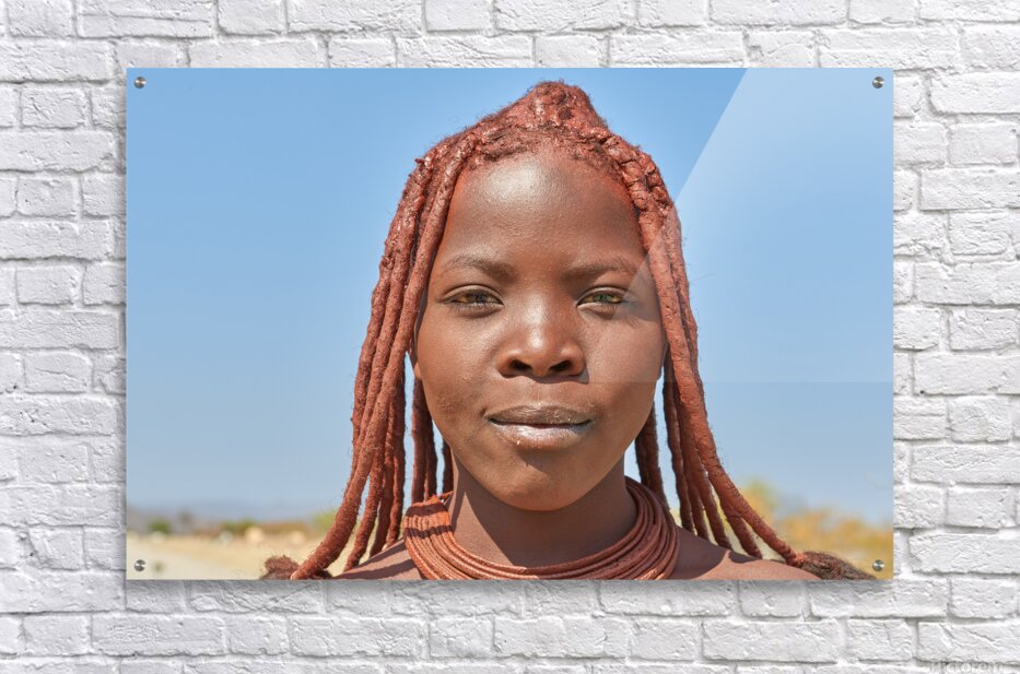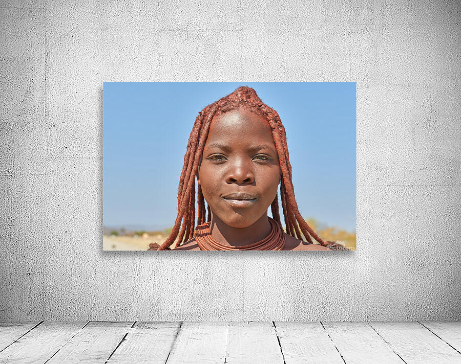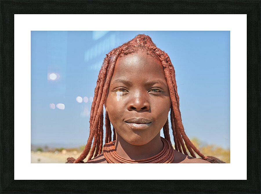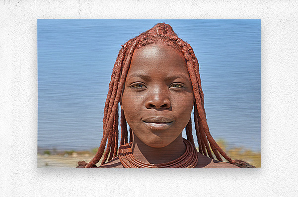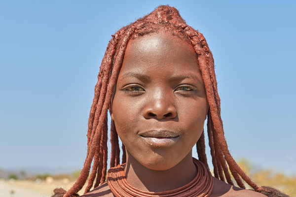 A Himba woman stands in the Kunene region of Namibia. She has traditional braids and jewelry. The setting is sunny and dusty.