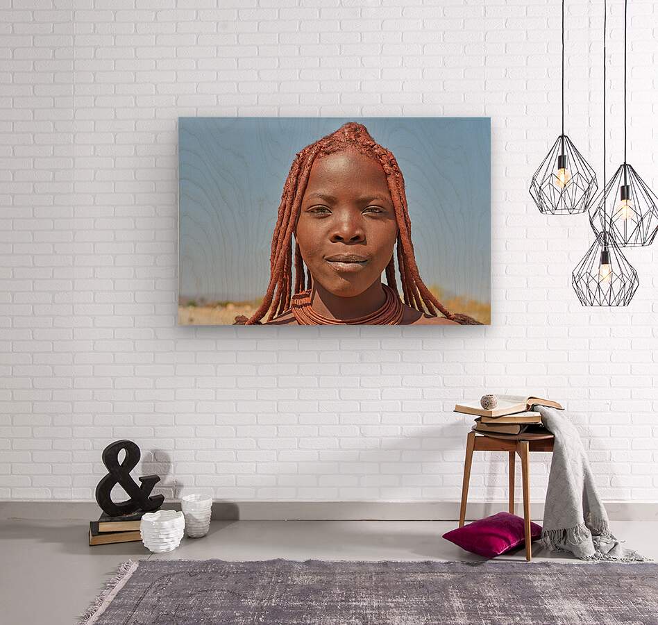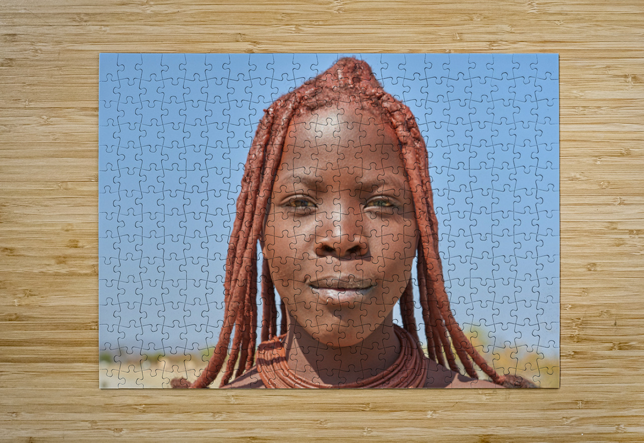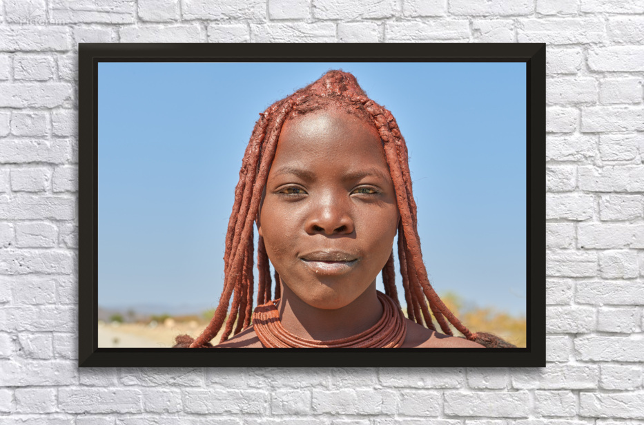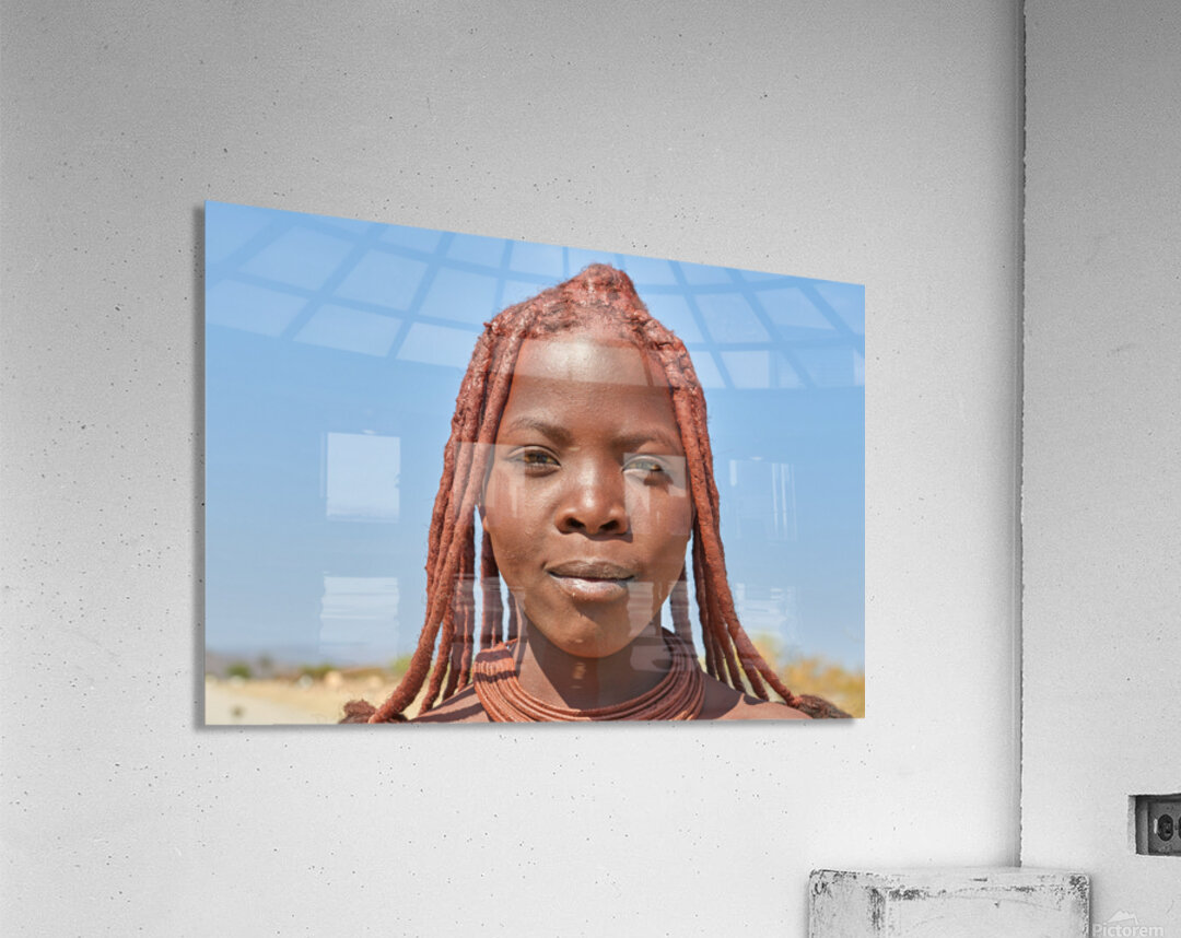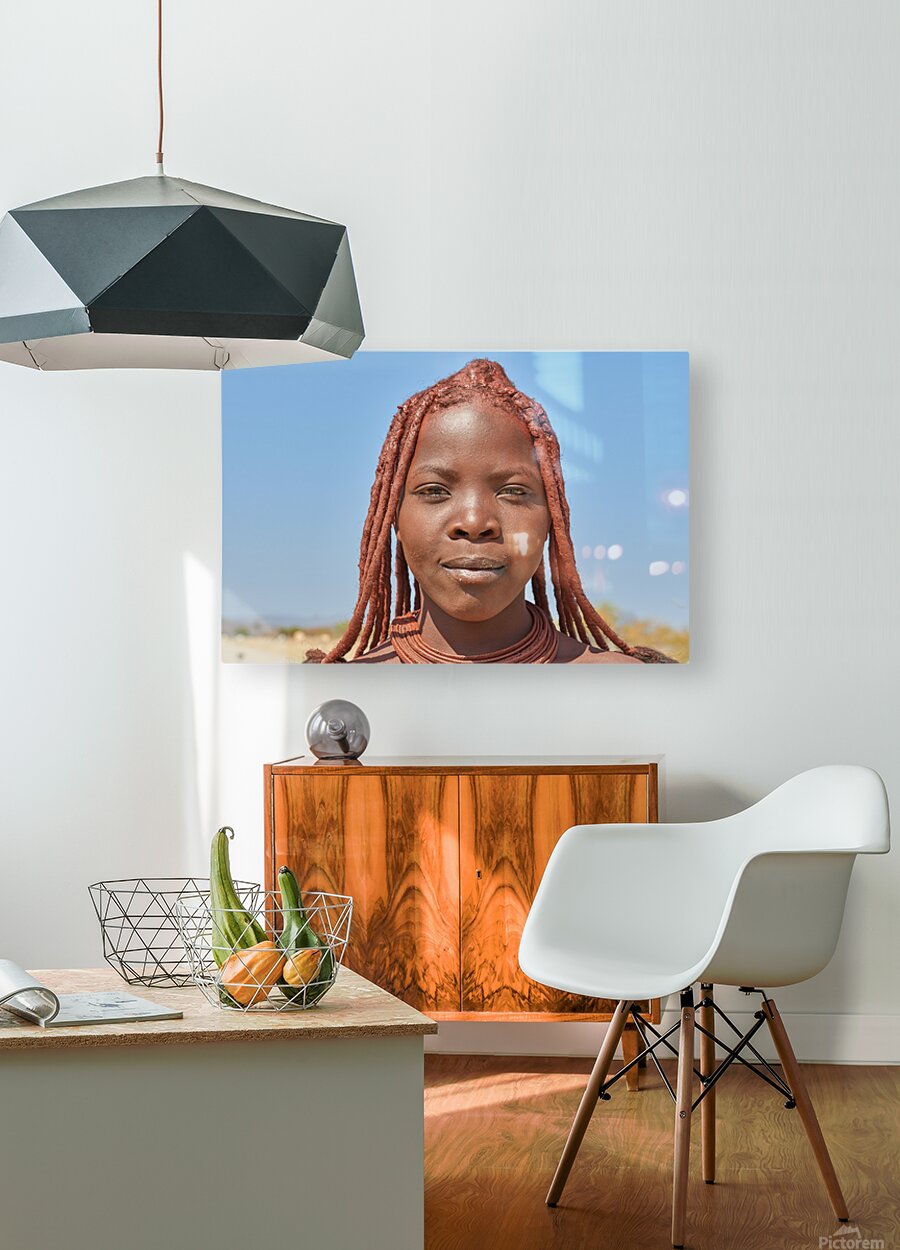 A Himba woman stands in the Kunene region of Namibia. She has traditional braids and jewelry. The setting is sunny and dusty.