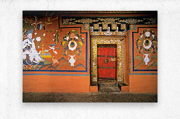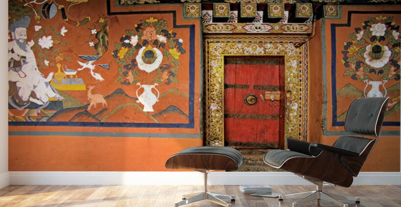 Vibrant mural depicting a sage animals and offerings alongside an ornate red door at a Buddhist temple in the Himalayas showcasing traditional art.