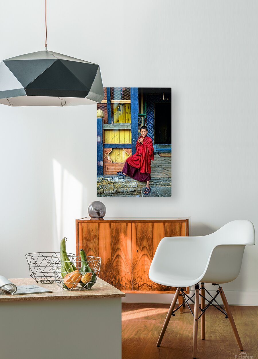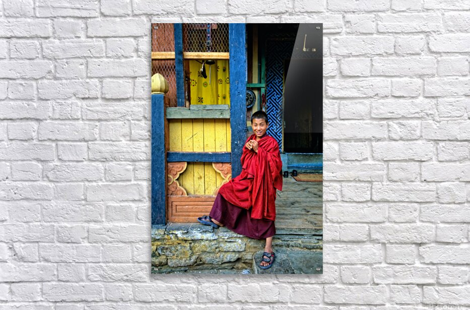 ABOUT THIS ARTWORK: SMILING YOUNG MONK IN RED ROBES AT COLORFUL TRADITIONAL BUILDING